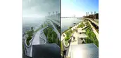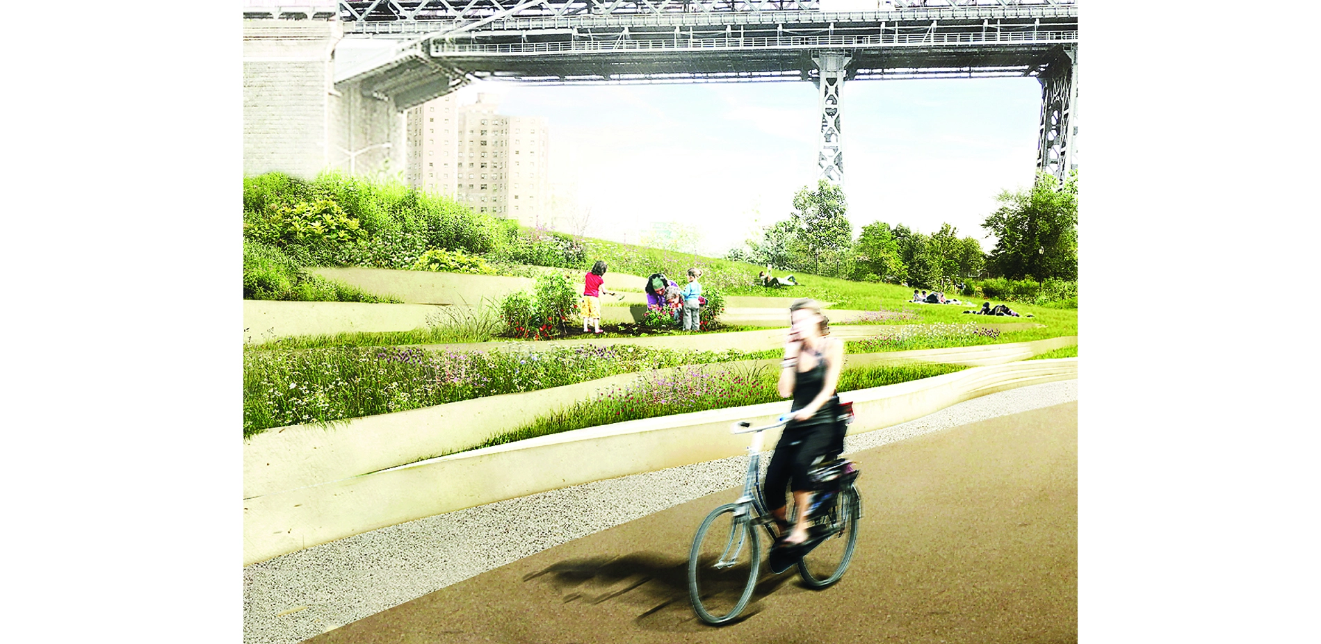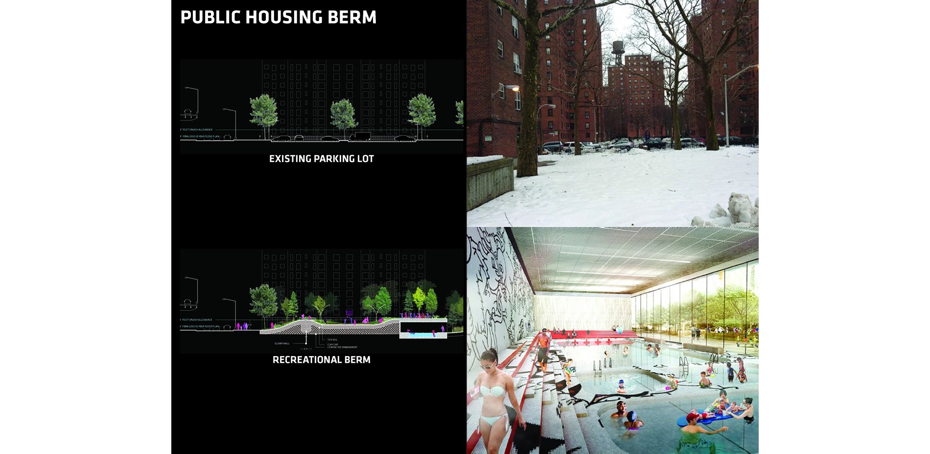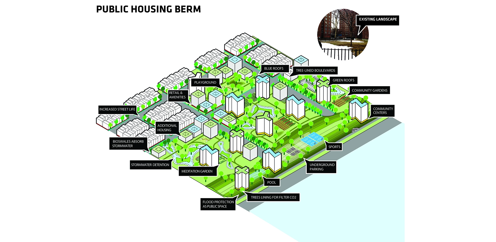 C2 combines a continuous, curvilinear 4-foot bench that spans the Manhattan and Brooklyn Bridges, providing protection during lesser storms, with deployable flood barriers that offer protection against wave action and storm surge. The low-profile bench maintains views to the water and carves out new spaces for recreation, markets, social services, and more. In a longer-range vision for this area, the landscape architect would thread a berm system through presently featureless public housing campuses, turning them into flood-protective landscapes that manage storm water and integrate recreation, agriculture, social services, and economic opportunities.