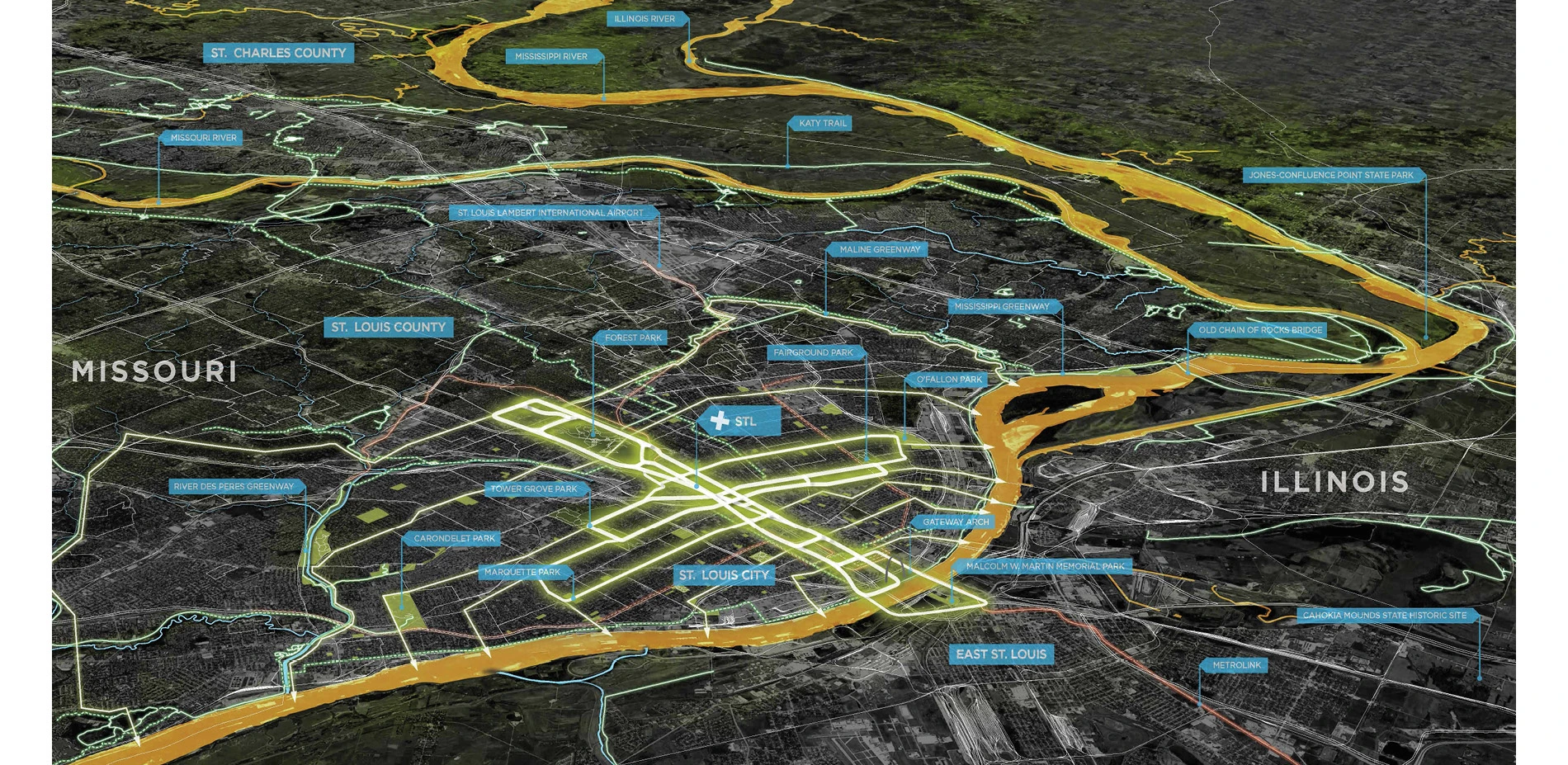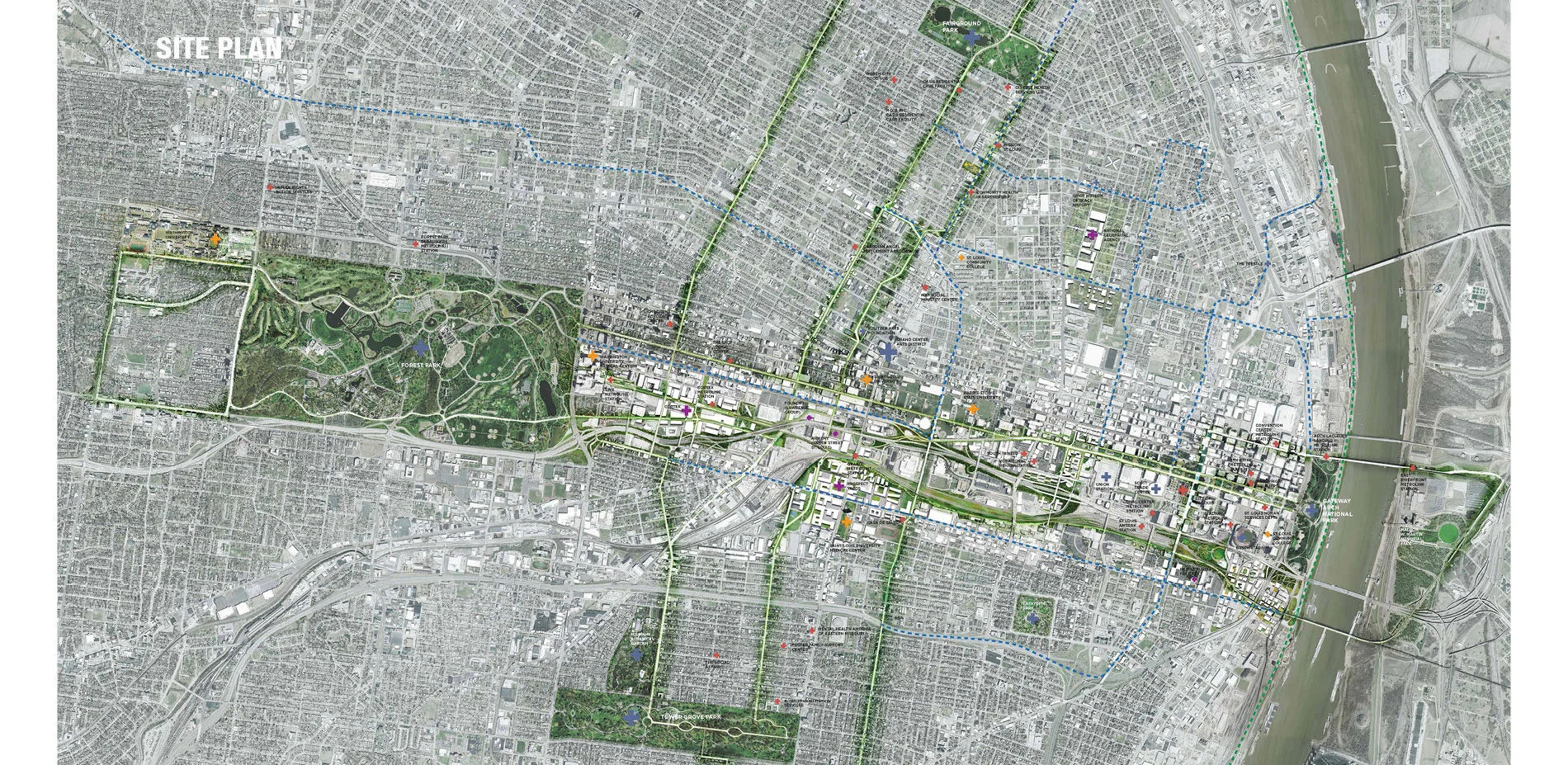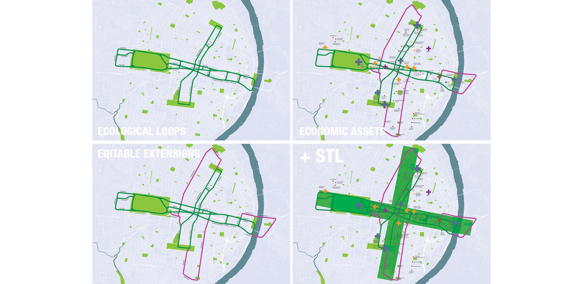 Asked by the Great Rivers Greenway (GRG) to envision an urban greenway in the heart of St. Louis between Forest Park and the Gateway Arch, our masterplan proposal, "+StL", envisions an alternative to the prototypical, resource-concentrating big landscape intervention project. Instead, following in the spirit of GRG's citizen-involved approach to building regional greenway networks, we propose a masterplan that resolves the connective and restorative ambitions at the core while investing in the communities, existing assets, and unique projects underway around this corridor. Our team was assembled on this principle and includes local experts, leaders, and advocates as well as designers, planners, engineers, and advisors with international experience, each committed to a team-wide design and decision-making process. The resulting masterplan proposes concrete measures to address the challenges of equity, public health, and mobility that the city is facing through a layered strategy of three components: Economic Assets, Ecological Loops, and Equitable Extensions. These three dimensions of our masterplan articulate strategies for distributing economic development, introducing biodiverse and hard-working habitats, and planning for equitable access to jobs, institutions, and public space.
