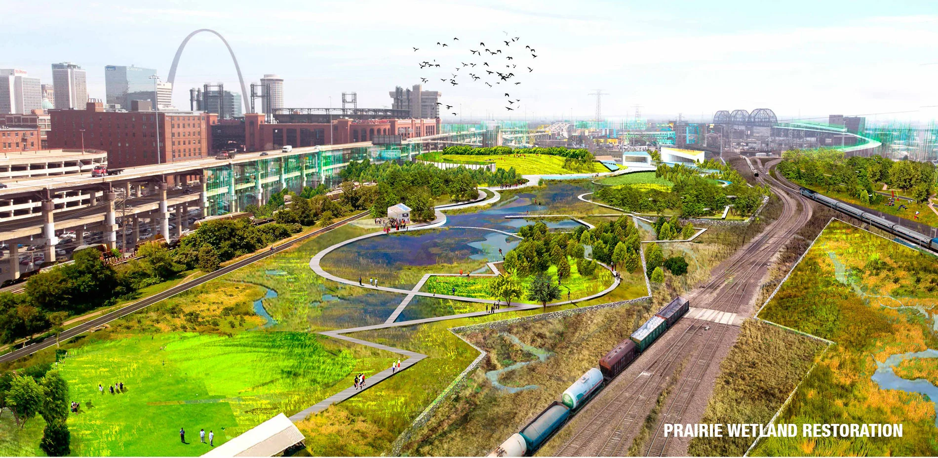 The hydrology of the central greenway was analyzed for opportunities to reduce loads on the existing hard infrastructures. The low railway basin site is topography ideal for intercepting stormwater, thus reestablishing native communities of prairie, woodland, riverside, and wetland. Tallgrass prairie habitat, reclaimed from parking lots and storage yards, will support local floral and faunal biodiversity and provide appropriate habitat for migrating birds. Active urban forest and prairie along the Greenway will provide important ecosystem and cultural services to the St. Louis area. Public interaction with newly visible habitats and species can be explored over boardwalks, trails, and bridges beside wetlands and drainage ways, reducing the barriers that prevent residents from enjoying nature in the city.