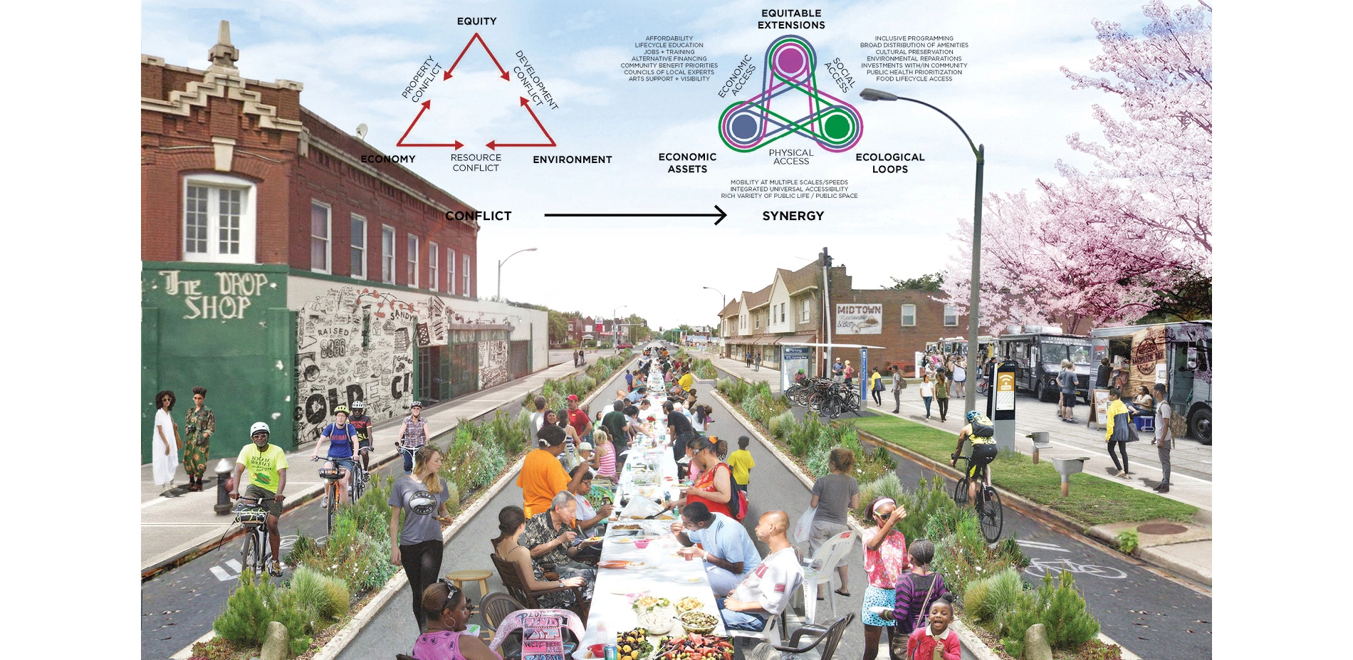 Big urban projects are too often sites of community division. Our meetings with resident and advocacy groups in St. Louis attested to underlying anxieties of displacement, waste, and inequality. A traditional definition of sustainable development attempts to balance environmental conservation, economic growth and social equity, though intractable conflicts between these corners of interest. +StL proposes to reimagine these tripartite responsibilities as catalysts with shared interests, not as opposing interests. Our plan considers three dimensions of access.