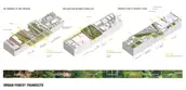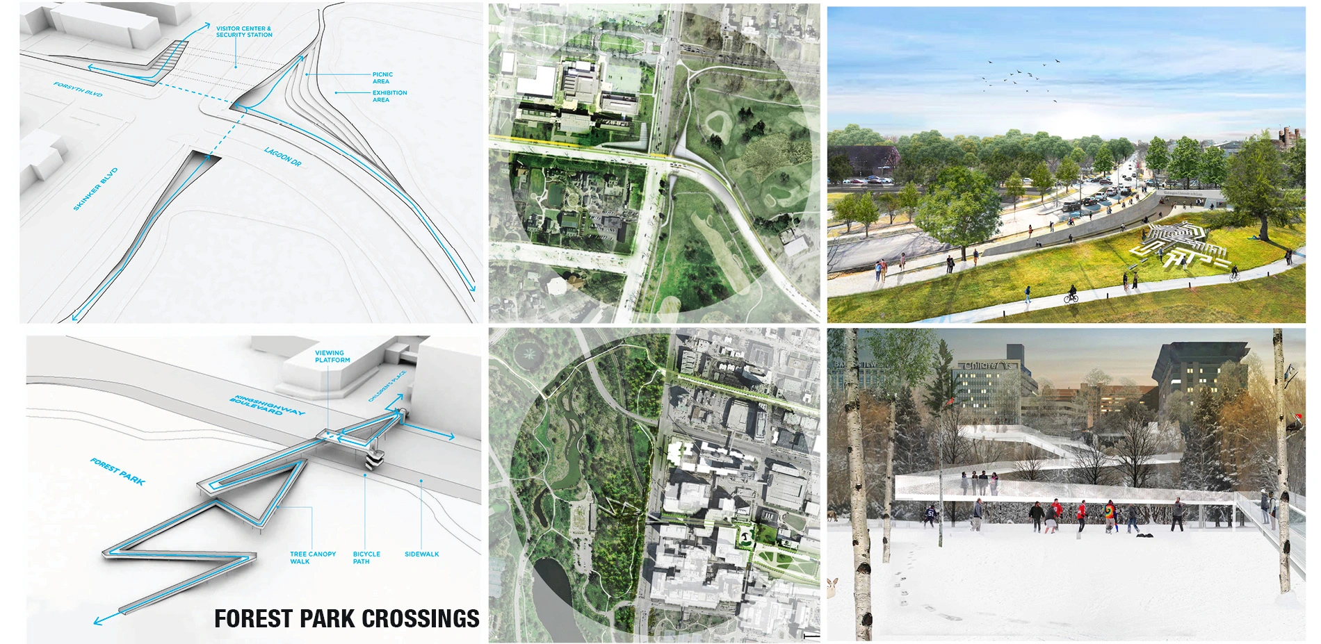 Beyond the low corridor, the Ecological loops constitute the green hydrological infrastructure to expand pervious ground and draw habitat corridors between the four major parks in St. Louis. The West-East route from Forest Park at Clayton Avenue and the Metro-Link line along the Union Pacific Railyard to Chouteau's Landing allows a new experience completely unique to St. Louis integrating ecology, woodlands, streams, and wetland ecologies with St. Louis' industrial railroad. The North-South loops connect Fairground Park, Tower Grove Park, the Missouri Botanical Garden, and the neighborhoods in between them with the central East-West Greenway providing vital neighborhood access and habitat corridors for improved environmental health and biodiversity.