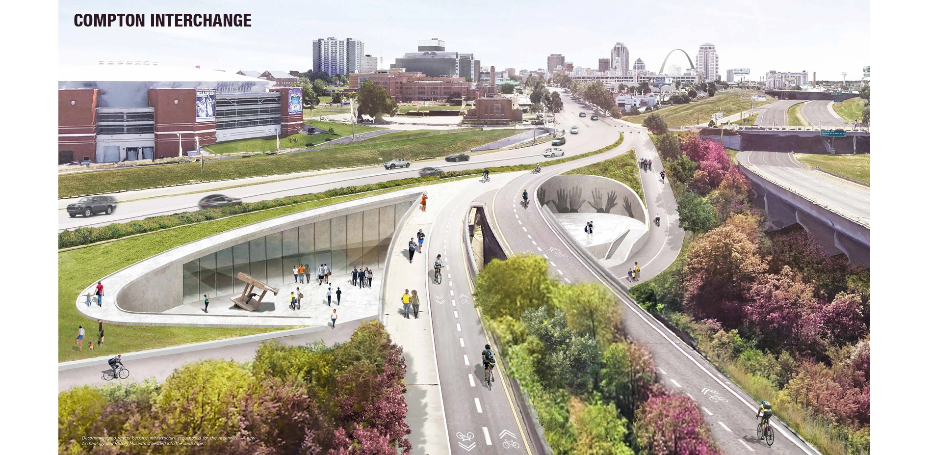 Downtown St. Louis is divided. Today, a shallow valley running east to west from Forest Park to the Mississippi River through the center of the city holds the infrastructure of the 20th century: freeways slip fluidly alongside bundled freight, regional, and commuter rail, each with their attendant interchanges, grade-separations, switching yards, and security. These strands connect the city to its region but create a physical and psychological barrier between the neighborhoods to the north and south. As in so many other cities around the US, this infrastructural void sits atop a neighborhood razed, a riparian ecology interred.