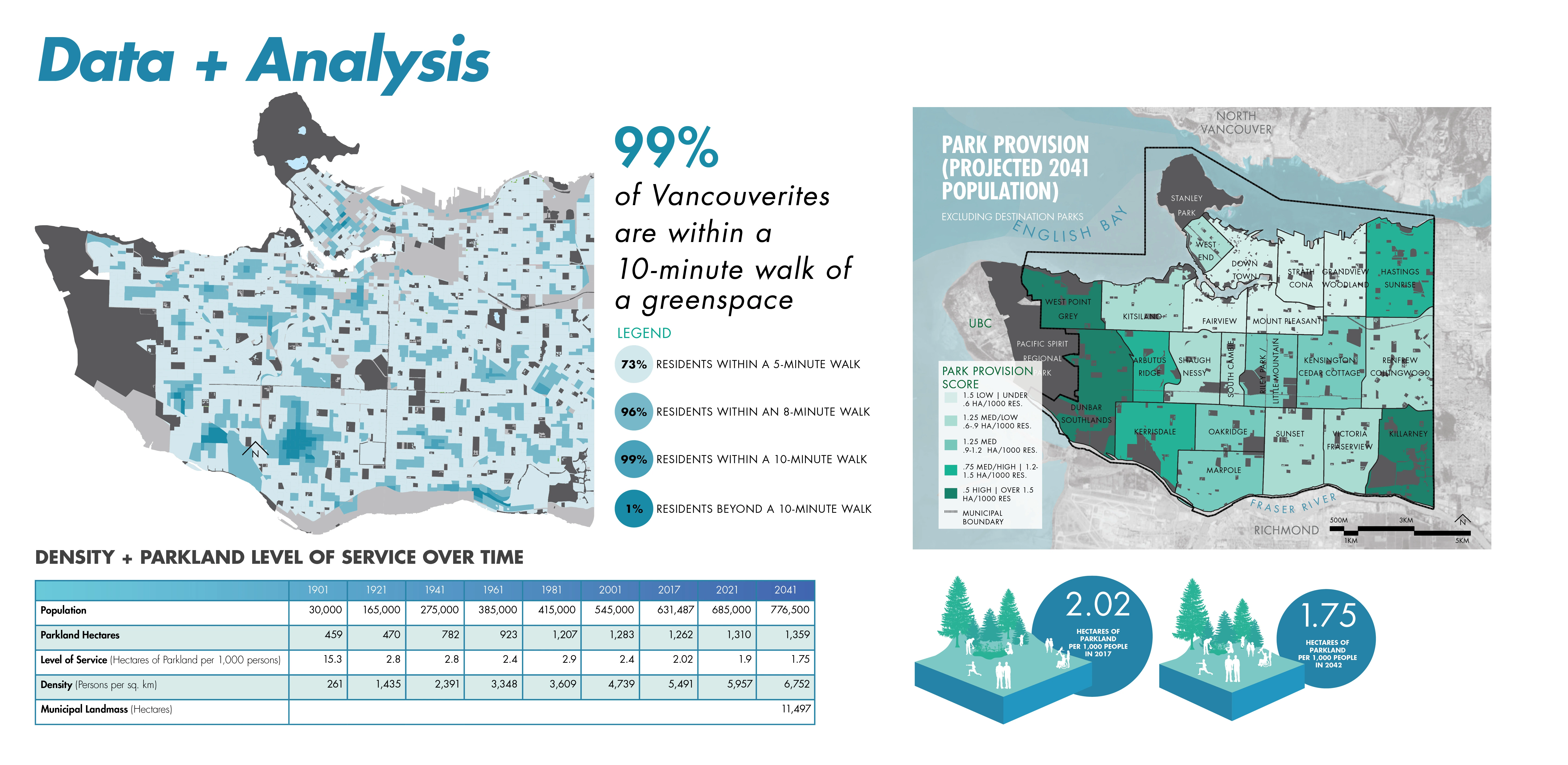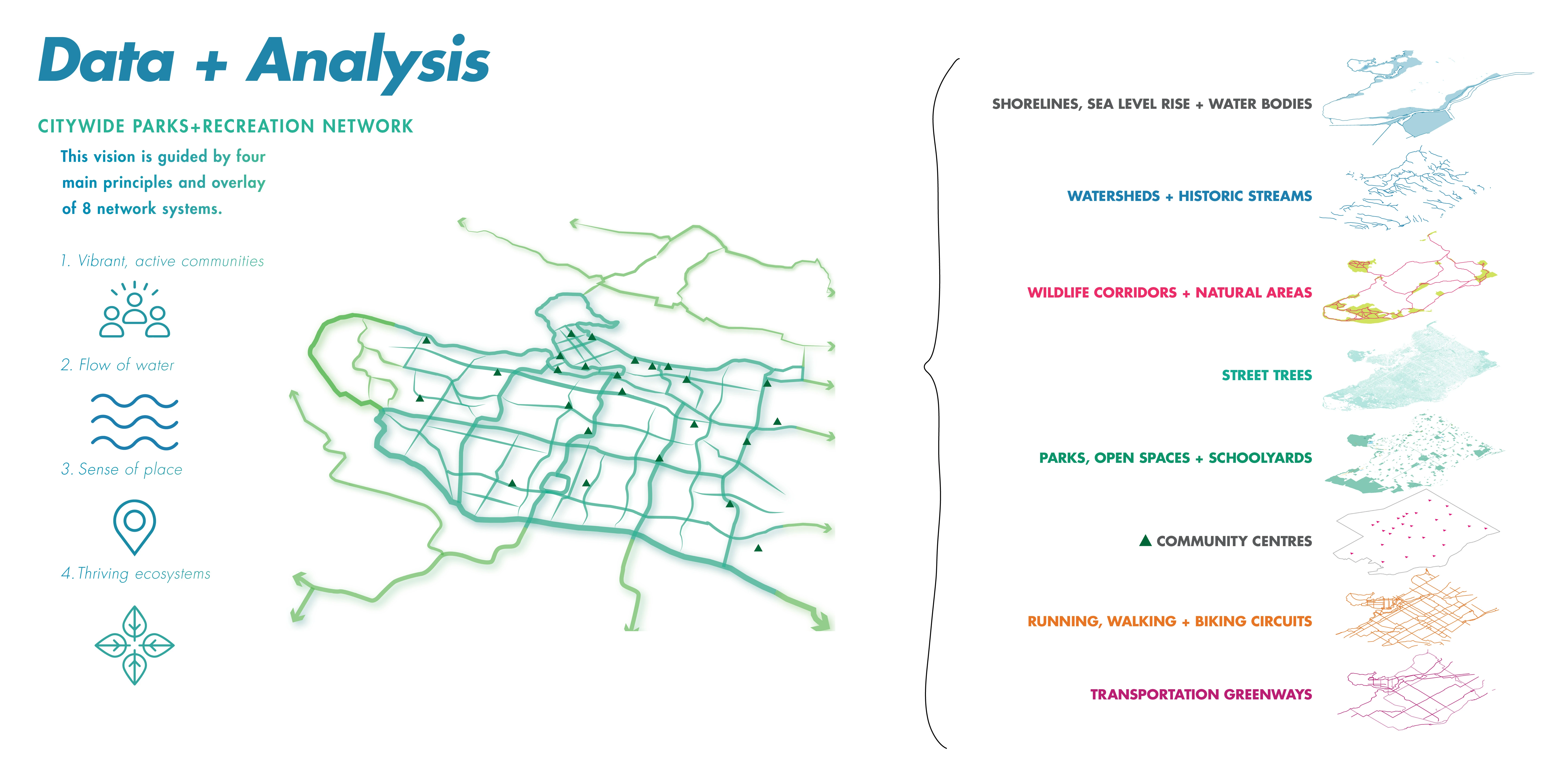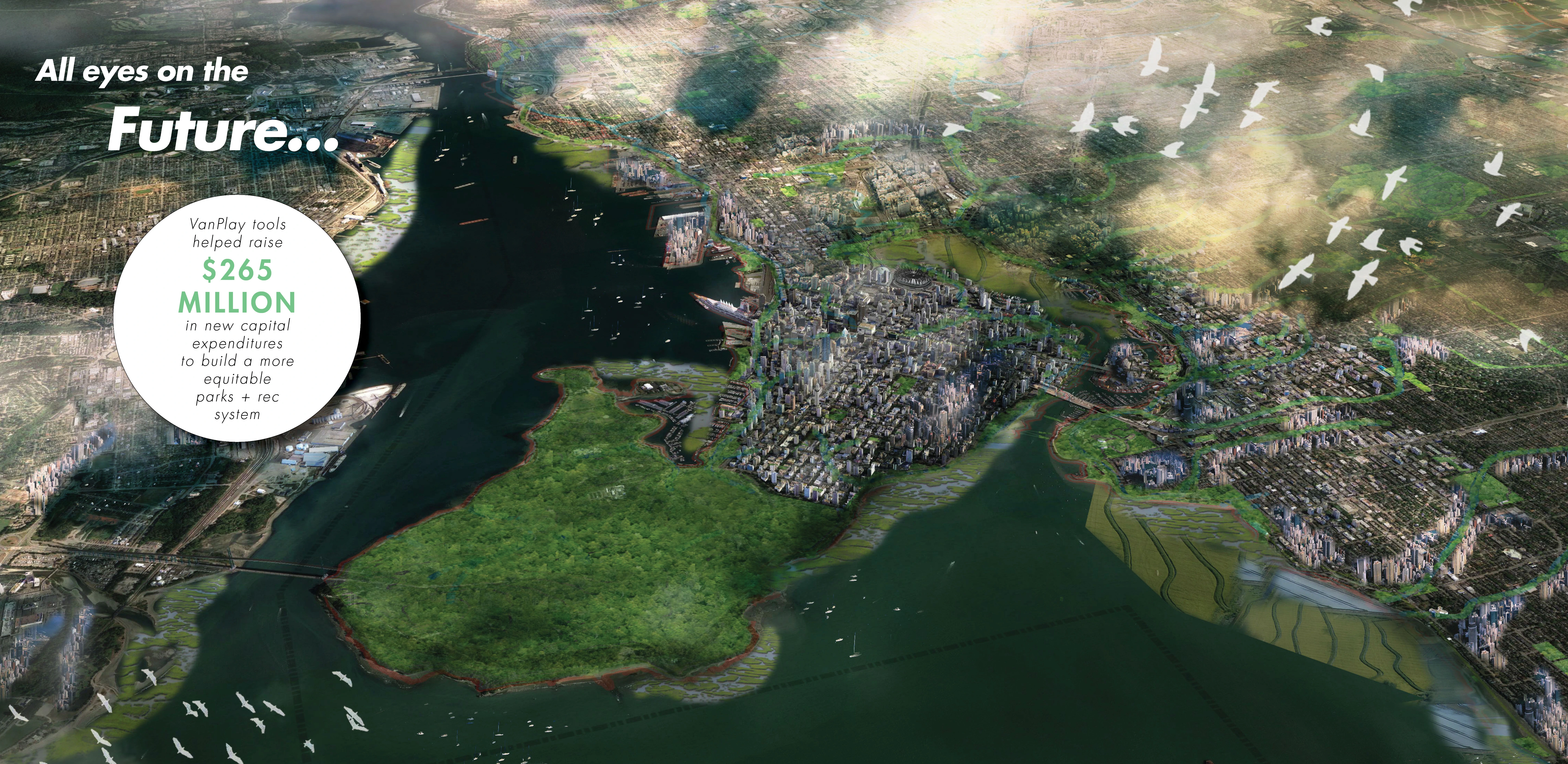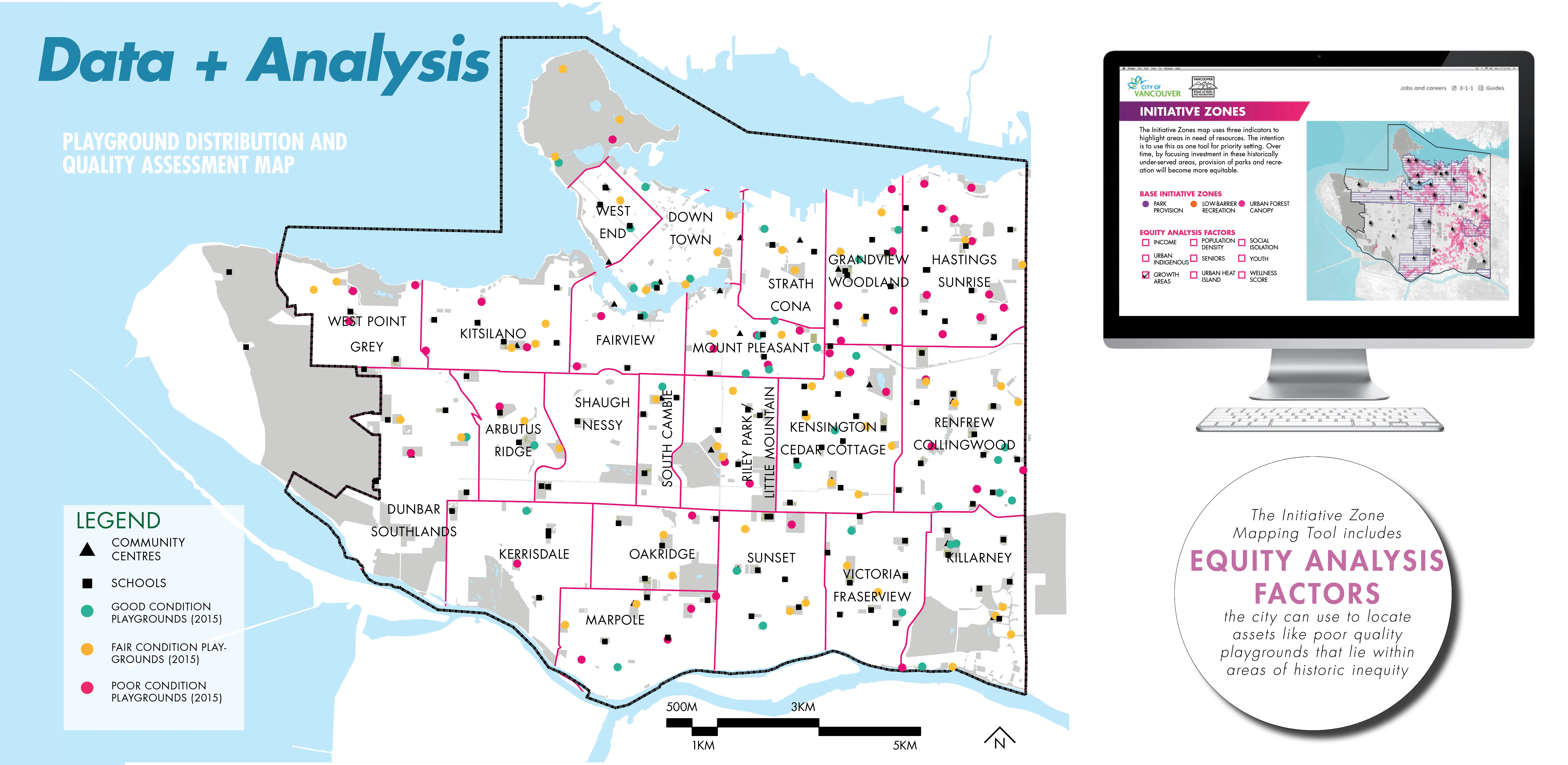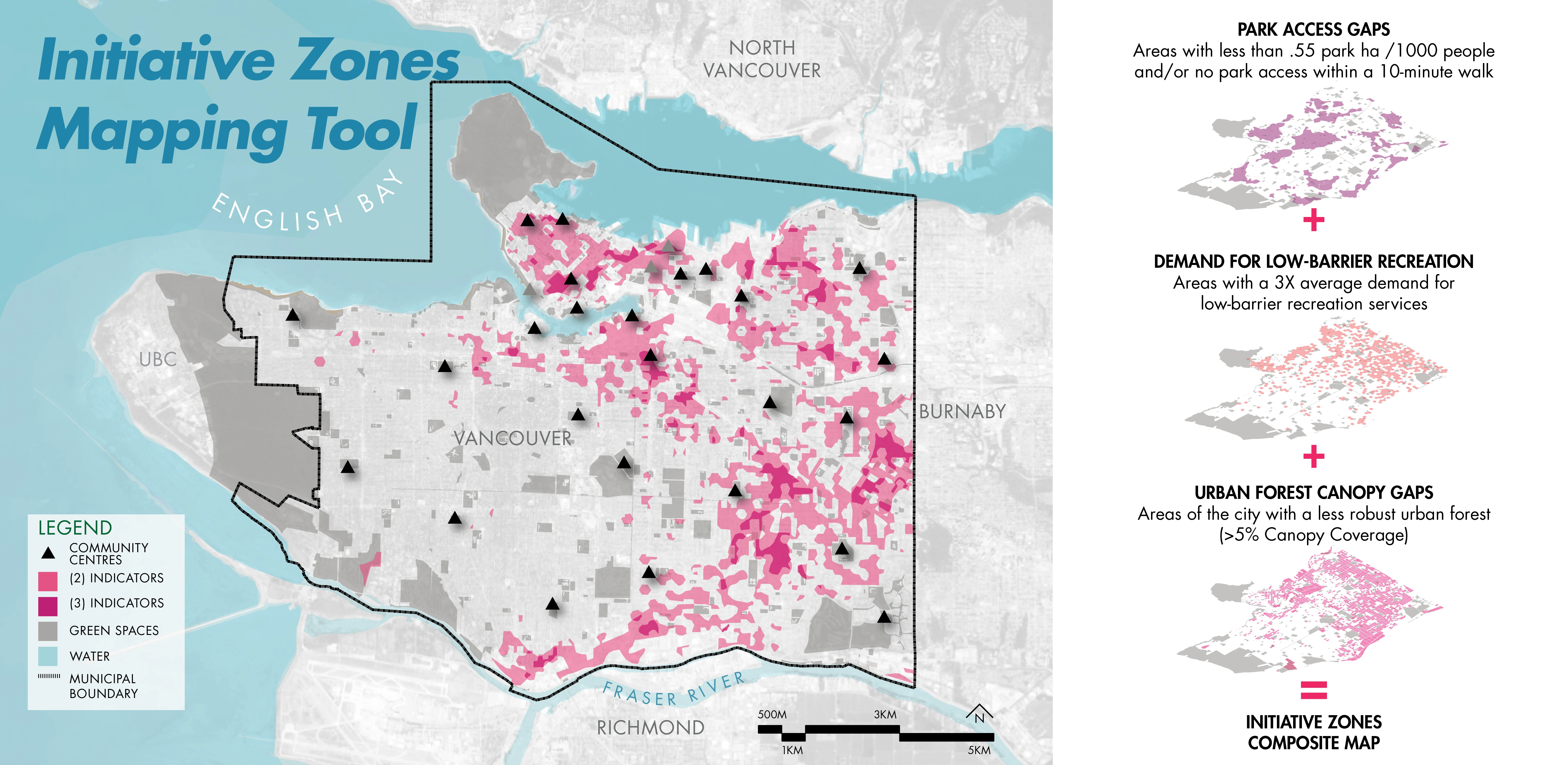 PROJECT GOALS VanPlay is centered around three Bold Moves that support the pursuit of equity, connectivity, and access to parks and recreation for the current population and the 125,000 additional city residents anticipated by 2040. As a 44-square-mile land-locked city, Vancouver would have to add a park the size of Stanley Park (1001 acres) to keep up with the projected densification. Helping to address this future and lift up areas of historic inequity, the Bold Moves include three innovative planning tools: 1. Initiative Zone Mapping Tool highlights areas of the city in need of resources and includes equity analysis factors so that projects, programs, and plans can be focused for more equitable provision over time. 2. Parks and Recreation Asset Target Tool considers quantity, quality, capacity, and distribution of parks, natural areas and recreation facilities in the context of a growing population, deferred maintenance and limited resources. 3. Citywide Parks and Recreation Network Tool conceptualizes a 100-year vision of a seamless public realm to connect places, such as community centers, trail systems and large parks together with publicly accessible waterfront lands that expand access regionally and protect ecosystems threatened by impacts of climate change. SOCIAL DATA AND ANALYSIS SNAPSHOT Each tool addresses a critical question for the future of parks and recreation and is informed by a strong foundation of previous plans and Vancouver-specific social demographic studies. The team conducted rigorous case studies of global best practices for parks, recreation and equity frameworks. Furthermore, a systemwide observation study (System for Observing Play and Recreation in Communities-SOPARC) took place over six weeks and documented how over 18,000 people used parks in neighborhoods of varying income and diverse backgrounds. Using these findings and a recent park provision study, the team considered barriers to access that are not normally accounted for—such as busy street crossings, lack of public transportation, and the price of local recreation programs. HOW DO WE MEASURE AND MAP SPATIAL EQUITY? While 99 percent of Vancouverites currently live within a 10-minute walk of a greenspace, the quality and condition of these spaces vary widely, particularly in low-income communities. The Initiative Zone Mapping Tool uses three indicators which are layered atop one another at a block-scale resolution to reveal areas of the city that have historically been marginalized for provision of park space, recreation opportunity and green, leafy living environments. This inequity is systemic prejudice and has profound impacts on health and well-being, social capital, and economic development. The spatial equity tool introduced in VanPlay is powerful in its simplicity and how clearly it shows the locations of priority areas. The areas of the city with low park space per person, that are less green, and that are screaming out for more recreation opportunities are the places where there are people living in small apartments, who perhaps do not have private outdoor space like a backyard in which to quarantine, or do not have access to shade on a hot summer day and are more likely to suffer from heat stroke. HOW DO WE MEET COMMUNITY NEEDS WHILE PRIORITIZING LIMITED RESOURCES EQUITABLY? North American cities are struggling to keep up with community needs. In Denver for example, it would take over 400 years at the current level of funding to fill in all the missing sidewalks. Complex, long-standing factors, such as patterns of development and investment, often result in an uneven distribution of amenities across a city. The Parks and Recreation Asset Target Tool takes stock of the city’s recreational resources (assets), which include park space, sport fields, ice rinks, and urban forests, to name a few. The tool analyzes not just their location but also their condition, renewal timelines, and considers future needs through goal setting to ensure all Vancouverites have access to excellent amenities. The planning team scoured benchmark methodologies including the Trust for Public Land’s ParkScore system as well as total asset management best practices. Coupled with the Initiative Zone Mapping Tool, the city can now triangulate which amenities need improvements in distribution and quality, and which ones are located in areas of historic inequity. HOW DO WE CONNECT MORE PEOPLE TO NATURE AND STRENGTHEN ENVIRONMENTAL RESILIENCE? The Citywide Parks and Recreation Network Tool conceptualizes places to play, exercise, and socialize with direct and intuitive connections for pedestrians and cyclists of all ages and abilities in and between these spaces, while providing pathways for the movement of urban wildlife and stormwater. Multiple departments collaborated together to understand how this tool could help Vancouver adapt to the impacts of climate change, including a potential 11 percent loss of the city’s landmass to sea level rise, while adding more opportunities for recreation and wellness through the city. Because land in Vancouver can cost into the tens of millions of dollars per hectare, buying the land needed for new parks to balance the rapid growth in population is not possible. For this reason, the Network Tool provides a new conceptualization of recreational space, which includes the whole public realm—streetscapes, tree canopy, schools, rooftops, interiors of buildings—with a call for integrated blue-green infrastructure systems that can provide resilience in the face of climate change and global pandemics. From a public health perspective, this network extends into Equity Initiative Zones and helps connect those communities, which typically experience transportation barriers and public health inequities, with more opportunities for walking and cycling to greenspace destinations as part of their daily lives. 30,000 COMMUNITY CONVERSATIONS Facing a community burned-out with planning fatigu
