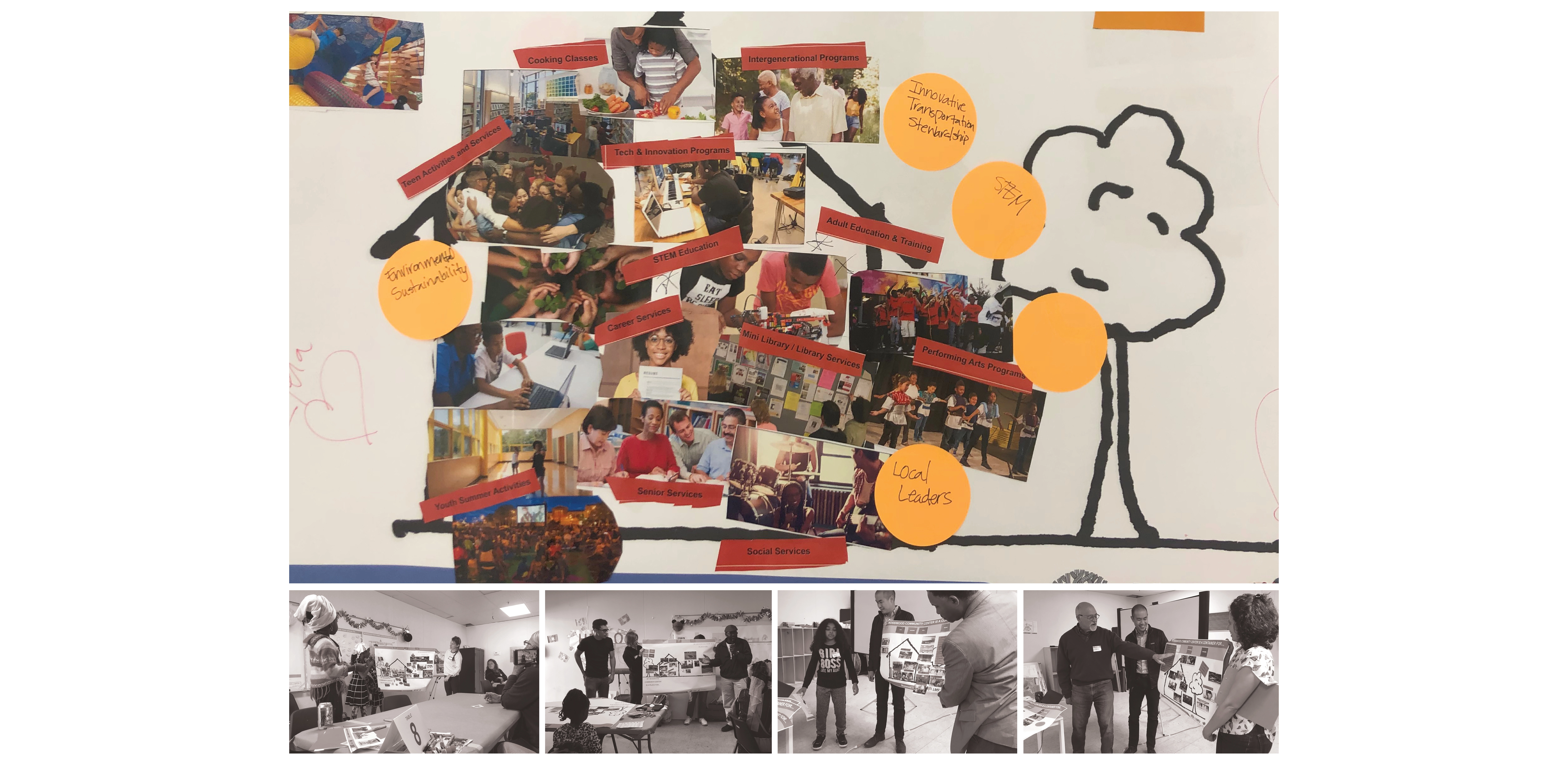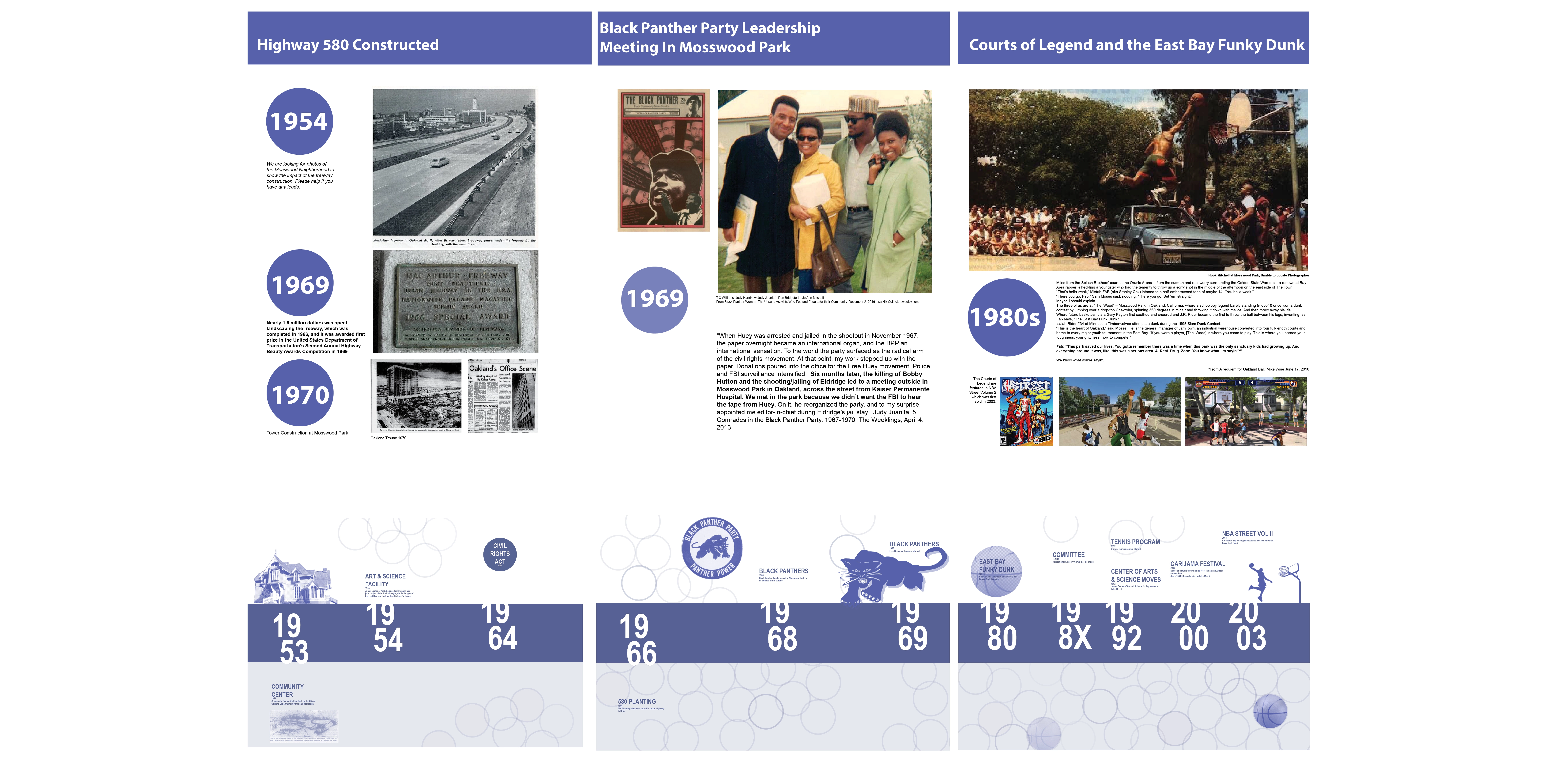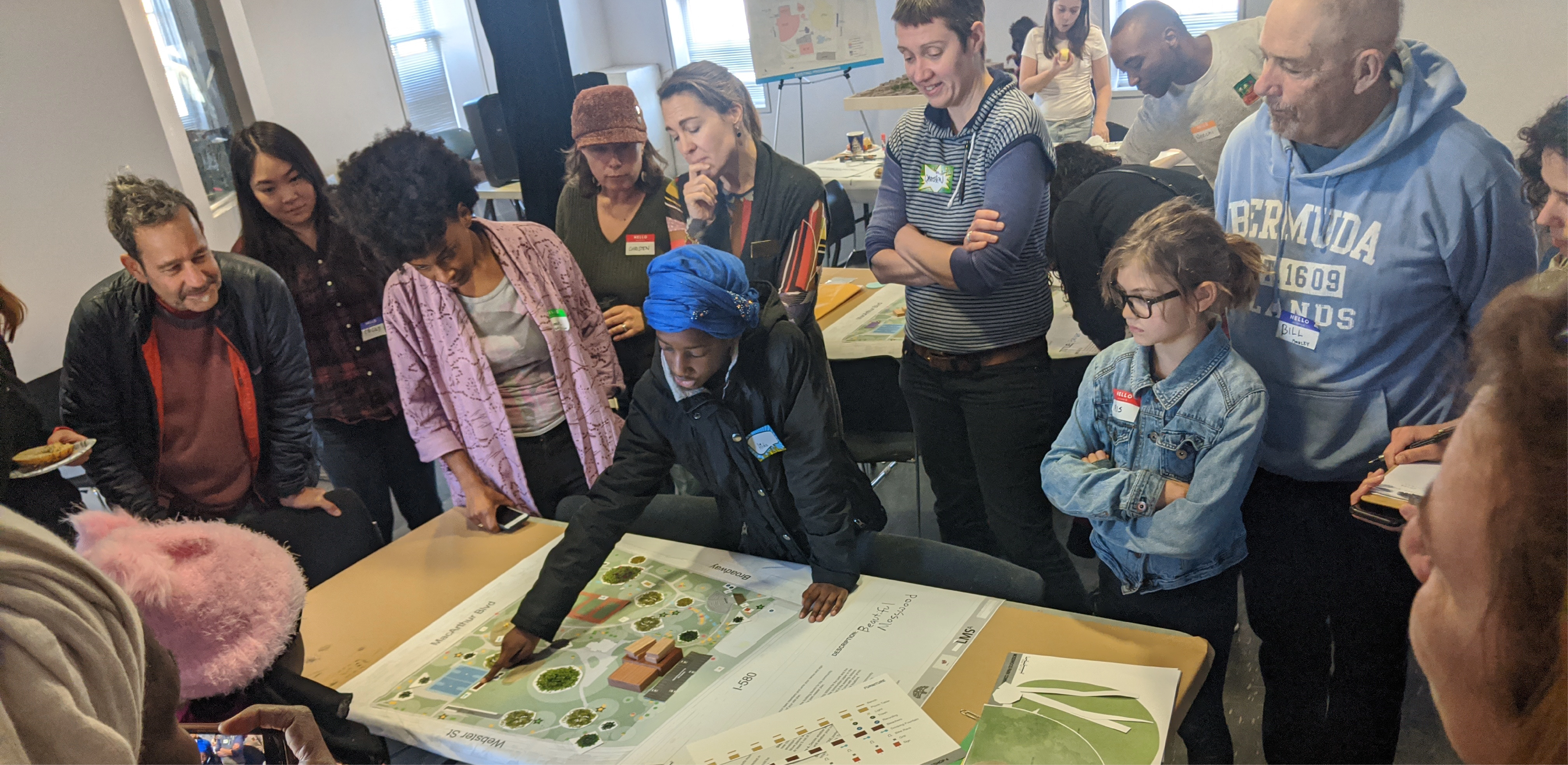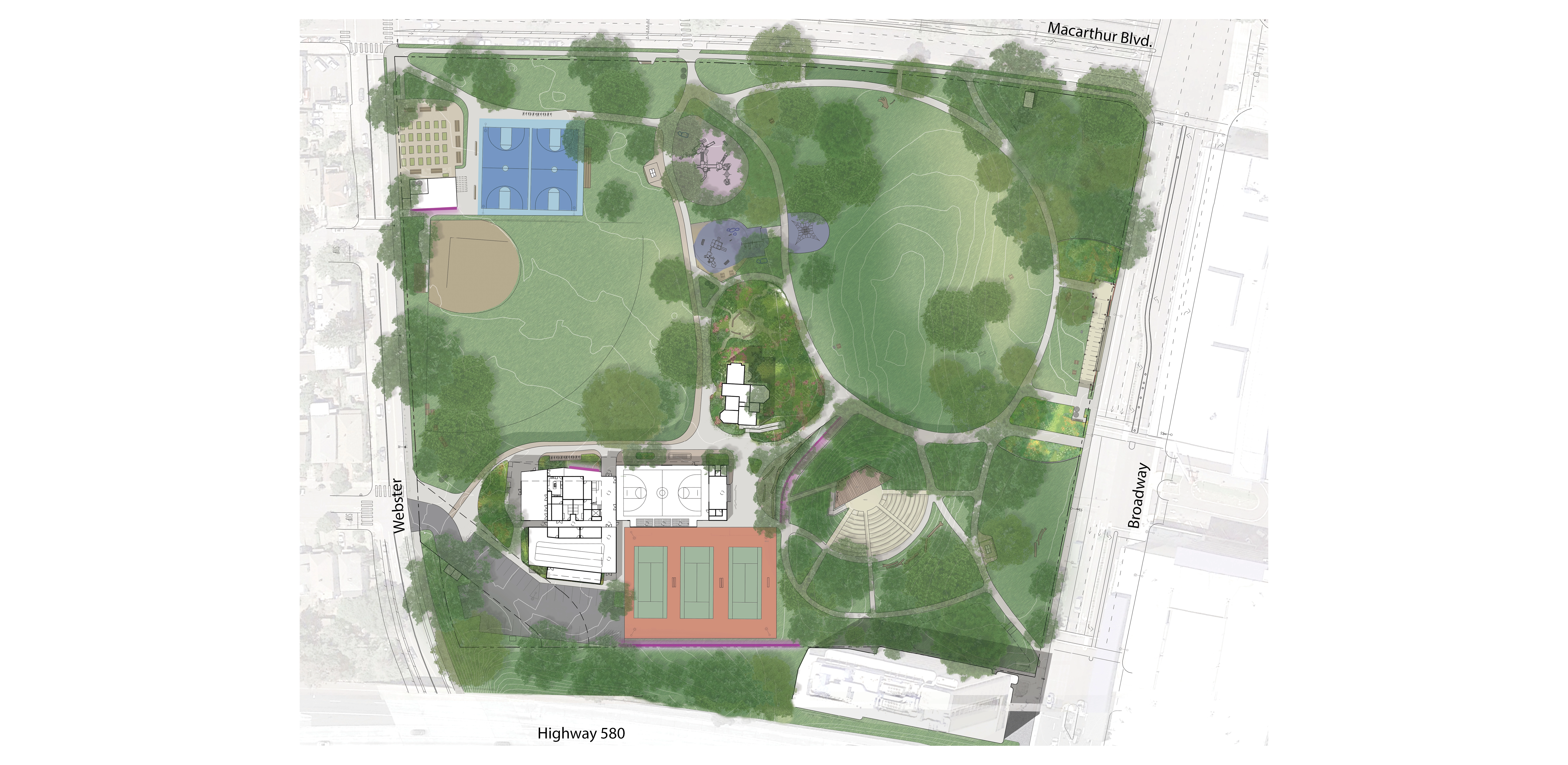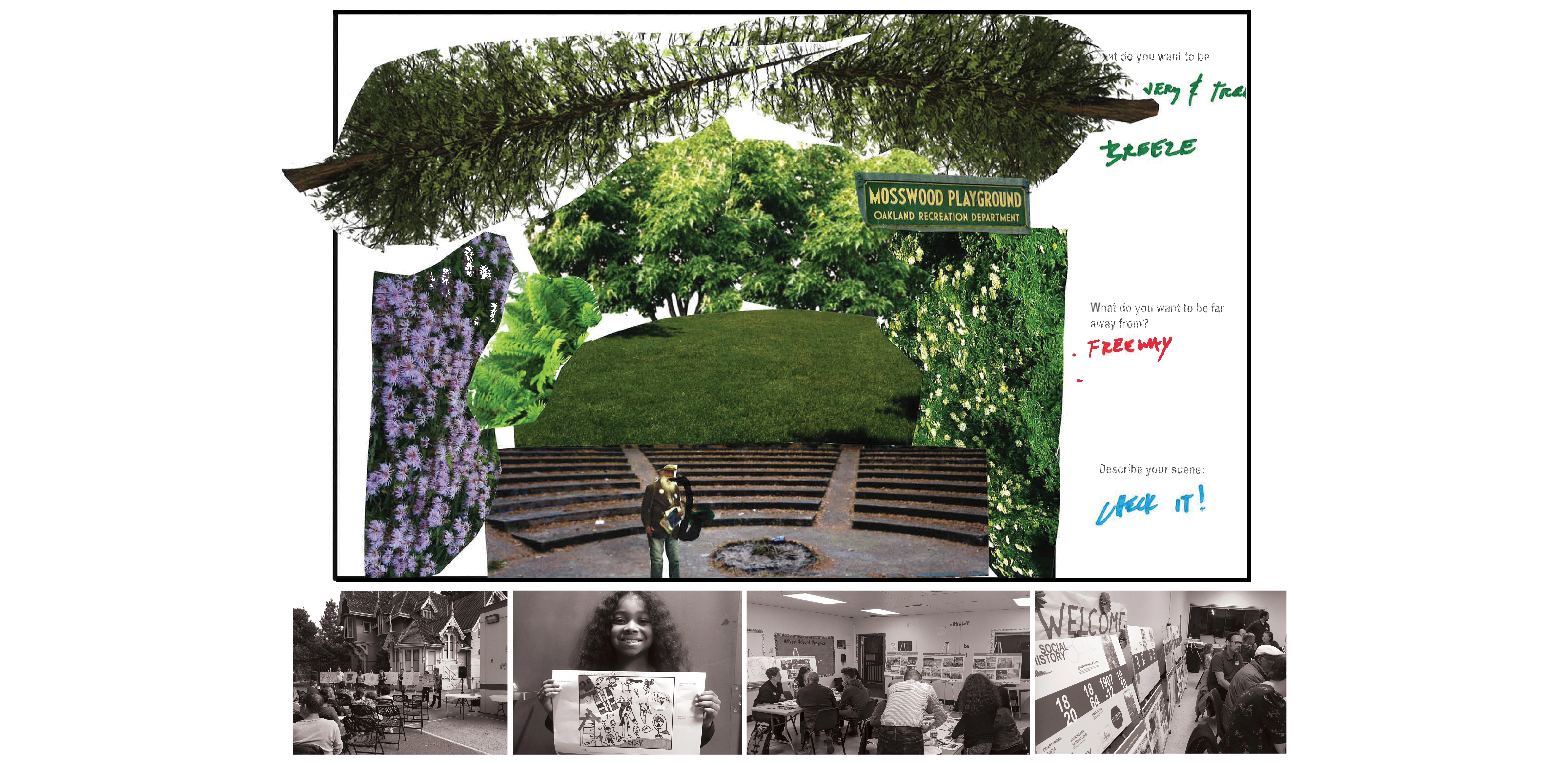 Site History + Project Framework Mosswood Park, located in Oakland, California, is a beloved community park. The Mosswood Park Master Plan began as a deep dive into a more complete history of the park that broadened the areas of historic interest, originally limited to the historic Carpenter Gothic J. Mora Moss House and Estate. This wider reconceptualization of history included pre-Mr. Moss’s ownership, numerous important events and community activities which occurred in the park throughout the 1970s, among other histories. The design team researched the history of the park beginning with the Ohlone people and the importance of the ecology of the creek that is now covered over. The team also reviewed the post wartime parks and recreation history at the site and the original conception of a community center at the Junior Center for Arts and Science. The center served all kids and had a curriculum focused on creativity, a precursor of today’s STEM and STEAM programs. Despite disruption of the park with the construction of highway 580 in 1954, Mosswood Park remained an important center for the African American community who exhibited resilience as gradual disinvestment in the neighborhood occurred. This deep dive into many eras of history and many different stories of the park resulted in a framework where the “Historic J. Mora Moss House” and the famous basketball Courts of Legend were both considered of equal importance in park history and numerous other smaller social events that together show social resistance and resiliency by marginalized groups were also considered of great value. Our team’s research reinforced the idea that although gentrification has changed the racial and economic make-up of immediate neighbors to the park, the site remains a place to protect, strengthen, and center culture for many black, indigenous and people of color communities (BIPOC) and as such, the propinquity of new generally wealthier and whiter neighbors would need to be balanced in planning for the future. Therefore, one of the goals of the Master Plan community engagement process was to give a voice to the older generation of Mosswood residents and their families, particularly the Black and African American communities that have a deep connection to the park but have been displaced over recent years to other parts of Oakland. Community Based Design A year-long process of workshops and community engagement was implemented by a grant application. The schedule necessitated moving quickly and required the community’s willingness to engage often during the year, a keystone to the success of the outcome. Prior to the start of the workshops, the design team attended events that extended a more personal invitation to marginalized groups. A total of six workshops were led at the temporary community center within the park and nearby Studio One Art Center. Developing high quality graphics for communication with the public was one way the design team expressed respect for the community members. The design team created a timeline which they called “The Incomplete History of Mosswood Park” that documented many different moments in the history of the land. The graphic included a board for ‘future visions of the park’ at the end of the workshops where community members expressed their hopes and dreams and imagined a future they would want to see at the park. This collective imagining of a shared future was a starting point for understanding what was working and beloved in the park, what was missing, and what could be changed. Tools for gathering ideas for the park’s design and a deep understanding of the site were created in numerous formats including: mapping with tape, individual collages of scenes in the park, group collages showing what people wanted to see at the new community center and surrounds, and site walks where spontaneous sharing of memories were layered over the design team’s recounting of important site stories they had learned about while researching the park’s history. Synthesizing community ideas into graphics, the design team also provided their expert knowledge about the trees, geotechnical conditions of the site, and the sizes of different site elements the community wanted in the park. A design challenge (with a few rules to protect important historic resources, including the mature trees) was explored by small teams. Wood blocks carefully cut and sanded from the most common species of trees found at the park—Oak, Redwood, and Catalina Cherry--were used as scaled building blocks that could be placed on site plans for study during discussions. Three primary locations for the new community center emerged from the community’s ideas and the design team refined each of these locations into schemes that further explored overall site organization. The community provided input on these three schemes which were presented in physical models, digital model views, and site plans. Stations for sustainability, history, and other important topics were set up for input on each of the three schemes. With remarkable consensus, a single location emerged from review of the three design options and was subsequently incorporated into the recommendation for the master plan. The final design was presented at a final workshop and posted to the city website for review. All comments were then addressed and the final master plan was published and approved in February 2021 by the Oakland City Council. Racial Equity Design Goals Working within a historically black community, with the knowledge that safety for black, indigenous and people of color communities (BIPOC) in public space has been severely lacking for a long time and is overdue to be addressed, the City of Oakland and the design team made a commitment to act on closing these disparities in the Master Plan document. The built environment has the unique responsibility to manifest values and close disparities by broadening windows of op
