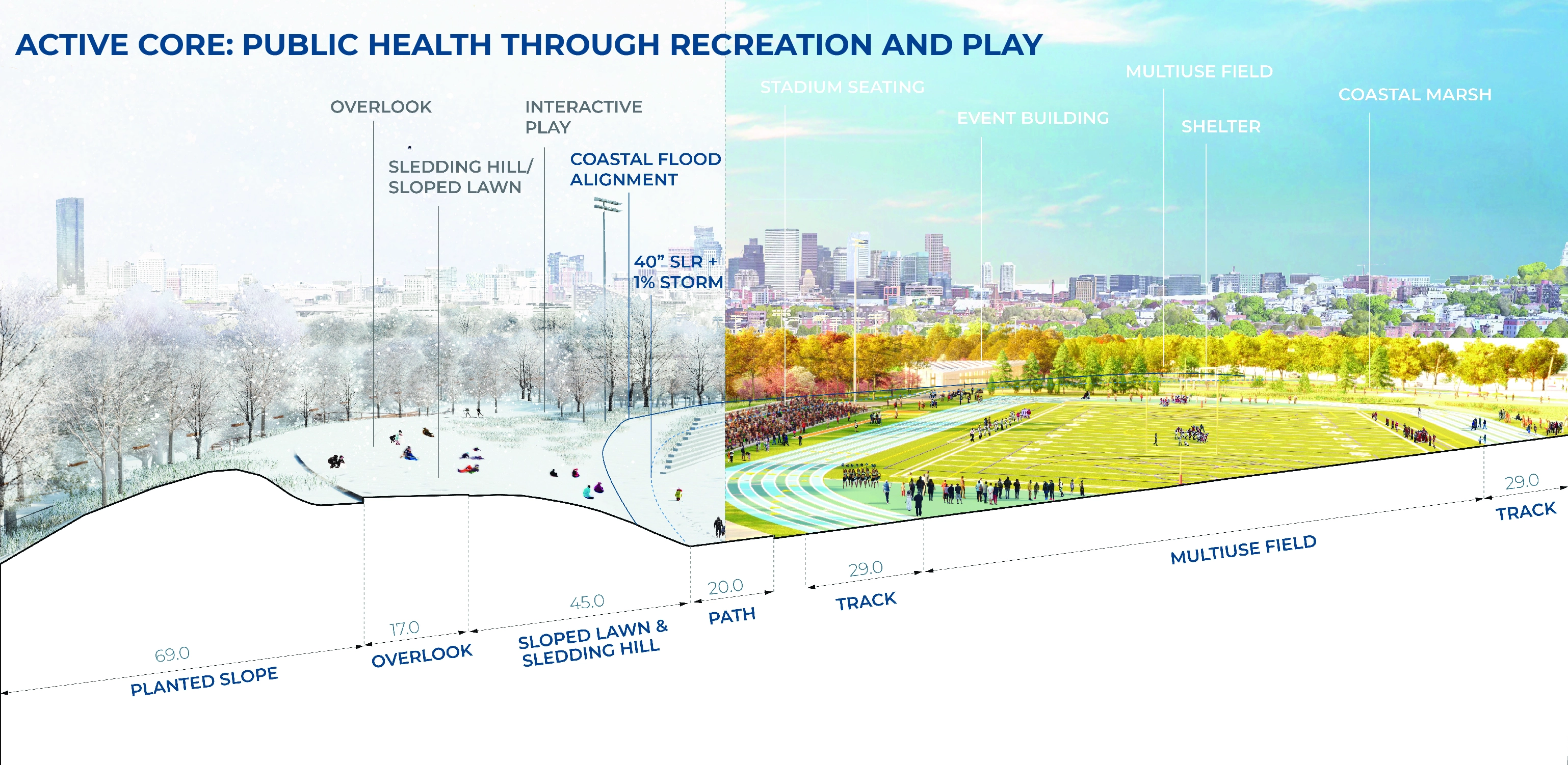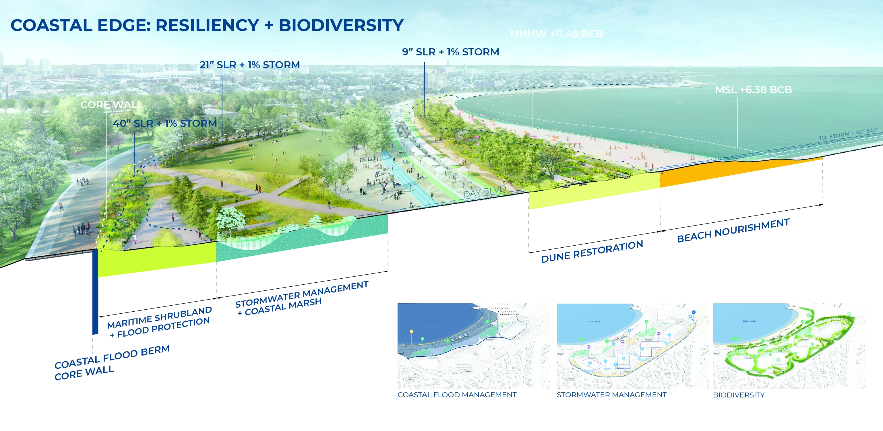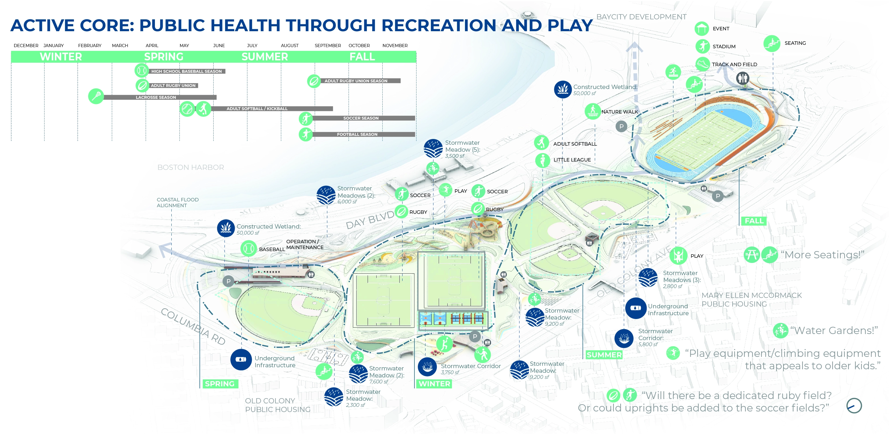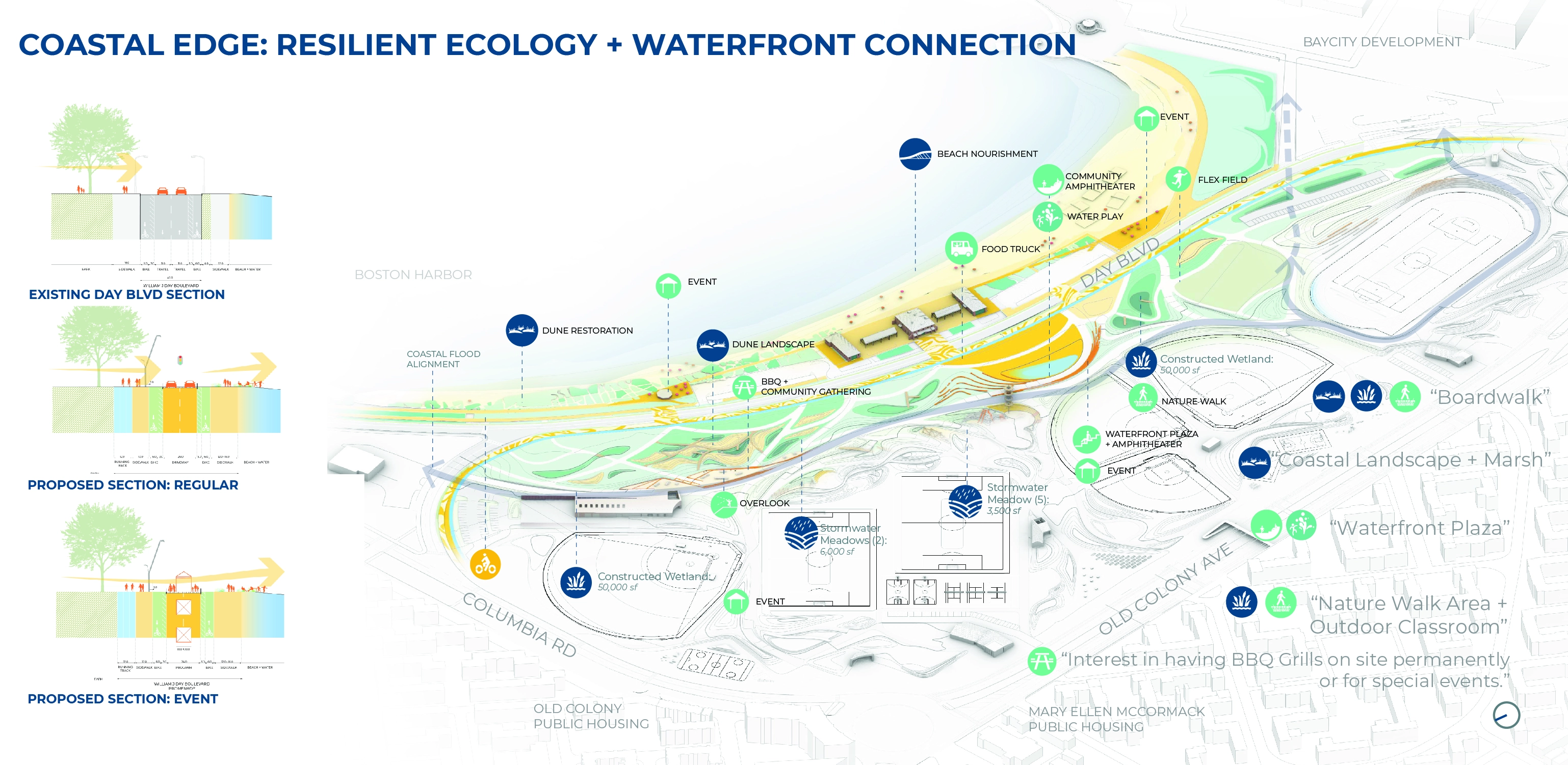 The reimagining of Moakley Park represents Boston’s greatest open space investment since Olmsted’s Emerald Necklace. As the city transforms its relationship to its Harbor–rediscovering it while simultaneously preparing for sea level rise–Moakley will play a key role as Boston’s largest waterfront park, and a new link that connects the Necklace to the Harbor. The plan responds to pressing needs by addressing climate change, biodiversity, inclusion, and access. The future park will be a resilient open space that protects residents while connecting Boston to its greatest natural resource, the Harbor. The renewed and reprogrammed park will serve a broad audience from the immediately adjacent neighborhoods of Dorchester, Roxbury, and South Boston, all of which are currently lacking in open space. Accessible by transit, Moakley Park is also poised to become a beachfront destination for all Bostonians, in a city where everyday interactions with the waterfront are rare. In addition, the park will form a resilient buffer between Boston Harbor and two major public housing developments, Mary Ellen McCormack and Old Colony Houses, protecting these from flooding for the coming decades. As the surrounding neighborhoods gentrify, the preservation of these complexes will be essential to maintaining a diverse community at the heart of the city. Within this context, thoughtful and inclusive communication and engagement were essential to the planning process. The team also chose to prioritize design strategies that will attract the broadest possible audience to the park and serve the needs of diverse residents–sending a clear signal that the park is for everyone. Stakeholder and Community Involvement The goal of attracting new and diverse users to the park was a major driver of the public engagement process. The team formed critical partnerships to expand reach, including with the non-profit Boston Harbor Now, as well as community leaders representing organizations such as the South Boston Neighborhood House. Prior to COVID-19, the foundation of the engagement strategy was Community Open Houses and on-site events, including ‘Discover Moakley!’–a daylong community event organized to bring fun and energy to the park with local vendors, an activated street, and booths for community input and resiliency education. These efforts were amplified with digital and physical surveys, one-on-one interviews, and mapping activities; this allowed the team to initiate conversations with community members about how the park is used, and better understand their hopes for its future. The pandemic demanded a rapid transformation, pushing the team to generate ideas that in fact expanded the reach of the effort, using strategies such as online surveys, virtual tours, and interactive video meetings. To increase the impact of the plan, the design team also initiated a set of topical meetings focused on climate resilience and economic development to coordinate with ongoing efforts of others working on adjacent properties. These included conversations with developers currently working on the adjacent redevelopment sites at Mary Ellen McCormack Houses and Bayside Expo Center; stakeholders such as UMass Boston, the Massachusetts Department of Conservation and Recreation, and the Boston Planning and Development Agency; as well as other consulting teams working on City-led plans for nearby Morrissey Boulevard and Climate Ready Dorchester. Feedback directly informed the park design–from the number of ball fields, to the location of event spaces, to the types of programming located along the park edge closest to local residents. After hearing concerns regarding the City’s ability to maintain amenities, a monthly park clean-up was initiated by Boston Harbor Now, Parks staff, and the design team. These early efforts have already been met with appreciation and even participation by some volunteer community members. Climate change, resilience, and sustainability Originally a salt marsh and mudflat, Moakley has been unofficially used for recreation since 1909 when it served as first a garbage dump and a playground. Filled in 1919 with harbor-dredged clay, the site’s flat, impermeable soil already presents problems today, as mild rain events often cause flooding and leave recreational amenities unusable. To address infiltration issues, the plan proposes to incorporate green infrastructure strategies across the site, including stormwater meadows, corridors, tree trenches, and porous pavement. The park’s existing flood issues proved to be a useful entry point for the design team in communicating the need for long-range flood protection and stormwater management to the community of current park users, who have already experienced their impact. On a longer-term timeline, sea level rise projections predict a 21-40” water level increase in Boston Harbor within 50-60 years. At the top of this range, floodwaters entering through Moakley in a 100-year storm would join two other flood pathways, not only inundating the adjacent housing complexes but also sending water deep into Boston’s South End. The plan proposes an engineered flood-protection wall which is embedded into the park’s topography and programming such that it doesn’t cut the community off from the waterfront–for instance, one segment of the wall serves as an amphitheater seating space with views to the water. At the coastal edge, restored dunes will soften the impact of wave action and provide essential habitat. This coastal edge is an exciting and challenging landscape, forcing the team to consider successional growth, rising groundwater, and saline inundation over time. It also presents an opportunity to increase biodiversity: the plan proposes introducing over 500 new trees that will contribute to heat reduction and the health of Boston’s urban forest, alongside a mix of native plants including coastal marsh species, maritime shrublands, and woodland