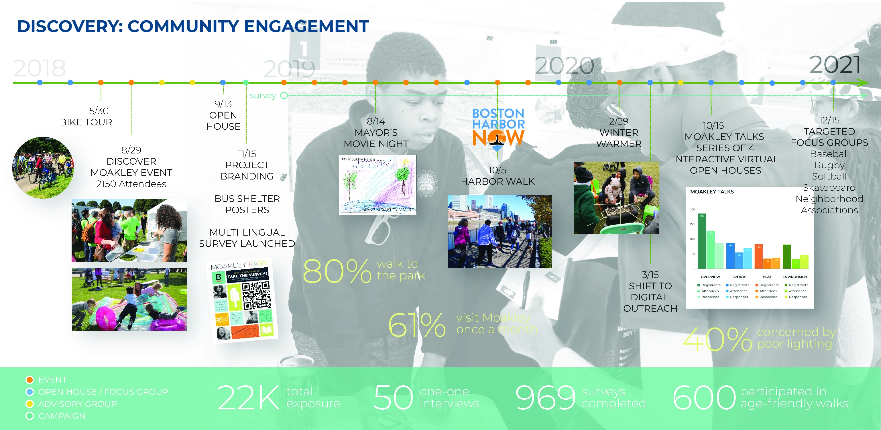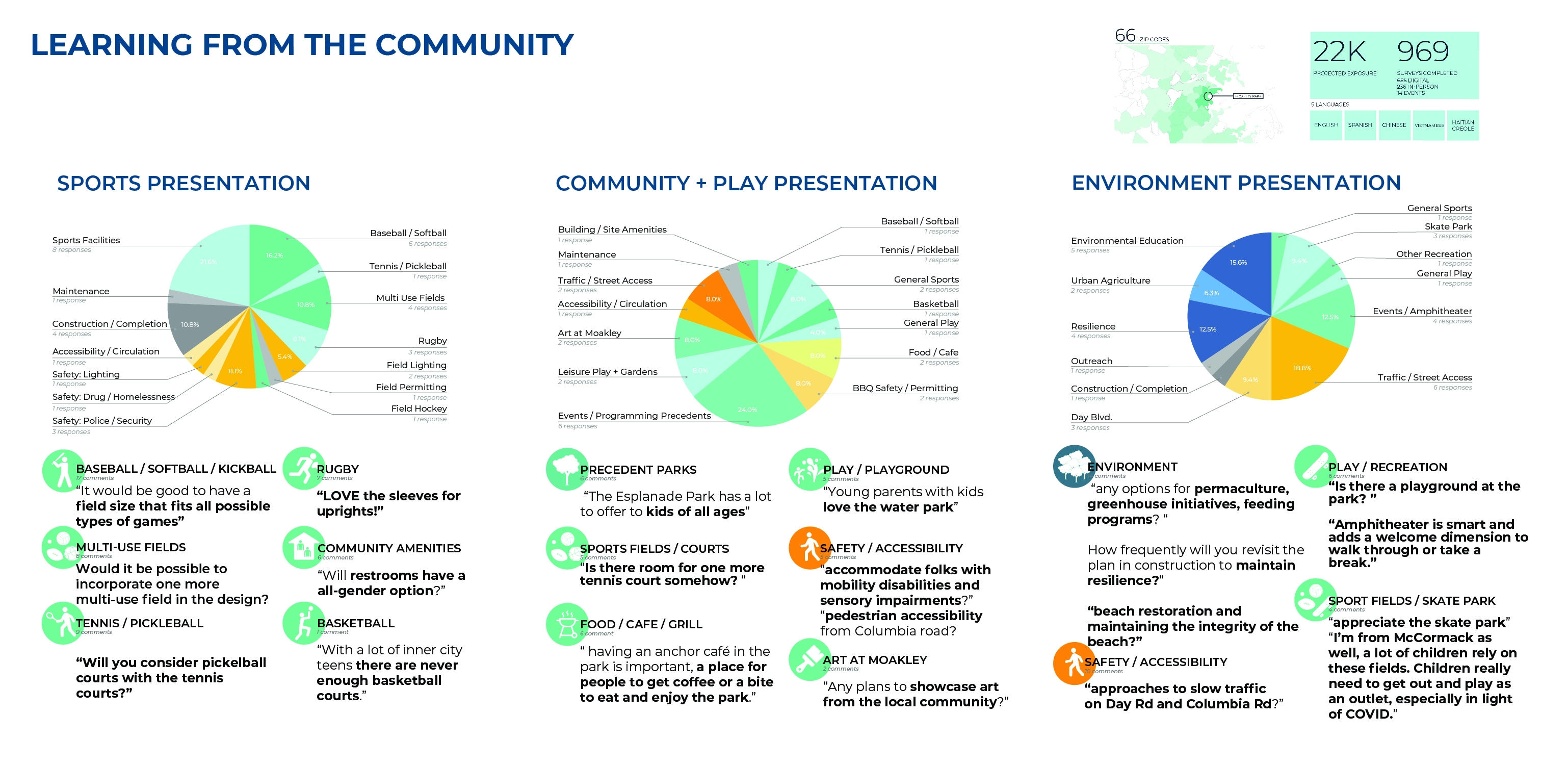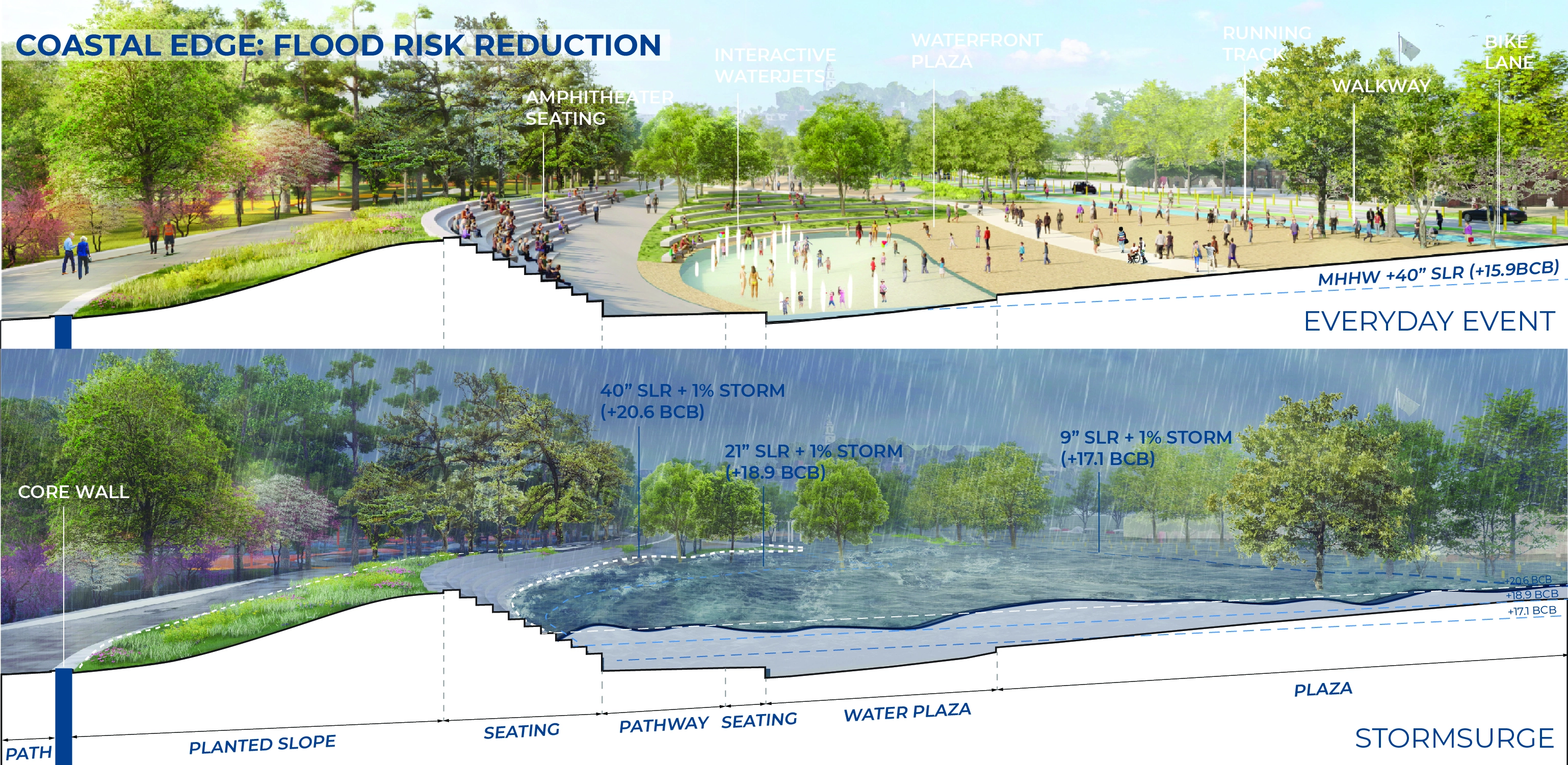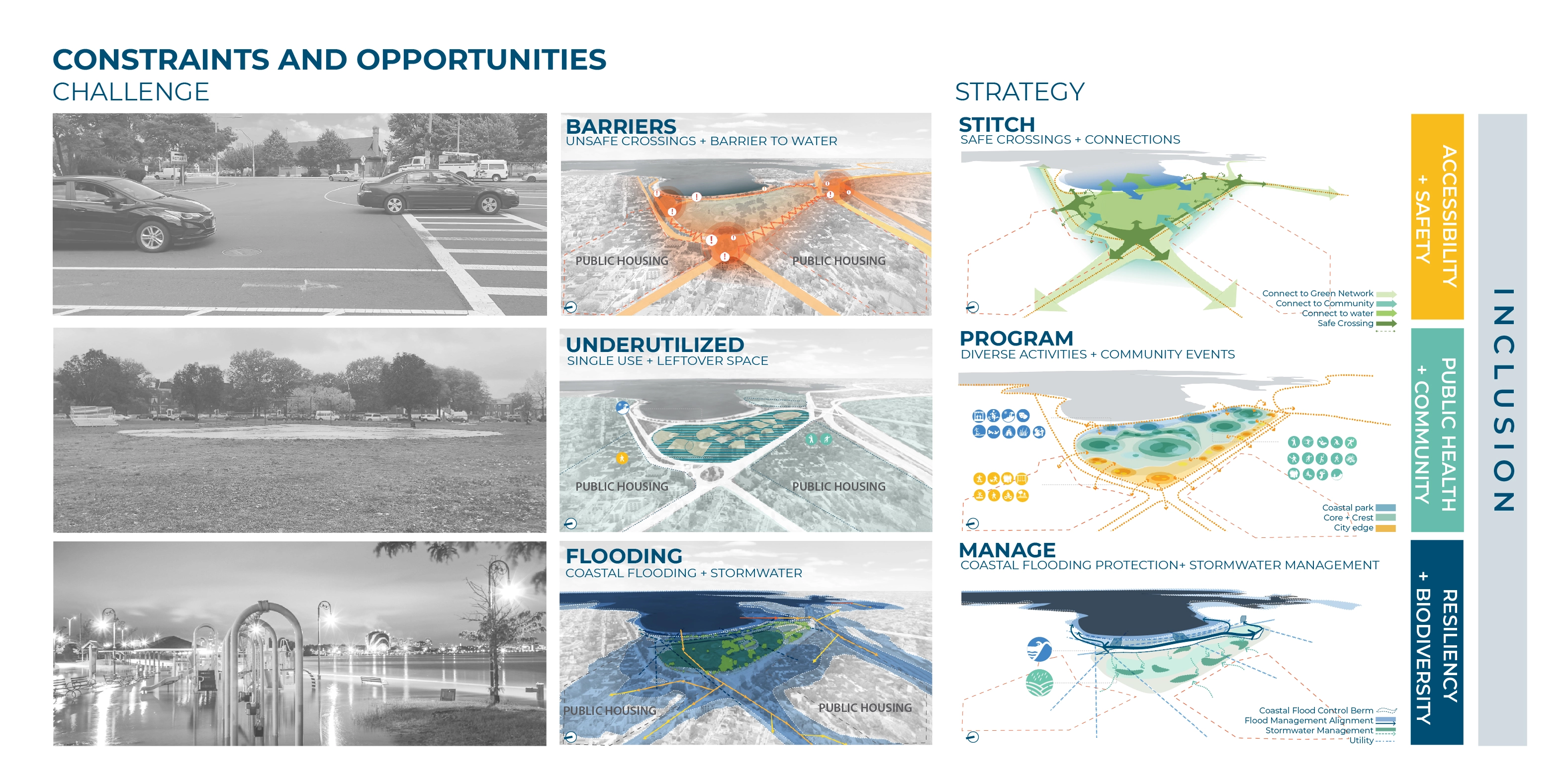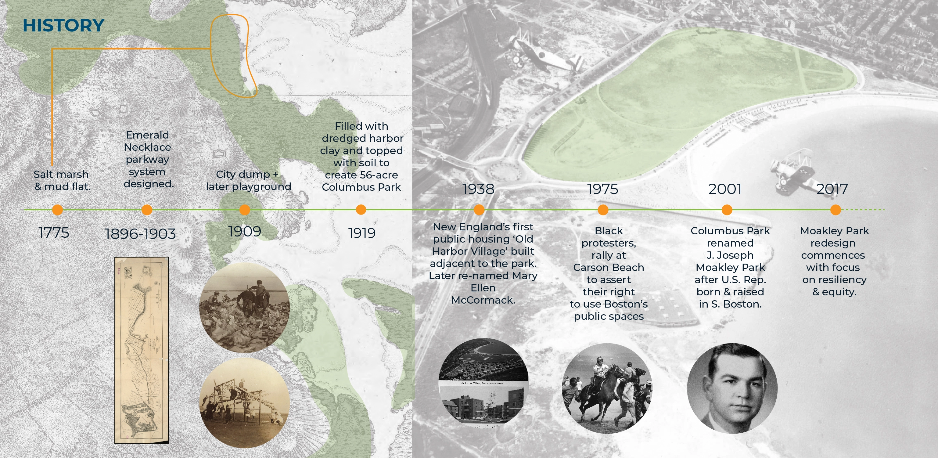 The reimagining of Moakley Park represents Boston’s greatest open space investment since Olmsted’s Emerald Necklace. As the city transforms its relationship to its Harbor–rediscovering it while simultaneously preparing for sea level rise–Moakley will play a key role as Boston’s largest waterfront park, and a new link that connects the Necklace to the Harbor. The plan responds to pressing needs by addressing climate change, biodiversity, inclusion, and access. The future park will be a resilient open space that protects residents while connecting Boston to its greatest natural resource, the Harbor. The renewed and reprogrammed park will serve a broad audience from the immediately adjacent neighborhoods of Dorchester, Roxbury, and South Boston, all of which are currently lacking in open space. Accessible by transit, Moakley Park is also poised to become a beachfront destination for all Bostonians, in a city where everyday interactions with the waterfront are rare. In addition, the park will form a resilient buffer between Boston Harbor and two major public housing developments, Mary Ellen McCormack and Old Colony Houses, protecting these from flooding for the coming decades. As the surrounding neighborhoods gentrify, the preservation of these complexes will be essential to maintaining a diverse community at the heart of the city. Within this context, thoughtful and inclusive communication and engagement were essential to the planning process. The team also chose to prioritize design strategies that will attract the broadest possible audience to the park and serve the needs of diverse residents–sending a clear signal that the park is for everyone. Stakeholder and Community Involvement The goal of attracting new and diverse users to the park was a major driver of the public engagement process. The team formed critical partnerships to expand reach, including with the non-profit Boston Harbor Now, as well as community leaders representing organizations such as the South Boston Neighborhood House. Prior to COVID-19, the foundation of the engagement strategy was Community Open Houses and on-site events, including ‘Discover Moakley!’–a daylong community event organized to bring fun and energy to the park with local vendors, an activated street, and booths for community input and resiliency education. These efforts were amplified with digital and physical surveys, one-on-one interviews, and mapping activities; this allowed the team to initiate conversations with community members about how the park is used, and better understand their hopes for its future. The pandemic demanded a rapid transformation, pushing the team to generate ideas that in fact expanded the reach of the effort, using strategies such as online surveys, virtual tours, and interactive video meetings. To increase the impact of the plan, the design team also initiated a set of topical meetings focused on climate resilience and economic development to coordinate with ongoing efforts of others working on adjacent properties. These included conversations with developers currently working on the adjacent redevelopment sites at Mary Ellen McCormack Houses and Bayside Expo Center; stakeholders such as UMass Boston, the Massachusetts Department of Conservation and Recreation, and the Boston Planning and Development Agency; as well as other consulting teams working on City-led plans for nearby Morrissey Boulevard and Climate Ready Dorchester. Feedback directly informed the park design–from the number of ball fields, to the location of event spaces, to the types of programming located along the park edge closest to local residents. After hearing concerns regarding the City’s ability to maintain amenities, a monthly park clean-up was initiated by Boston Harbor Now, Parks staff, and the design team. These early efforts have already been met with appreciation and even participation by some volunteer community members. Climate change, resilience, and sustainability Originally a salt marsh and mudflat, Moakley has been unofficially used for recreation since 1909 when it served as first a garbage dump and a playground. Filled in 1919 with harbor-dredged clay, the site’s flat, impermeable soil already presents problems today, as mild rain events often cause flooding and leave recreational amenities unusable. To address infiltration issues, the plan proposes to incorporate green infrastructure strategies across the site, including stormwater meadows, corridors, tree trenches, and porous pavement. The park’s existing flood issues proved to be a useful entry point for the design team in communicating the need for long-range flood protection and stormwater management to the community of current park users, who have already experienced their impact. On a longer-term timeline, sea level rise projections predict a 21-40” water level increase in Boston Harbor within 50-60 years. At the top of this range, floodwaters entering through Moakley in a 100-year storm would join two other flood pathways, not only inundating the adjacent housing complexes but also sending water deep into Boston’s South End. The plan proposes an engineered flood-protection wall which is embedded into the park’s topography and programming such that it doesn’t cut the community off from the waterfront–for instance, one segment of the wall serves as an amphitheater seating space with views to the water. At the coastal edge, restored dunes will soften the impact of wave action and provide essential habitat. This coastal edge is an exciting and challenging landscape, forcing the team to consider successional growth, rising groundwater, and saline inundation over time. It also presents an opportunity to increase biodiversity: the plan proposes introducing over 500 new trees that will contribute to heat reduction and the health of Boston’s urban forest, alongside a mix of native plants including coastal marsh species, maritime shrublands, and woodland