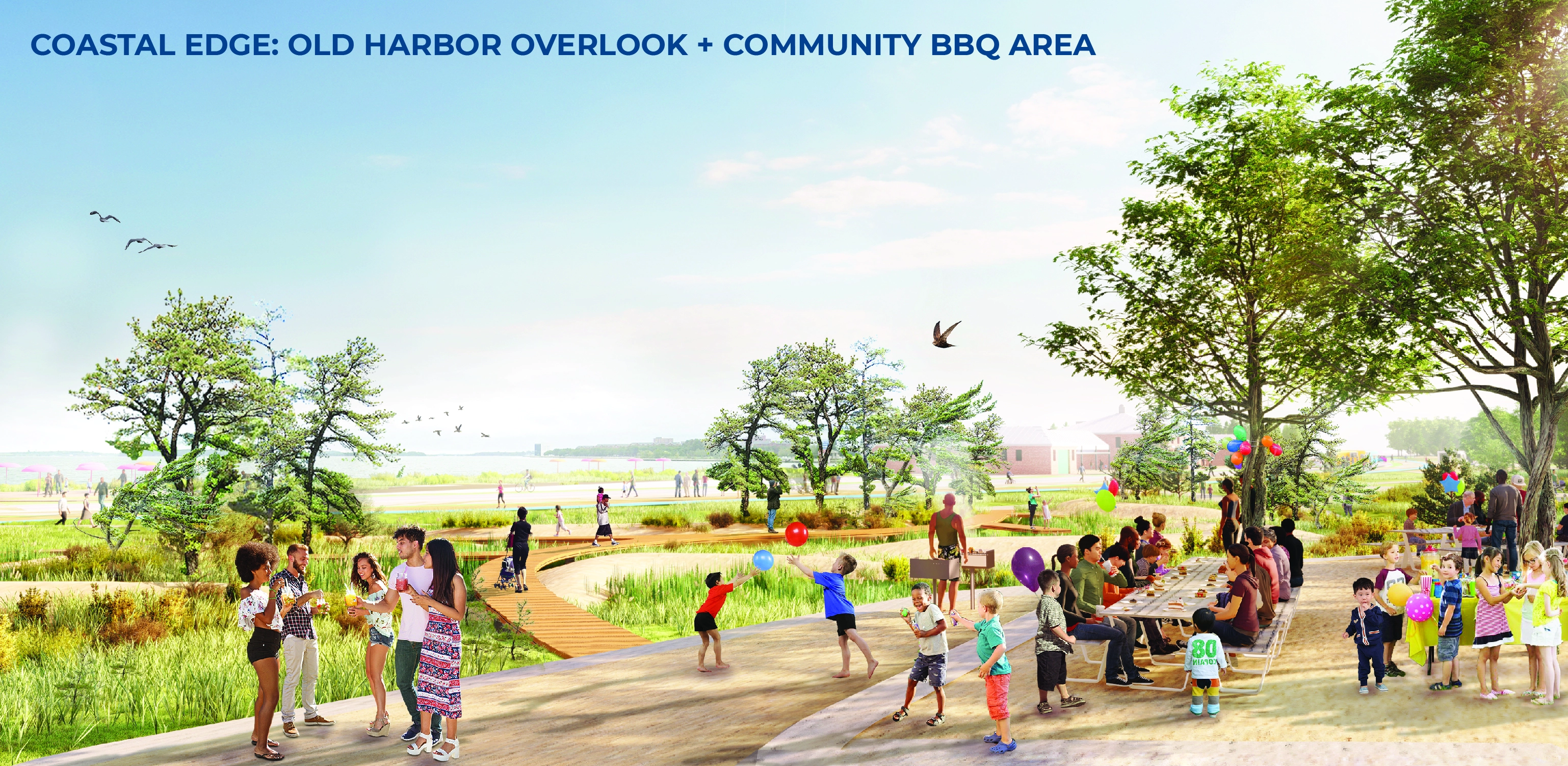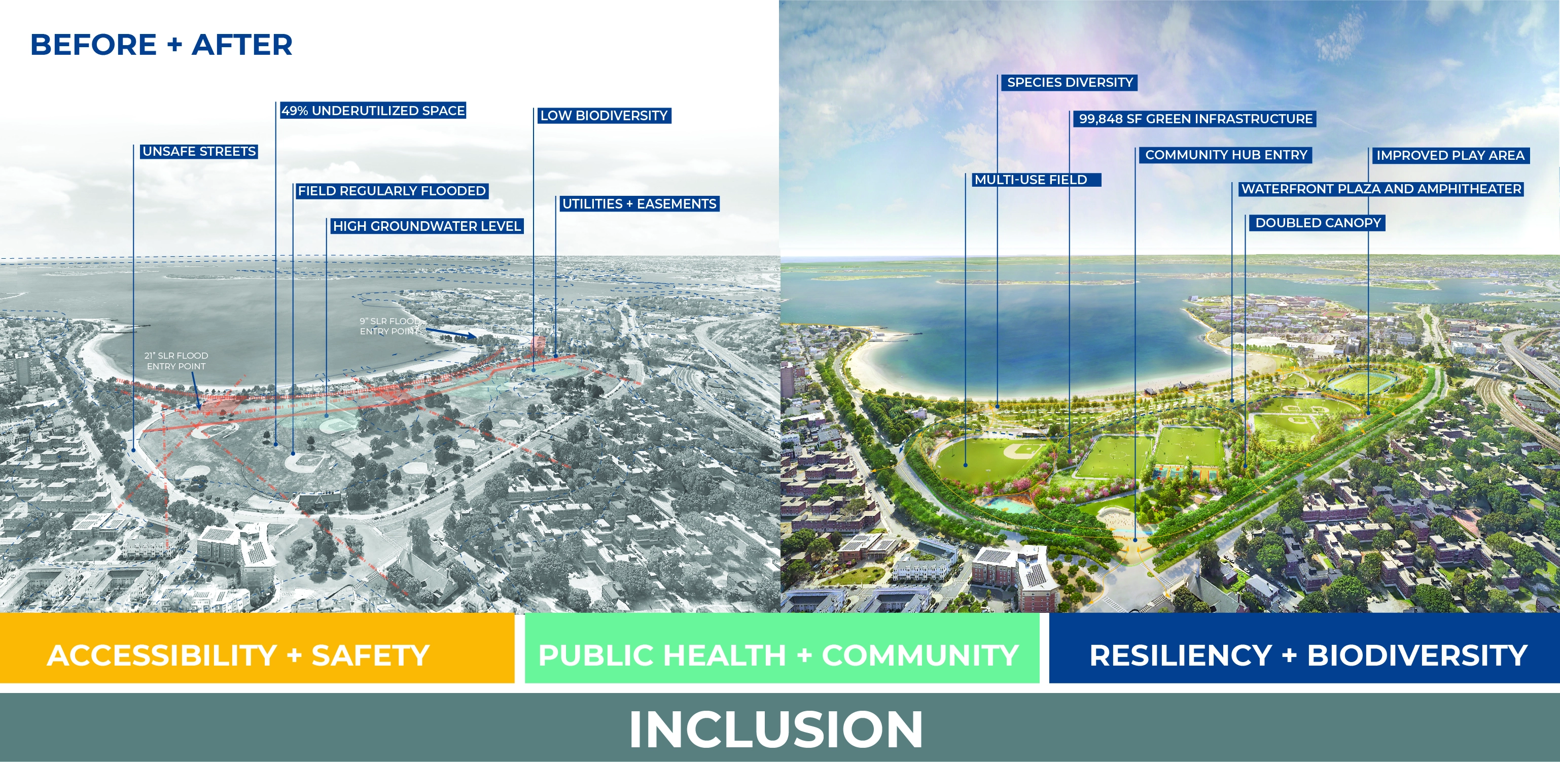 The reimagining of Moakley Park represents Boston’s greatest open space investment since Olmsted’s Emerald Necklace. As the city transforms its relationship to its Harbor–rediscovering it as a resource while preparing for sea level rise–Moakley will play a key role as Boston’s largest waterfront park. Moakley Park sits at the intersection of multiple neighborhoods which lack open space and currently feel disconnected from the park and adjacent waterfront. These neighborhoods are at risk of flooding from rising seas and increasing coastal storms. The renewed and reprogrammed park will form a resilient buffer between rising seas and adjacent residents, in particular two public housing developments. Recreational capacity will be increased through stormwater management on frequently flooded fields while new programming such as adventure play, community gardens, and barbeque areas will welcome a more diverse audience. The plan responds to pressing needs by addressing climate change, biodiversity, inclusion, and access. The future park will be a resilient open space that protects residents while connecting Boston to its greatest natural resource, the Harbor.