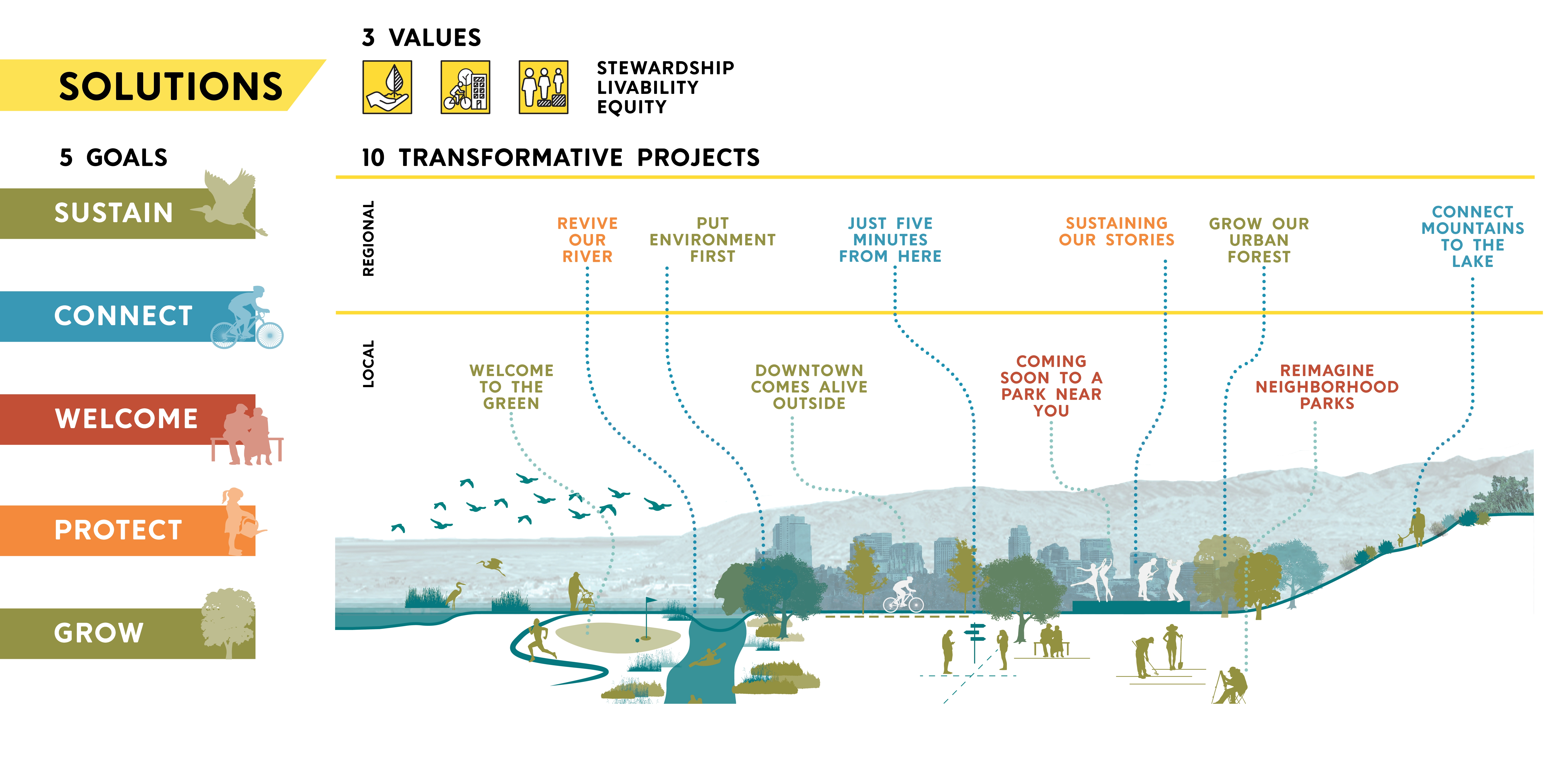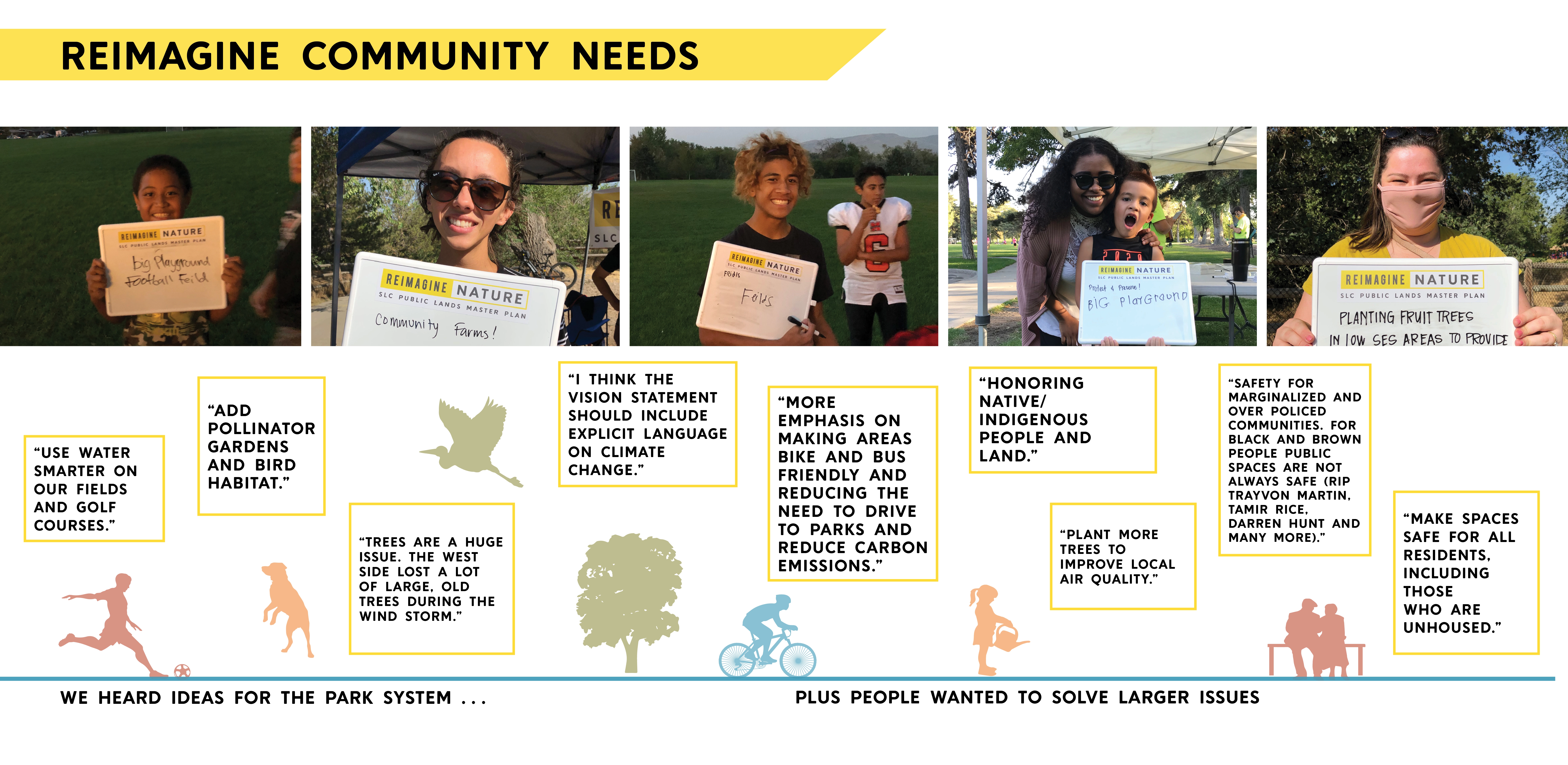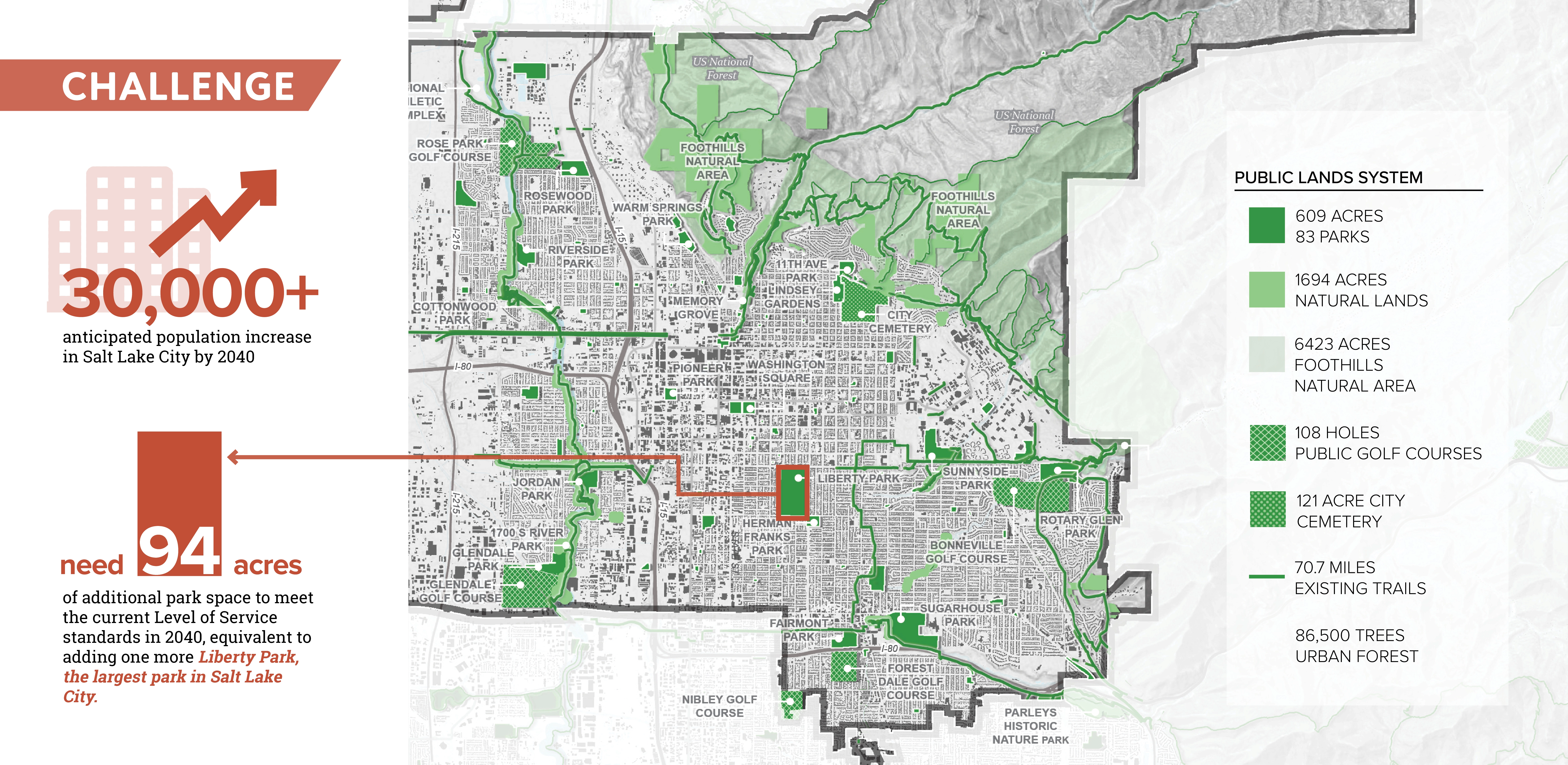 EXPANSIVE INFLUENCE Salt Lake City initiated the planning process just as the pandemic began and these public spaces became more essential refuges than ever. This timing coincided with civic protests centered around racial justice and police reform, addressing historic inequalities in City investments, disproportional impacts of poor air quality and climate change, and the growing crisis to house unsheltered populations. These topics have broad implications and could have been dismissed as outside the park department’s influence. Instead, the master plan expanded, championing collaborative solutions. This master plan directs the future of 125 properties that touch virtually every life of the 200,000 residents throughout this rapidly growing city, making it the most important plan in the past 30 years for Public Lands. Branded “Reimagine Nature,” this project inspired community members to explore how city-managed outdoor spaces can address current events centered around core values of equity, stewardship, and livability. USING SOCIAL AND ENVIORNMENTAL DATA FOR DECISION-MAKING Community-driven conversations coalesced into five themes for analysis that informed the creation of innovative planning tools: 1. Reimagine Environmental Health: How can Public Lands contribute to a more sustainable future? Performance of the urban forest and public lands system were analyzed under categories of human health, wildlife and ecology, and resilient landscapes. The analysis combined with community input identified the most urgent actions: strategic tree planting, increase vegetative species diversity, and adaptation for drought. 2. Reimage Inclusion: How can Public Lands reflect surrounding neighborhoods and create opportunities for exchange? A tool for assessing individual park quality and access was creating that included metrics for neighborhood expression and cultural place-making, public safety, and activity levels. University students, citizens and city staff completed audits scoring 22 parks evaluating equity in park design. The findings were enlightening and led to instituting new expectations for neighborhood parks, planning processes and toolkit for grass-roots led park design and activation events. 3. Reimagine Access: How can Public Lands connect people to each other and nature? Analysis identified gaps in connectivity and mobility considerations informing priorities for park and pathway improvements. Foothills and conserved natural lands are concentrated on the northeast part of the city, resulting in one-fourth of residences, mostly on the westside, located outside of walking distance. The plan emphasizes equitable investment creating nature-filled recreation opportunities on the westside accessible by foot and transit, within the parks and natural lands of the Jordan River Parkway. 4. Reimagine Protect: How can we ensure our Public Lands are sustained for future generations? Operations, staffing, and funding were assessed to anticipate what resources this plan’s implementation would need and build efficiency into addressing environmental threats. This evaluation showed that to maintain current levels by 2040 the annual operating budget will need to increase by $5 million and 24 additional staff will be needed. The findings helped support changes including hiring a staff member for volunteerism organization that has leveraged exponential community contributions. 5. Reimage Growth: What can Public Lands do to provide sufficient public space for future population growth when standards of acres per population are unrealistic? Salt Lake City would have to add park space equal to the size of Liberty Park (94 acres) to keep up with anticipated population growth, a real challenge in this built-out, high property cost and landlocked city. Strategies were created for better use of current land holdings - such as golf courses, right-of-way, and existing parks to do more for environmental performance, recreation, and social needs. These changes equate to the standard, ensuring these actions will result in avoiding overcrowding. RAISING ALL VOICES IN CHORUS Known as a “crossroads of the west” and a place of refugee resettlement, Salt Lake City has a diverse population with over 120 languages spoken and large Hispanic and Native American populations. Research showed disparate levels of activity in the outdoors by these populations. It was paramount to gather input to understand representative lived experiences and their needs, interests and access. However, in Salt Lake City, engagement in civic matters has long been dominated by singular socioeconomic groups. These challenges were overcome by the project team’s strategic and resourceful thinking, experimentation, and the will of 60 community partners and advocates including unique partnership with 85 university students that served as ambassadors. Despite challenges of a small project budget and the COVID-19 pandemic, this engagement campaign raised the bar for City planning efforts, exceeding a goal of involving 10 percent of all adults. Online and in-person activities combined reached a broader audience than taken individually. Participation demographics were monitored to inform where to pivot to gain representation from the diversity of the city. More critical than quantity, the quality of dialog in focus groups, collaborative workshops, place-making activities, roughly 2,000 individual survey comments, and intercept interview conversations provided a conduit for the community to craft the plan. How can one plan respond to many points of input and synthesize differing perspectives? The concluding engagement opportunity asked if the planning team had incorporated participation appropriately, if community voices were audible in the vision, goals, and projects. Overall, 87 percent of respondents were satisfied with the plan direction and provided hundreds of suggestions for adjustments that informed the final plan contents. While componen