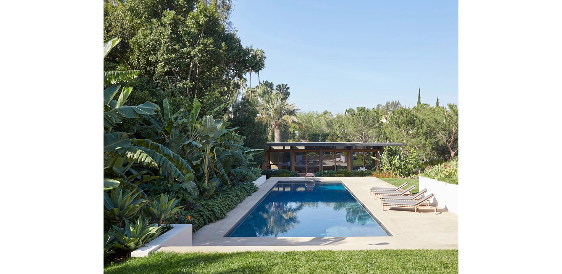 To ensure adherence to the original design intent, our team referenced Julius Shulman’s historic photos of the house interiors, façade, and landscape. The original, dynamic, terraced configuration of the main patio and pool deck had been filled in and rearranged. The restoration brought back the built-in planters, stairs, and sloping lawn that Neutra had envisioned for the space. Key specimen trees were placed to interact with the architecture’s overhangs, site walls, and beams, in locations shown in the historic photographs. The historic pool house was remodeled, and a new guest house at the end of the pool celebrates views toward the main house, from Shulman’s famous vantage point.