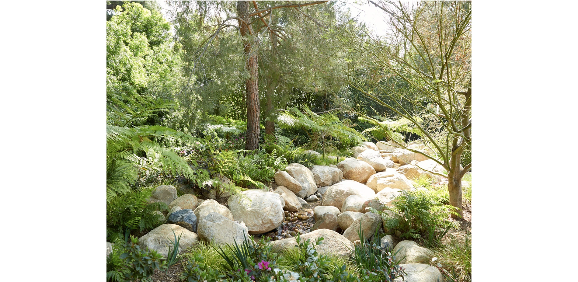 The rest of the landscape design focused on the client’s desire to showcase the unique diversity of plant life available to Southern California gardens, as well as offer privacy from nearby Sunset Boulevard. Over 150 mature specimen trees of more than 25 species were planted at the property’s perimeter, along the driveway and within its garden spaces, creating an instant, lush atmosphere. Native plantings dominate the driveway and autocourt, while diverse plant palettes from Mediterranean climates, temperate shade gardens, desert areas, and subtropical regions reflect and adapt to the particular microclimates of different courtyards and garden spaces throughout the site.