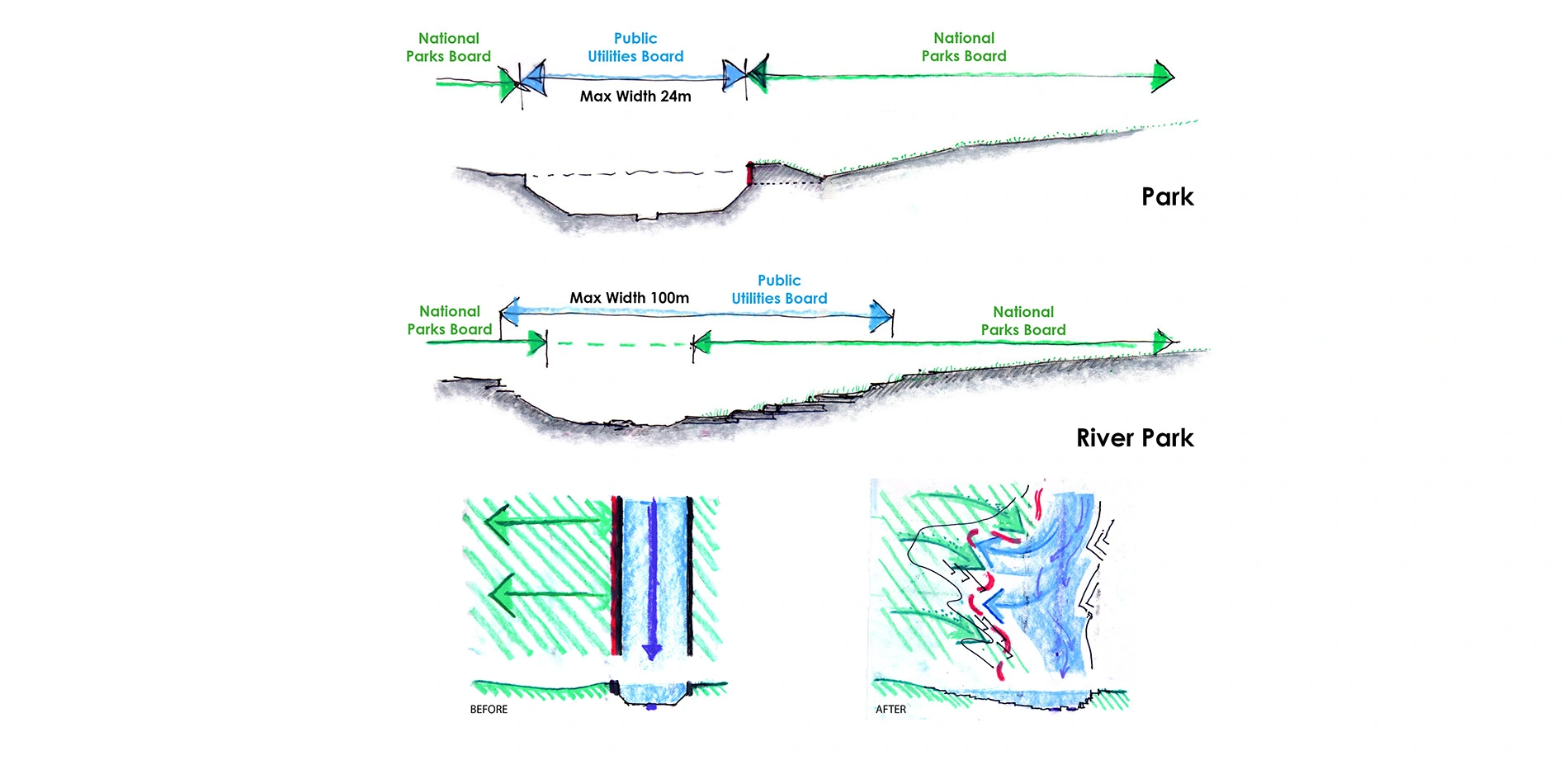 In 2006, Singapore’s national water agency, PUB, initiated the Active, Beautiful and Clean Waters Programme - a long-term initiative to transform the country’s water bodies beyond their functions of drainage and water supply, into vibrant, new spaces for community bonding and recreation. As part of a much-needed park upgrade and plans to improve the capacity of the canal bisecting the park, the new design integrates the seemingly opposing requirements. And thus, the plan to break down the concrete channel and create a naturalized waterway was conceived for the first time in Singapore.