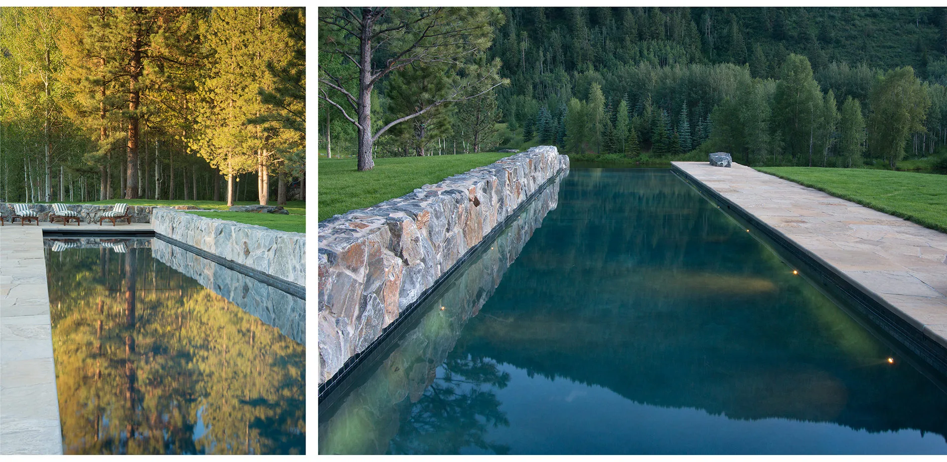 To the west of the sun terrace, a flagstone path meanders through preserved Ponderosa pines, ultimately joining the distant pool terrace. The pool, hidden from view by a classic “ha-ha” wall, is an unexpected discovery. The linear pool terrace terminates on a granite outcropping overlooking a lower valley and a second stream feature. Capturing runoff from the local watershed, the stream traverses through a woodland landscape, passing under a stone bridge and cascading down crafted granite shelves before it finally reaches the lake. A network of natural trails circumnavigates the lake, offering a year-round, seasonally rich journey through the distinct landscape narratives. -
