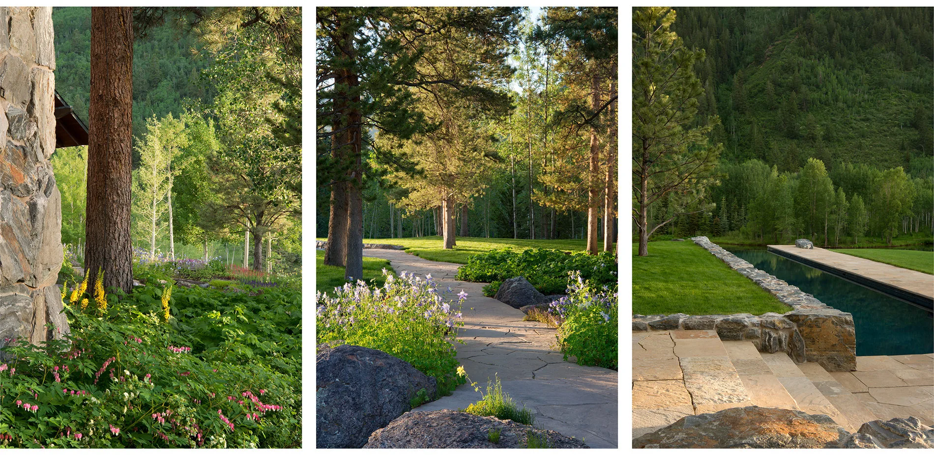 Preserving and enhancing the property’s existing montane forests was a priority for the landscape architect. Supplemental plantings of trees were intermixed with a layered understory of fruiting shrubs, including kinnikinnick, mountain ash, thimbleberry, serviceberry and wild raspberry to increase biological diversity and help sustain wildlife and bird populations. Consistent forest management and monitoring suggest that the forest is vibrant and healthy.