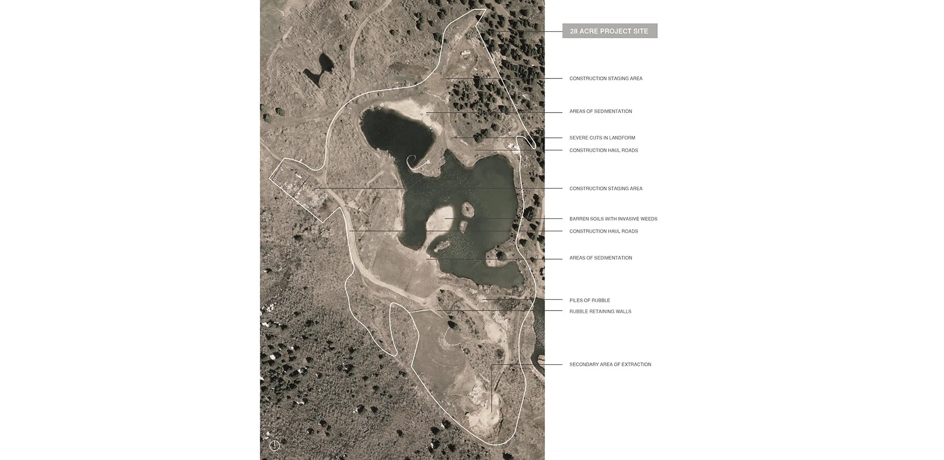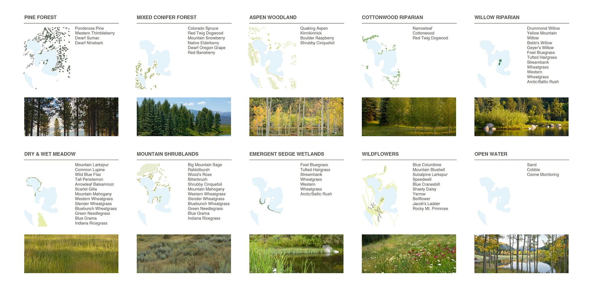 Restoration of the neglected, barren and weed-infested property began with an analysis of surrounding existing environmental conditions, including a detailed study of predominant vegetative communities, species composition and density, and microclimates that would inform the development of an overall design for the property. A complete site analysis revealed extreme climate variations, including intense solar exposure, prevailing winds, temperature fluctuations and extended snow coverage from October through April. In addition, a study of the regional Montane plant communities suggested the implementation and/or reintroduction of ten distinct vegetation types including pine forest, mixed conifer forest, aspen woodland, cottonwood riparian, willow riparian, dry meadow, wet meadow, emergent sedge wetland, mountain shrublands, wildflowers, and open water.