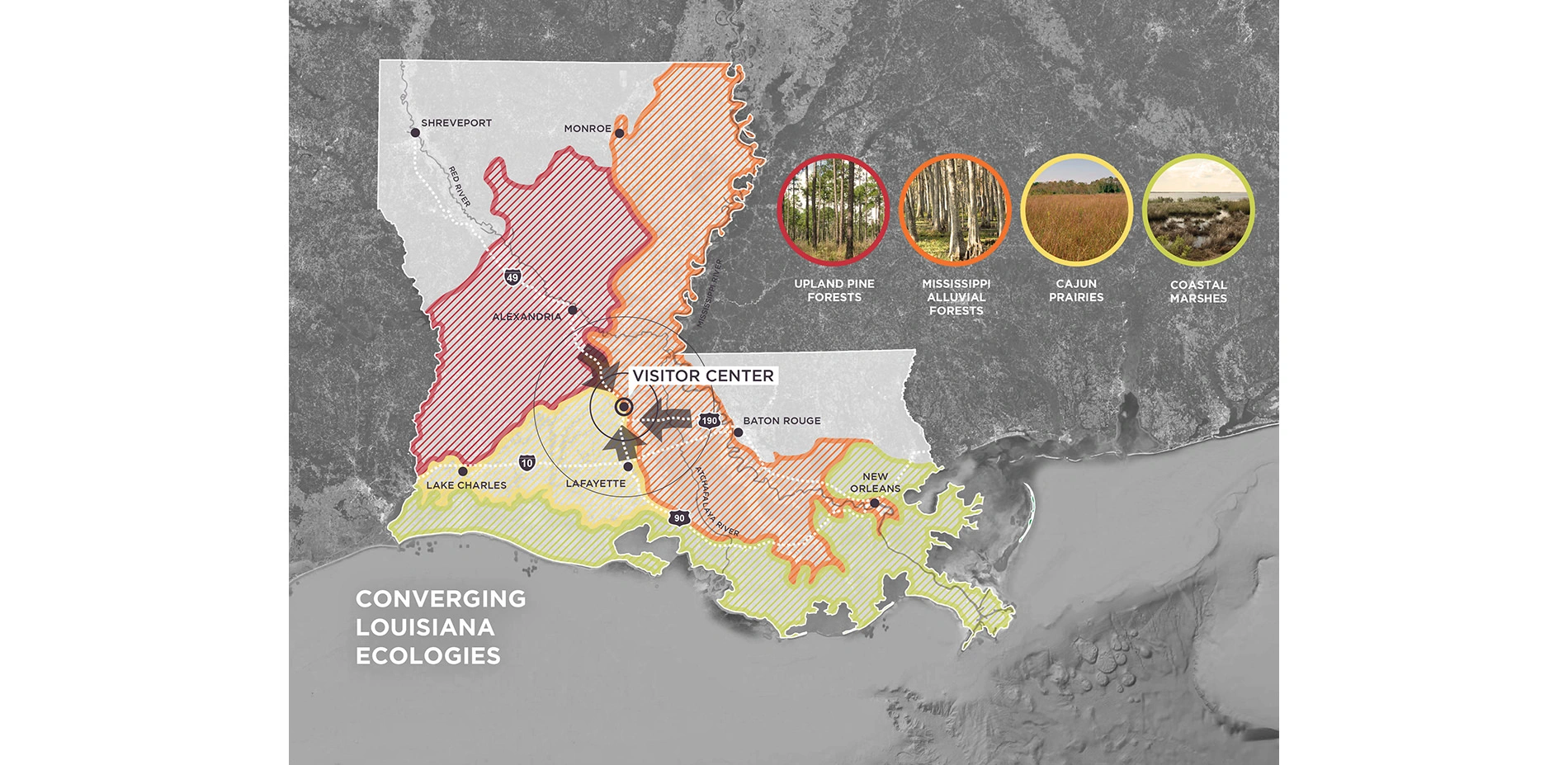 St. Landry Parish serves as the northern gateway to Louisiana’s Acadiana region. The proposal for a new visitor center along Interstate 49 was an opportunity to provide visitors their first glimpse of the forests, swamps, and prairies typical of this diverse landscape. Through interpretations of these native landscapes at the new St. Landry Parish Visitor’s Center, travelers are able to gain an understanding of the region’s distinctive character.