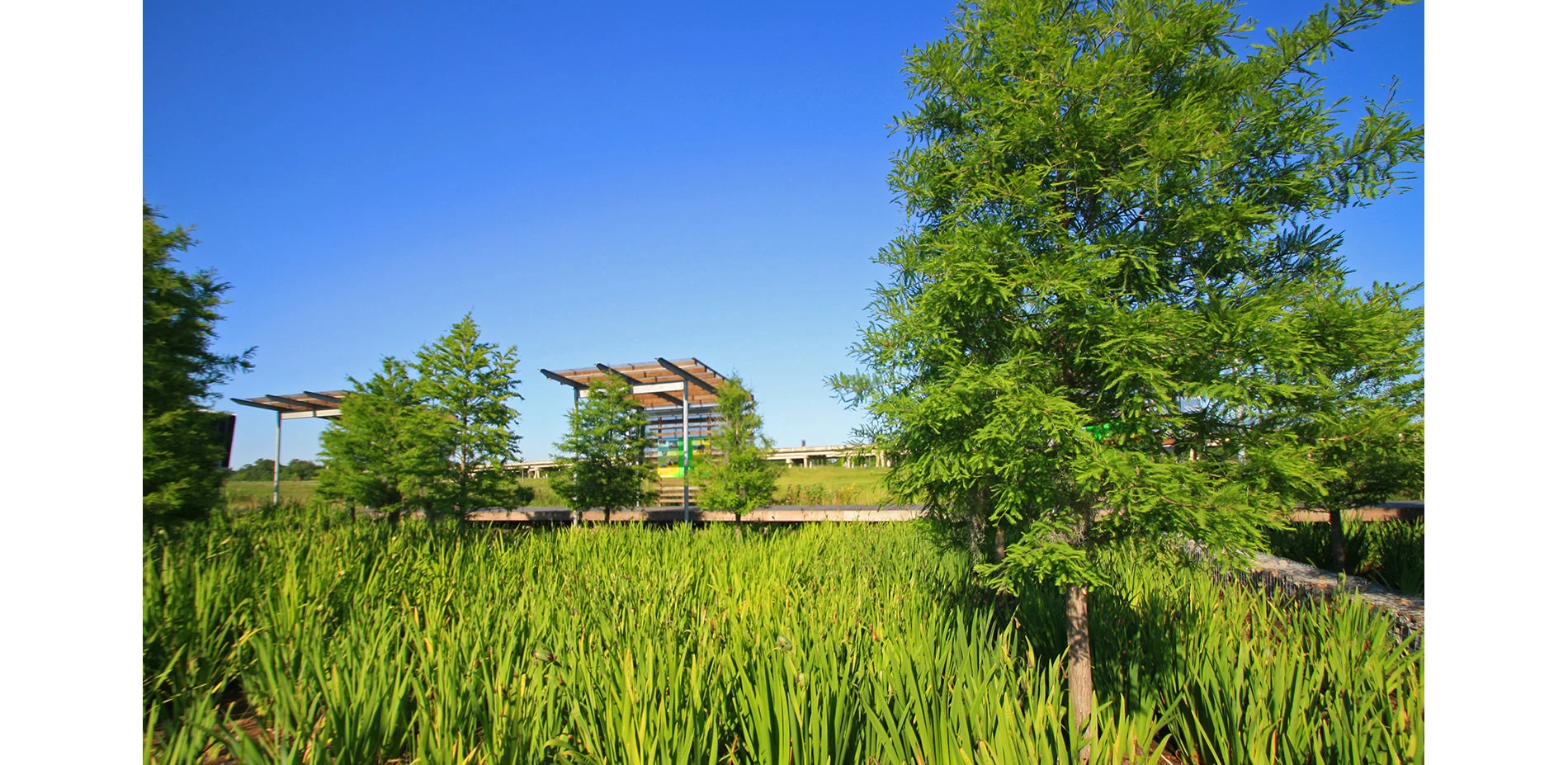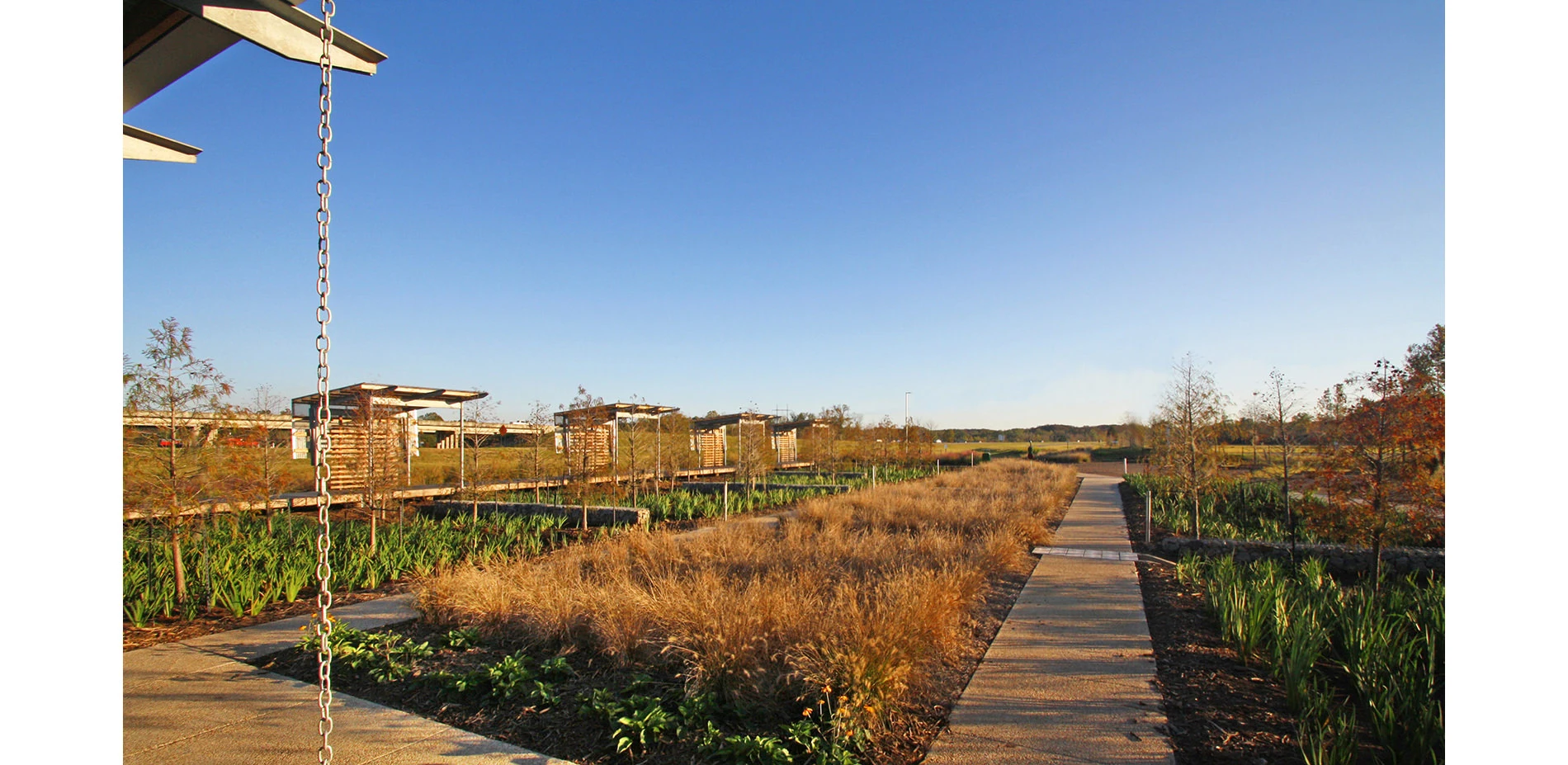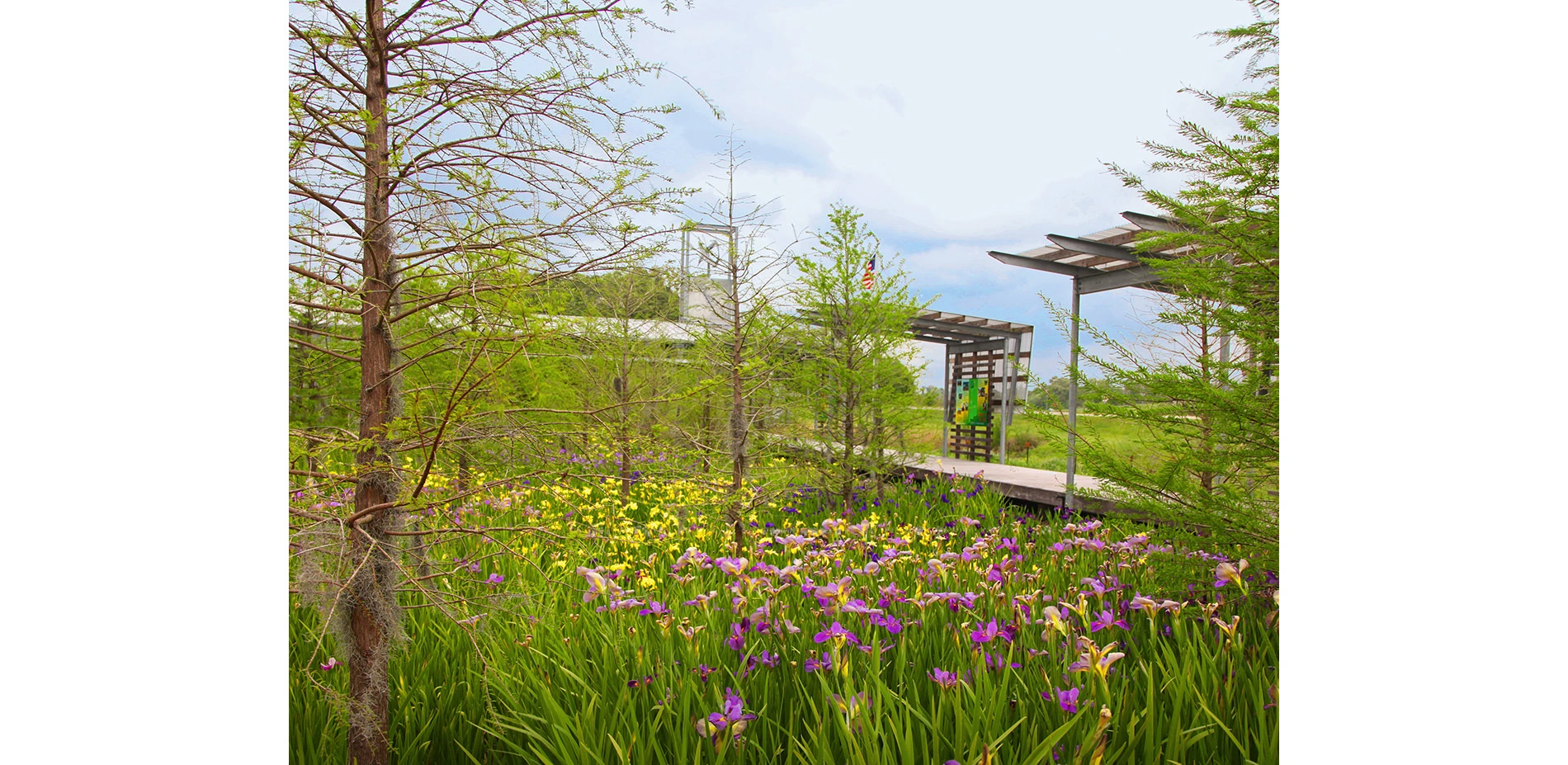 With an annual rainfall of 60-70 inches, the St. Landry Parish Visitor Center strives to responsibly manage its stormwater runoff. To do so, rain gardens collect all on-site storm and roof water via ground swales and rain chains that direct excess roof water through gulf oyster shell runnels. These gardens are accented by grids of bald cypress and brimming with eight varieties of native Louisiana iris. For all shades of green, there is an aesthetic and functional purpose. These landscapes are the centerpiece of the design and frame the exhibit hall, all while serving as a biological filter for adjacent parking and cistern overflow.
