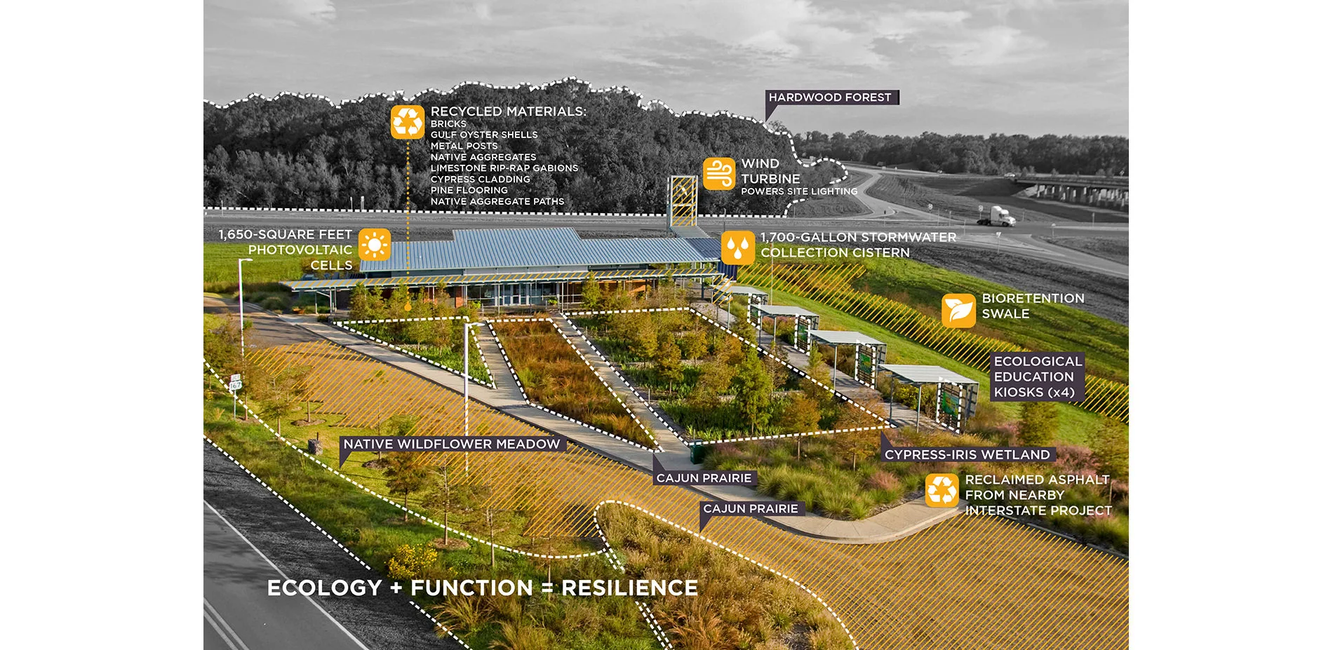 The visitor center was designed to be functionally sustainable and resilient through harsh environmental conditions and major weather events. There are no exterior painted surfaces to maintain, no lawns to mow, and spatial programming that combines multiple uses such as tourist commission offices, meeting space and exhibit halls, with the everyday convenience of the typical rest area essentials. Set near a flood zone, the site has already withstood one major water event, with minimal site damage.
