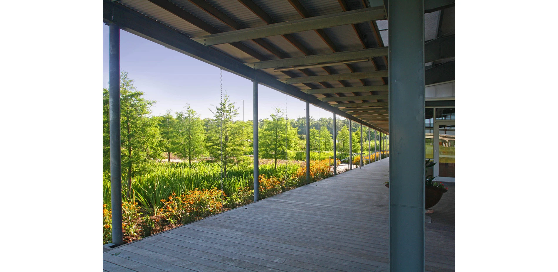 The visitor experience begins within a parking zone composed of loose and permeable milled asphalt, harvested from a nearby highway resurfacing project. Paths are paved with native aggregates, and visitors view open spaces planted with meadow grasses native to the prairies of the parish. At the Visitor Center, a seamless transition between architecture and site is very evident, with a direct sight line through the central lobby to the landscapes beyond. Elevated porches and boardwalks stretch around to a covered outdoor room. The boardwalk extends into the landscape, guiding the viewer’s eye towards the long, linear view of the horizon. The walks give access to the lush rain gardens and a procession of interpretive kiosks that punctuate the boardwalk, conveying information in both English and French, as to the history, culture, and ecology of the parish and region. Our firm was integral in the site placement and design of exterior spaces continuous with architecture.