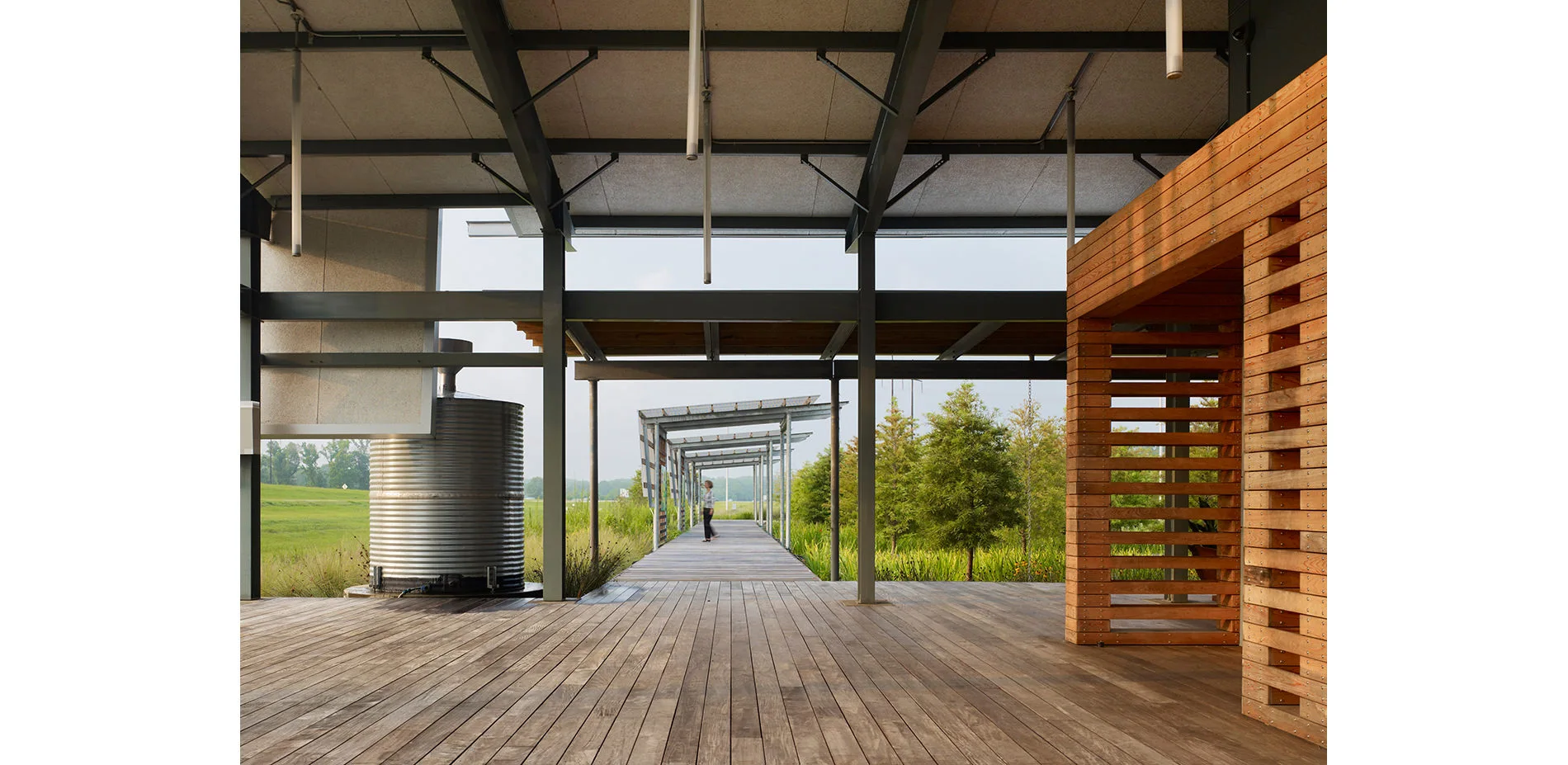 Within a rural region such as Acadiana, where landscapes are dominant, this design is a full integration of building and landscape, connected by visible sustainable strategies. The architects and landscape architects worked closely together at the intersection of building and landscape, prioritizing the landscape and outdoor experience in architectural decisions. Interpretations of traditional Louisiana building responses such as deep-shaded porches, raised elevations for protection from rising waters, sloped roofs, and cistern-collected rainwater are used in tandem with more current responses such as the vertical axis wind turbine and roof integrated solar panels. Thoughtfully selected native building materials are dominant; these include the use of recycled brick, native aggregates, milled asphalt, recycled metal, and salvaged longleaf pine and cypress. The visitor’s center showcases how both old and new sustainable practices along with appropriate material selections can work together for a current, regional response.