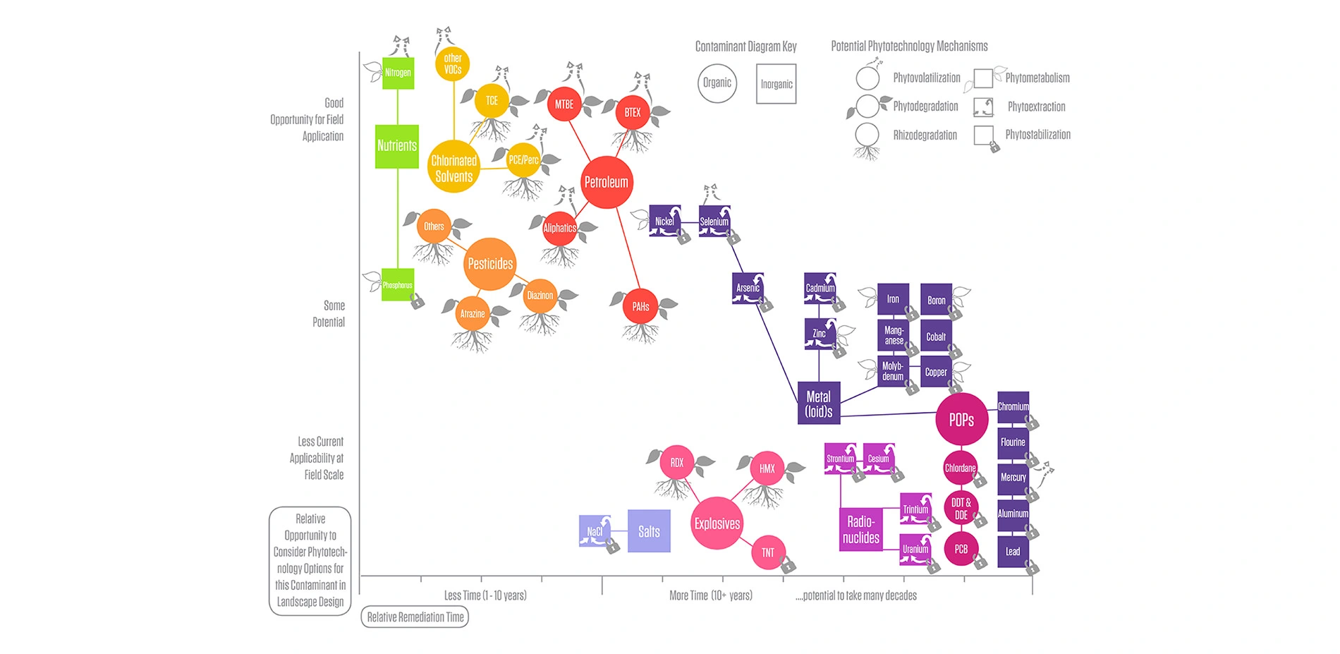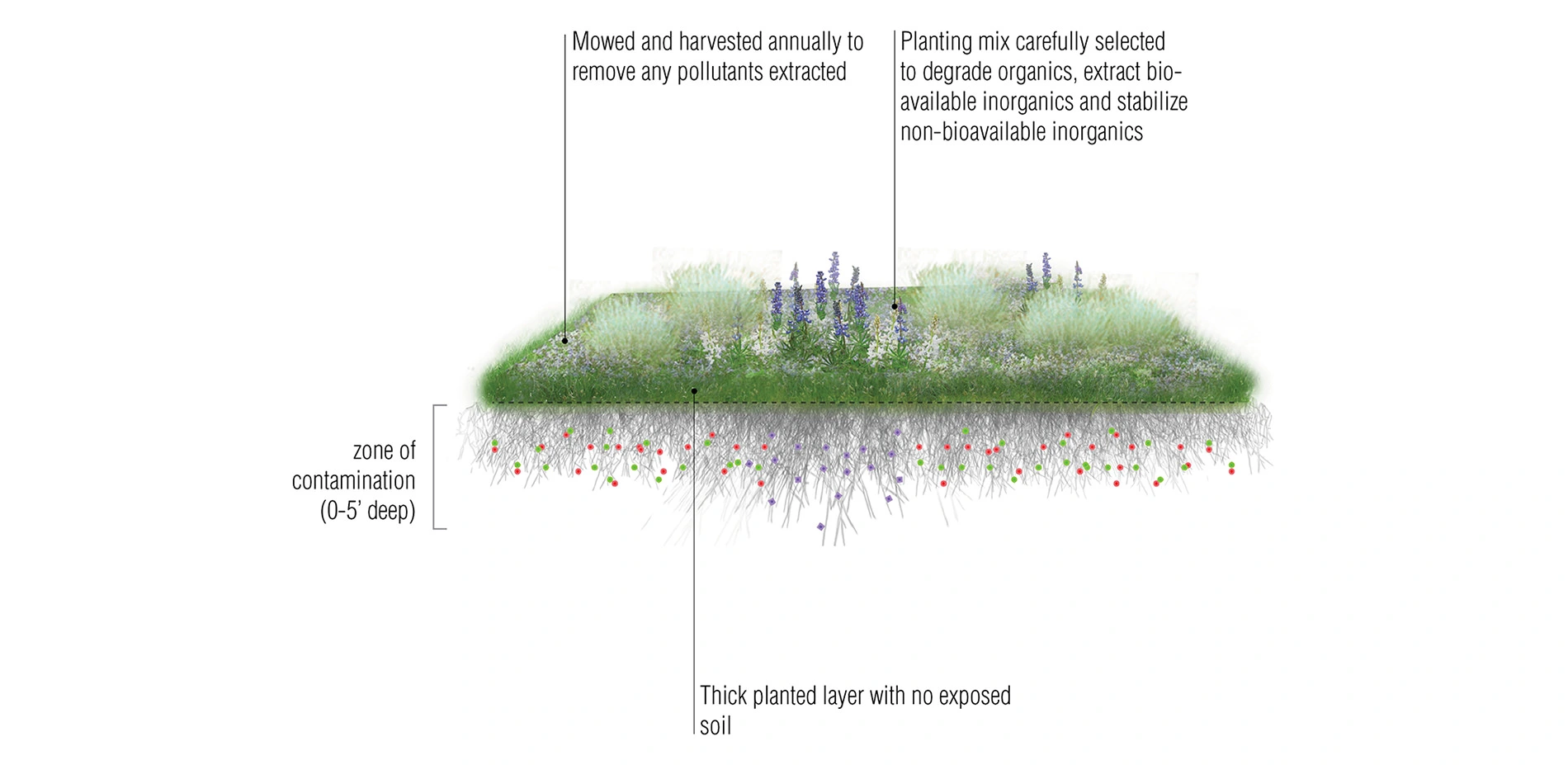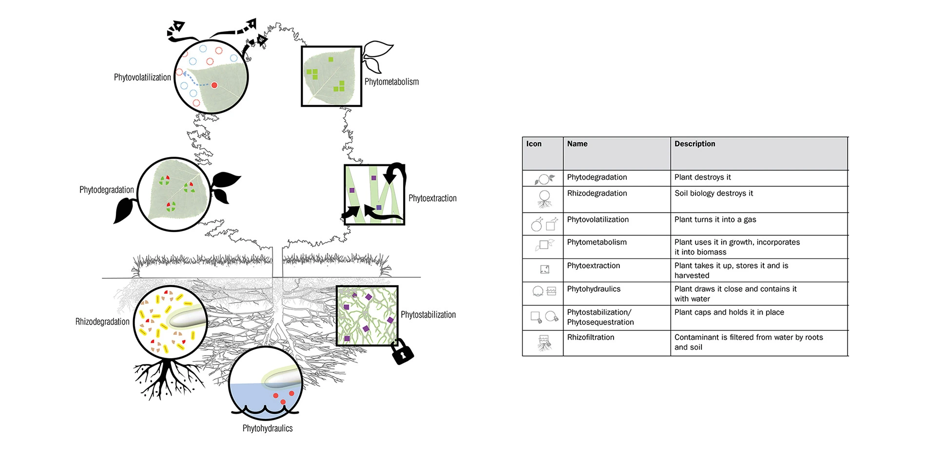 However, in addition to utilizing phytotechnologies as a tool for site remediation, PHYTO considers how phytotechnologies can be also utilized as a preventative measure in the designed landscape. This moves the application of phytotechnologies away from laws and regulatory frameworks surrounding remediation activities towards a horticultural, design and planning related set of concerns. The design and installation of phytotechnology plantings can be based on anticipated pollution events to be determined. This publication is the first targeted towards the spatial design, form, structure and aesthetics of this technology, rather than simply the science behind it. The authors’ intent is to translate current research and field studies carried out by scientists into a format useful for the design practitioner in addressing site pollutants.