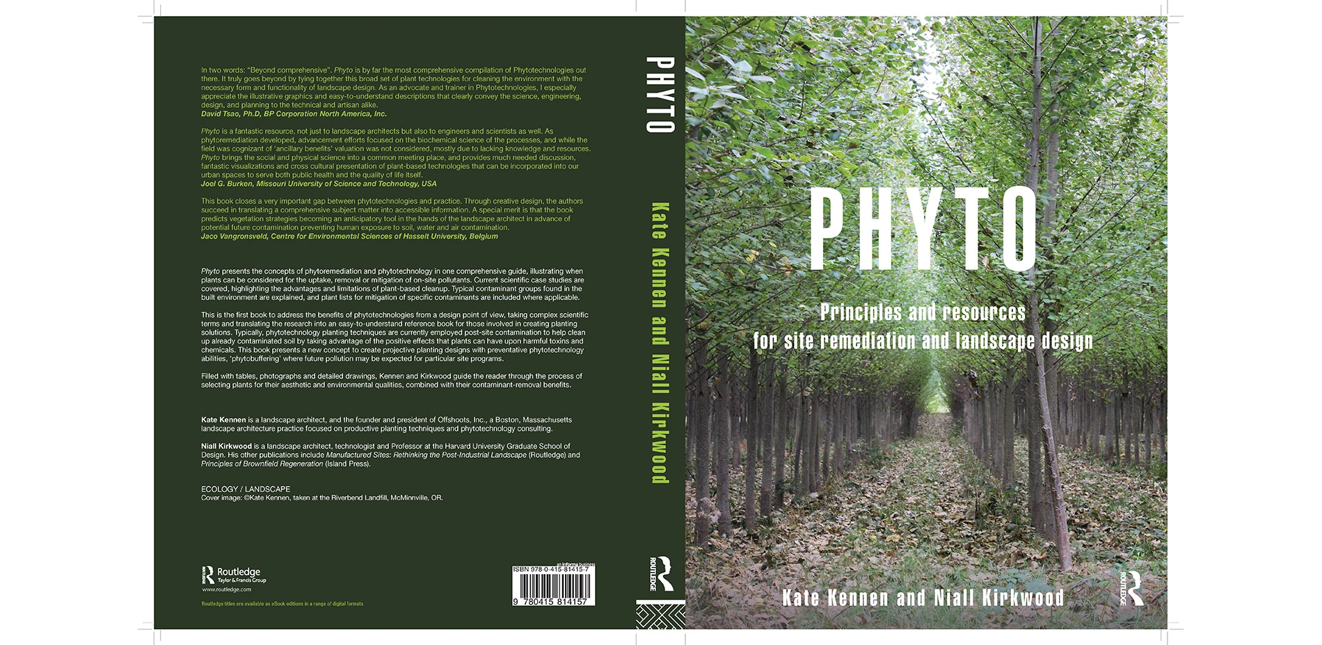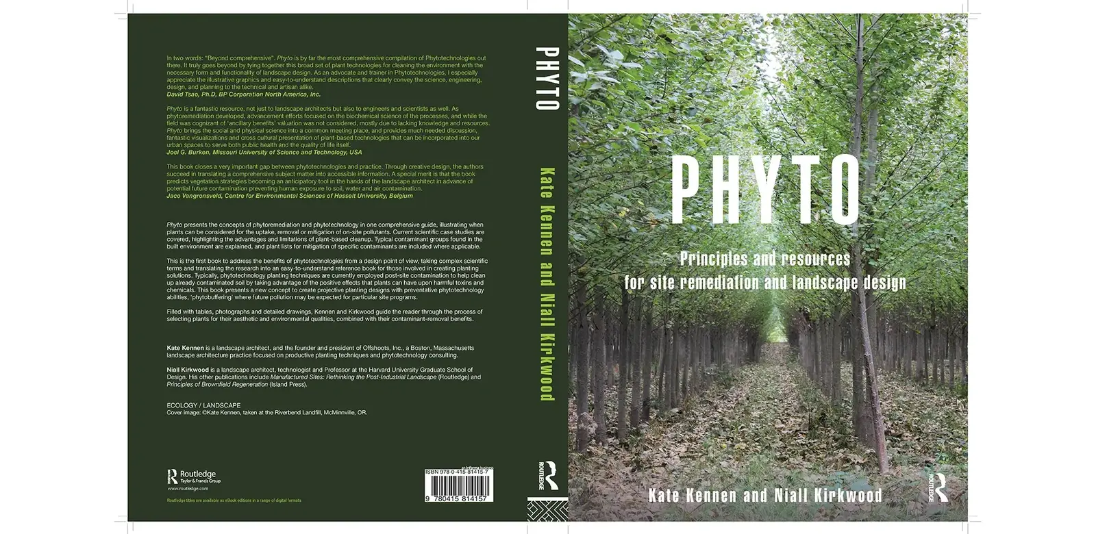 PHYTO: Principles and Resources for Site Remediation and Landscape Design (Book, Routledge, 2015) translates the science of plant-based remediation into an easy-to-read, daily desk reference for the professions of landscape architecture, planning, site engineering, real estate development, urban design, horticulture, and ornamental gardening. It presents the concepts of phytoremediation and phytotechnology in one comprehensive guide, illustrating when plants can be considered for the uptake, removal or mitigation of on-site pollutants. This is the first guide of its kind to translate the complicated peer-reviewed science from various journals and case studies to design practitioners. Previous books published on phytoremediation were written by scientists for scientists. The thick language, obscure terms and text-based format are difficult to navigate. Filled with legible tables, photographs and diagrammatic drawings, PHYTO guides the reader through the process of selecting plants for their aesthetic and environmental qualities, combined with their contaminant-removal benefits. The book publication was released in June 2015 and is available through commercial bookstores. The first printing (800 copies) sold out in December 2015 and the book is not in its second printing.