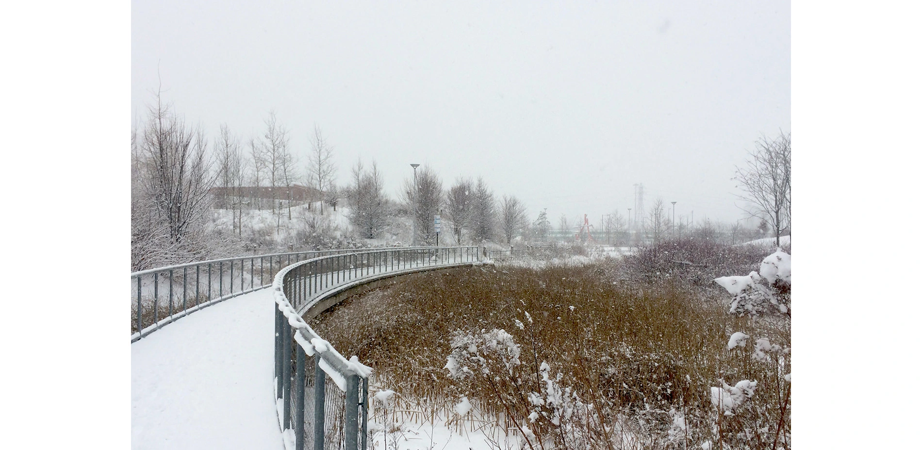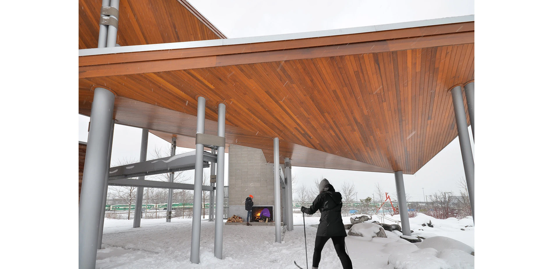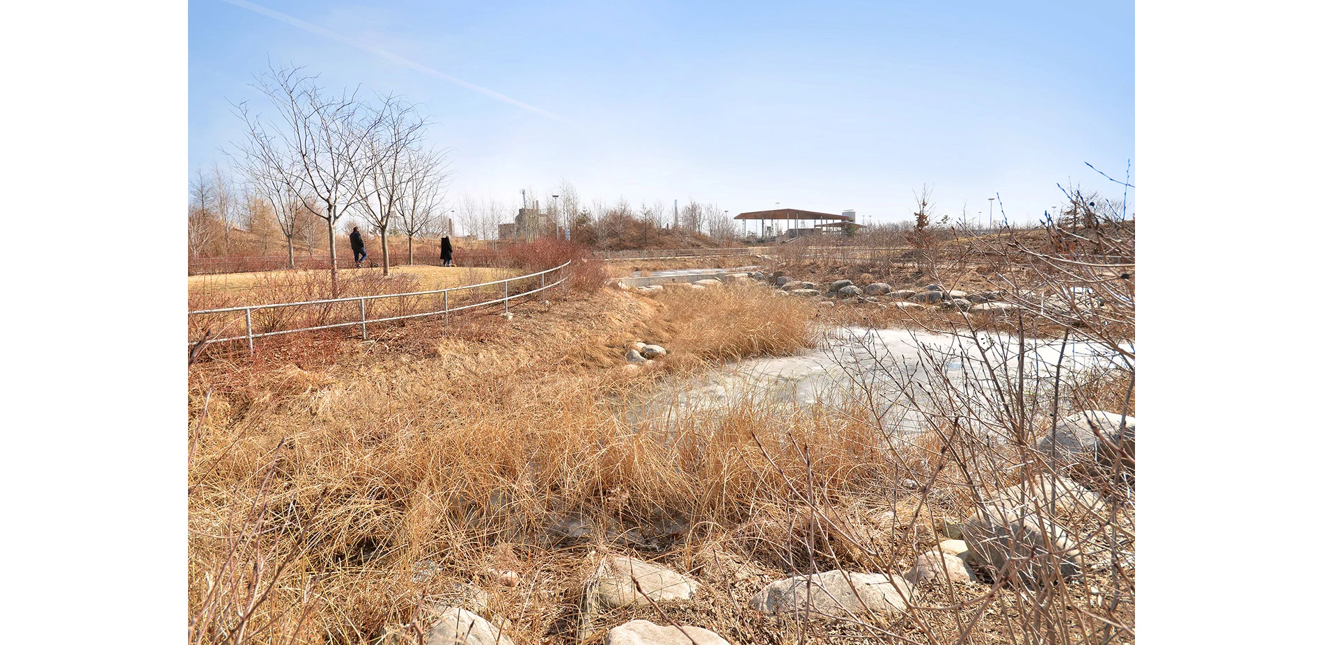 On the flood-protected side, a central lawn demarcates a separation between passive recreation (enjoying the constructed nature) and active (e.g., using a playground). Year round, there are opportunities for children and adults of all ages to enjoy the outdoors. A pavilion with a fireplace provides shelter and warmth in the coldest months. Densely planted perennials attract an array of butterflies and other pollinators in the spring and summer. The park also transforms unappealing industrial views—of the infrastructure-heavy corridor adjacent to the Don River, with its rail yards, high-tension lines, and Don Valley Parkway—into an engaging spectacle because this corridor is now being observed from high, detached vantage points.
