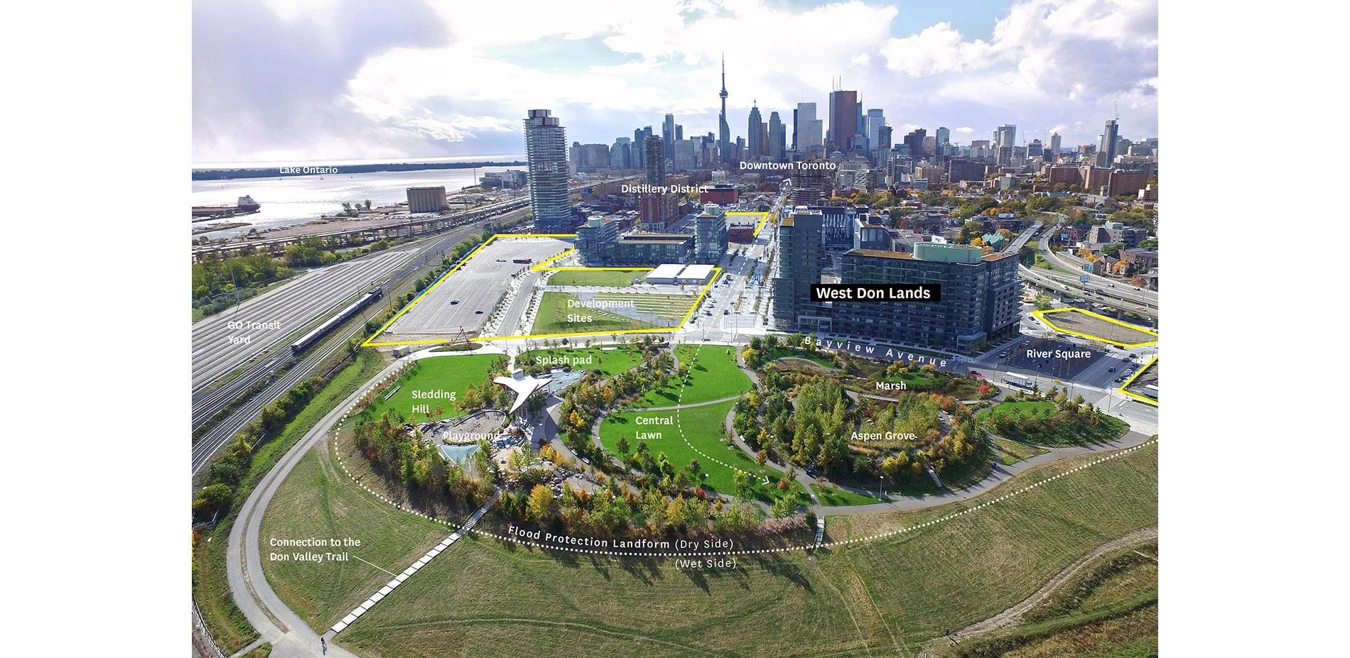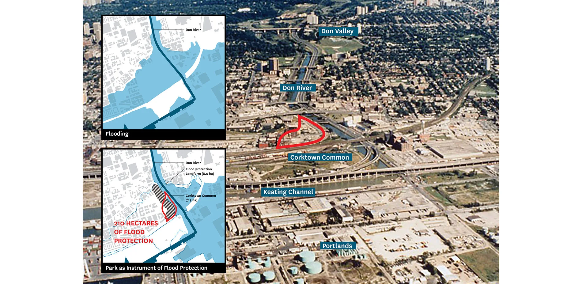 The park’s site is a relic of Toronto’s industrial past. As happened in other major Western cities, Toronto’s industrial production had faded by the late 20th century, and what was left at the future site of Corktown Common was a brownfield in desperate need of remediation. The site was hazardously exposed to Don River flooding, threatening to infiltrate up to 519 acres (210 hectares) of Toronto.
