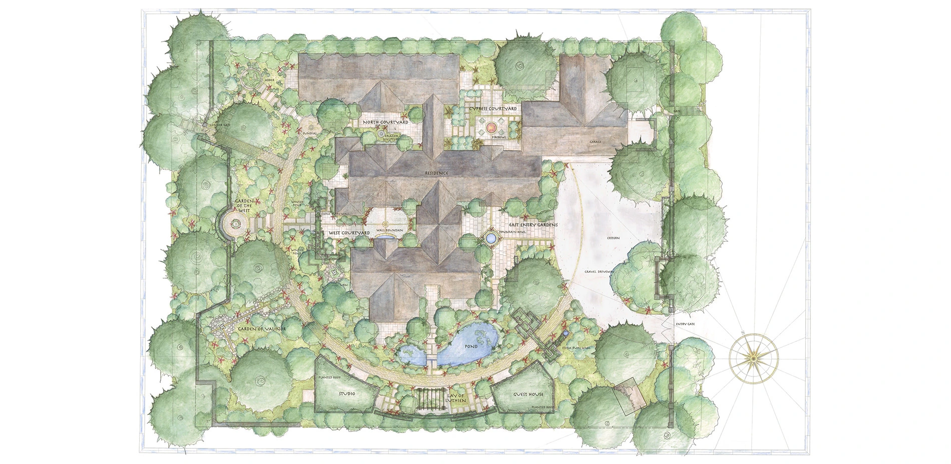 The garden features a robust water catchment system, planted roofs and the Mirror of Galadriel. Native plantings and quail habitat rest at the feet of deities. Ruin walls emerge from overflow winter ponds.