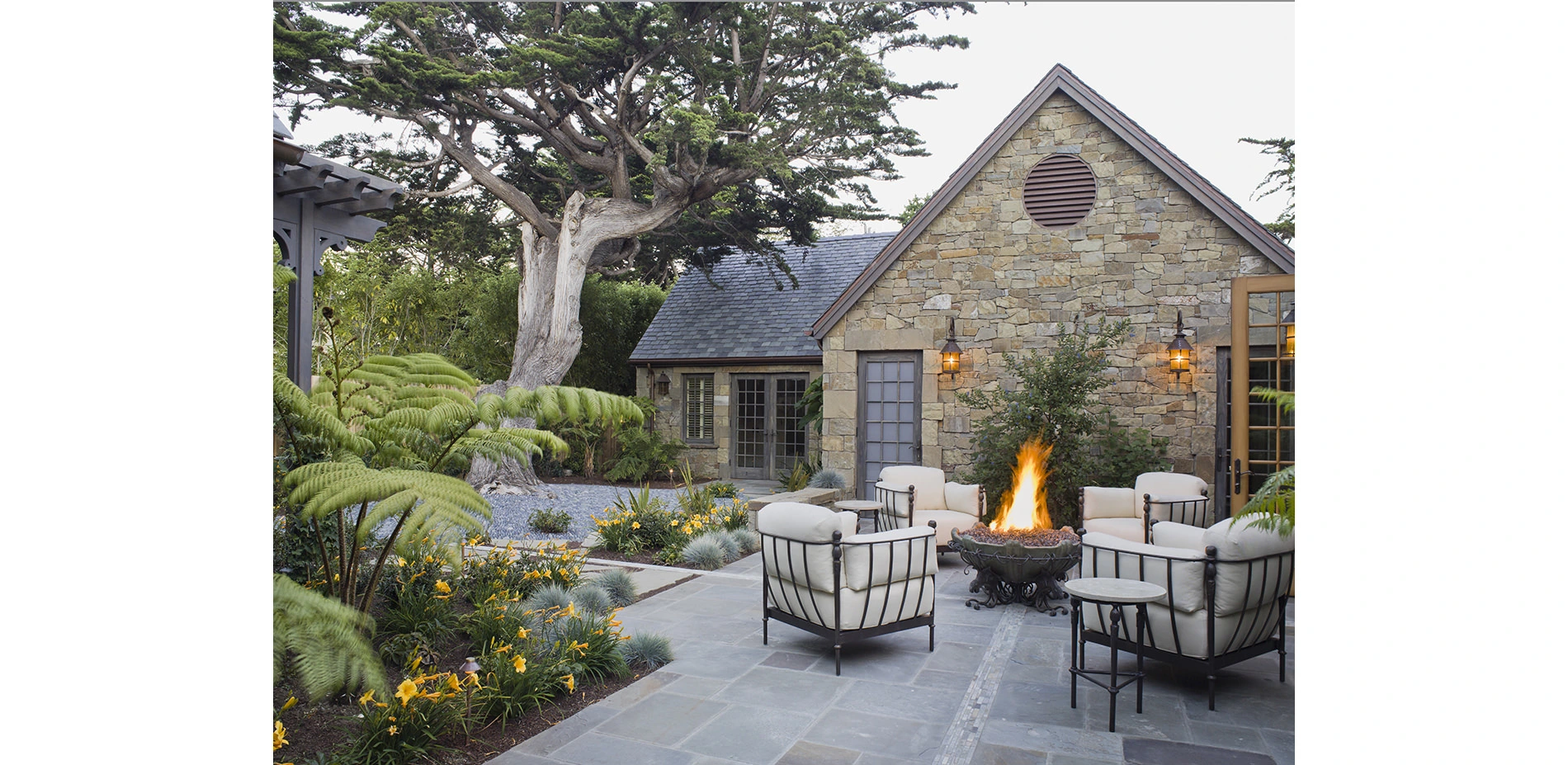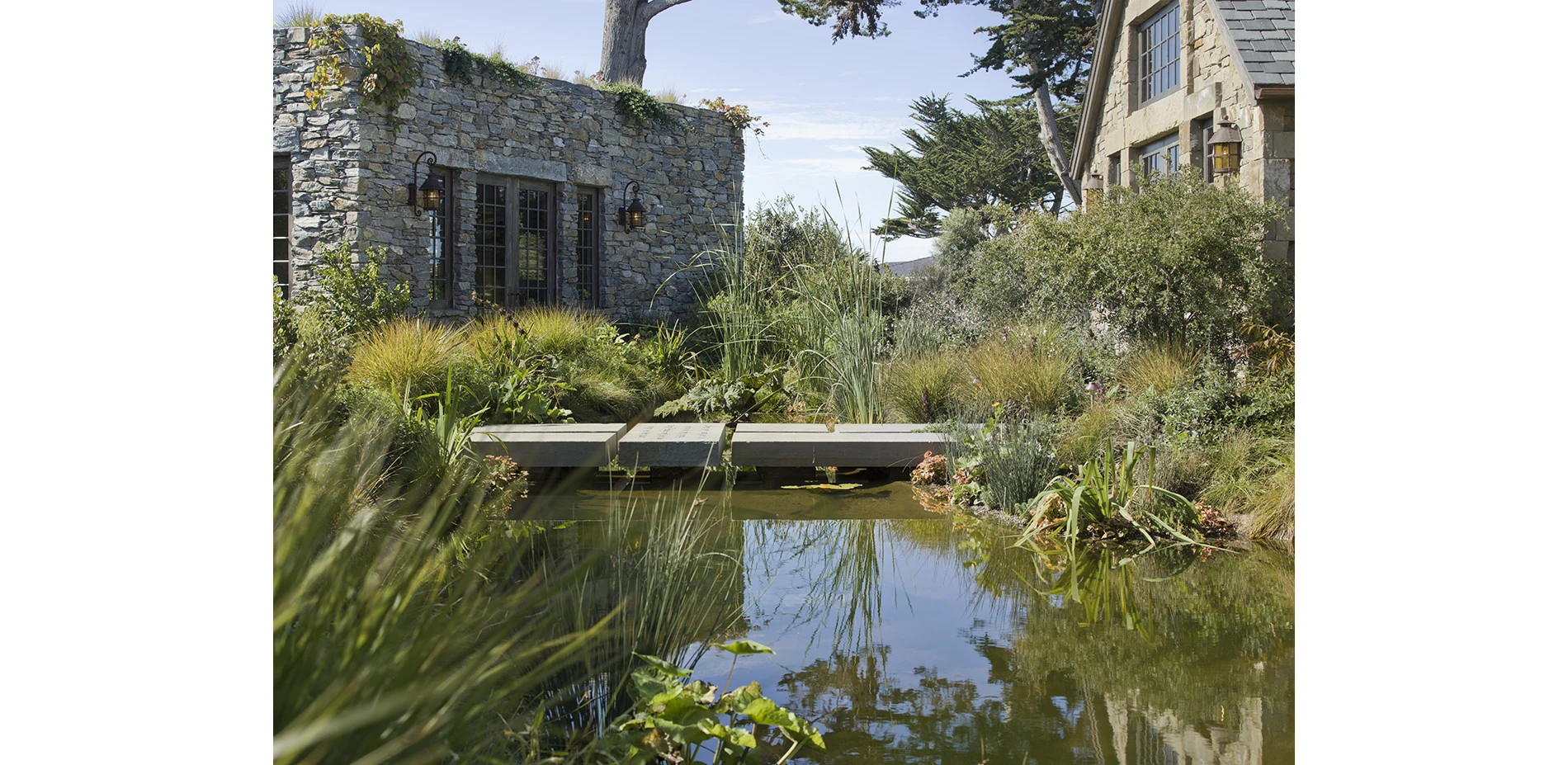 This is a coastal site and subject to punishing, salt laden winds and a thick, ethereal fog. The ¾ acre site is nearly level, the soil is sand and the site receives an average of only 19” of rain a year. Water management was integral to the design of the project. The site’s greatest natural feature is the historic Monterey Cypress, which ring the perimeter.
