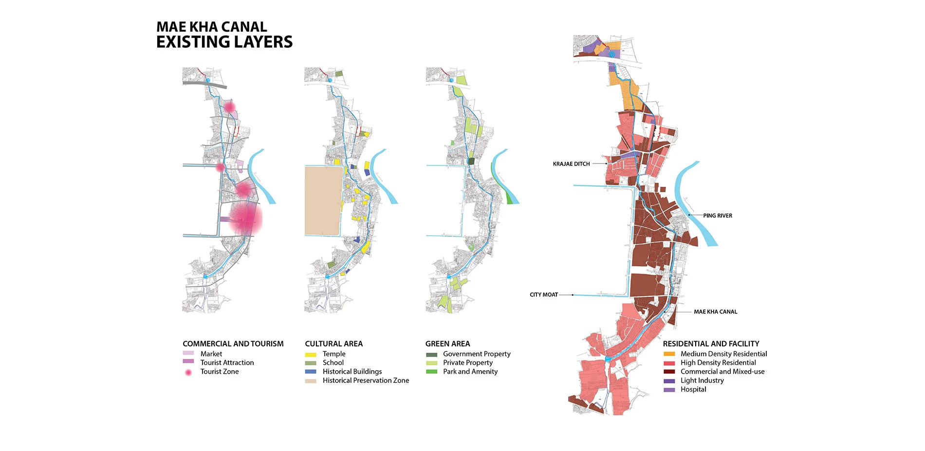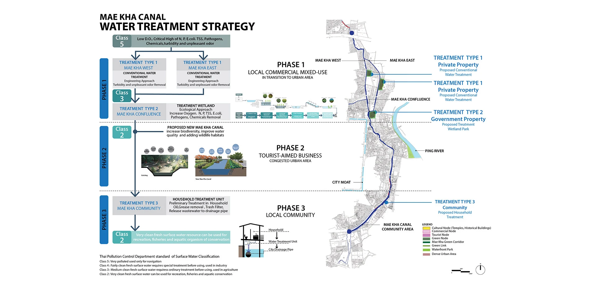 Prior to a design phase, the city, land use planning, water system, and the canal were examined from document analysis, site observation, and interview. According to document analysis, there two main urgent problems of Mae Kha Canal: water quality and lack of management. Water quality data from Chiang Mai University illustrates that the canal starts to be heavily polluted at the highway and getting worse as it flows south. Thus, the studied area focuses on the three-mile canal that runs through the urban area. In this area, the water is classified as type 5 which can only be used for navigation. After the site has been defined, the context, regulation, and existing conditions have been studied. The existing land use determines 3 design phases: local commercial mixed use to the north, tourist aimed business in the center, and local community to the south. In each phases, this study proposes to develop commercial nodes and park nodes that respond to local activities and property rights.