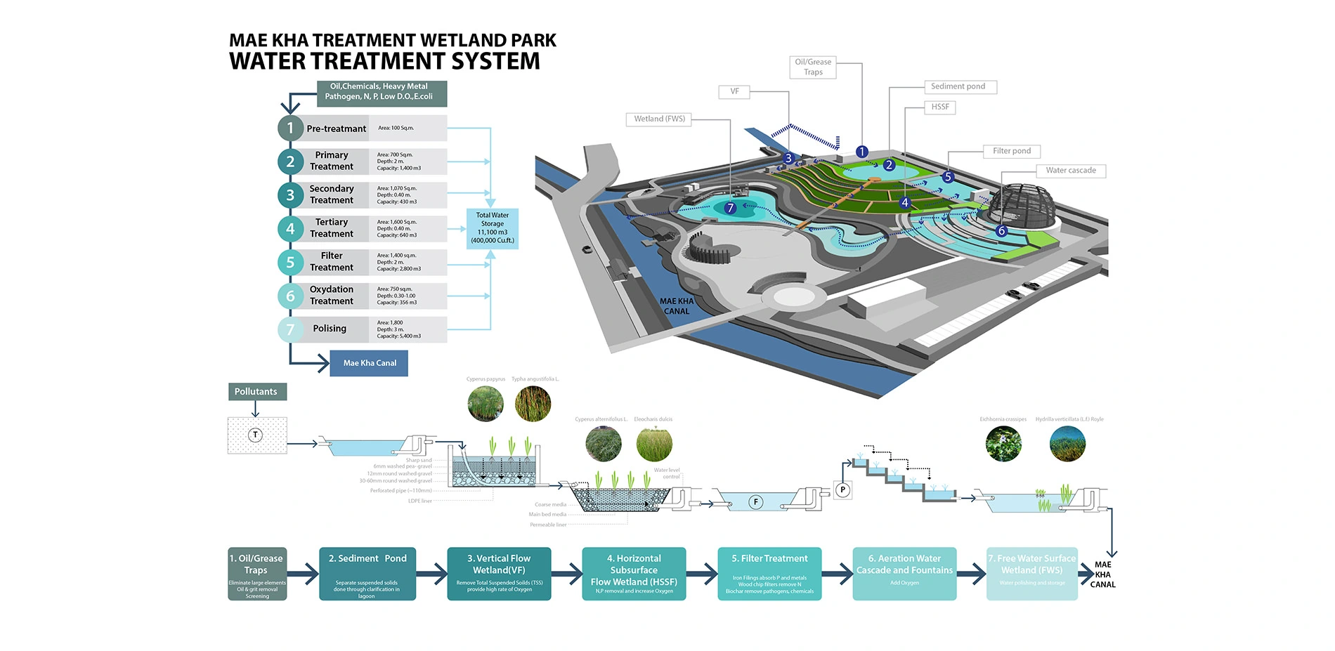 To help mitigate the issue of water pollution, this project focuses on Mae Kha Canal, the most degraded urban canal in the North, with the aim of creating a sustainable future for the degraded urban canal. It aims to promote ecological and sustainable approach in improving water quality in Mae Kha Canal. In an urban scale, it suggests a Green Corridor along the canal where people can interact with nature and enjoy recreation spaces. it intends to promote a stewardship program that encourages participation of communities, government, organizations, stakeholders and private sectors in coordination to Mae Kha Canal development. In a site scale, it proposes a landscape infrastructure of an urban wetland park in the North of Thailand that integrates ecological processes and recreation spaces. As a pilot project of wetland water treatment, the infrastructure will demonstrate and help educate people to learn how to purify water by using ecological methods and the benefits of long- term maintenance and development. Moreover it will articulate Mae Kha Canal’s historical significance and culturally rich in order to encourage a sense of preservation and respect.