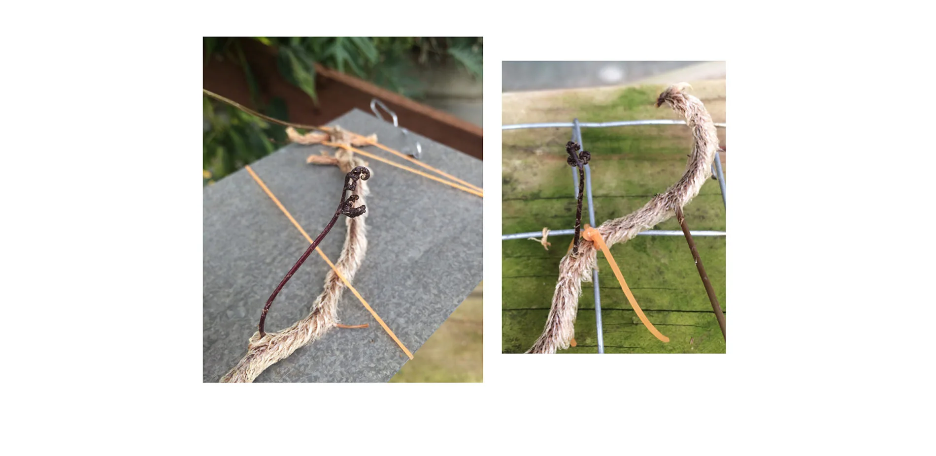 The experiment will test the ability of Rabbit’s foot fern, Davallia fejeensis, to grow while attached to a variety of surfaces: cork oak bark, rebar, galvanized sheet steel, steel wire, PVC-coated wire, welded wire fencing, window screen, redwood, and brick. Growth will be defined as any increases in roots, new leaves, etc., of the plant while rubber-banded to surfaces. There are two fern cuttings attached to each surface. One trial will attach a cutting with some moss, a common practice in the propagation of many epiphytic plants onto surfaces, for the sake of increased humidity, and one trial will be attached without moss. In this experiment, the success of epiphyte establishment, measured by observed growth, would provide evidence supporting the use of epiphytic plants along with the surfaces’ ablility to host them within the landscape.