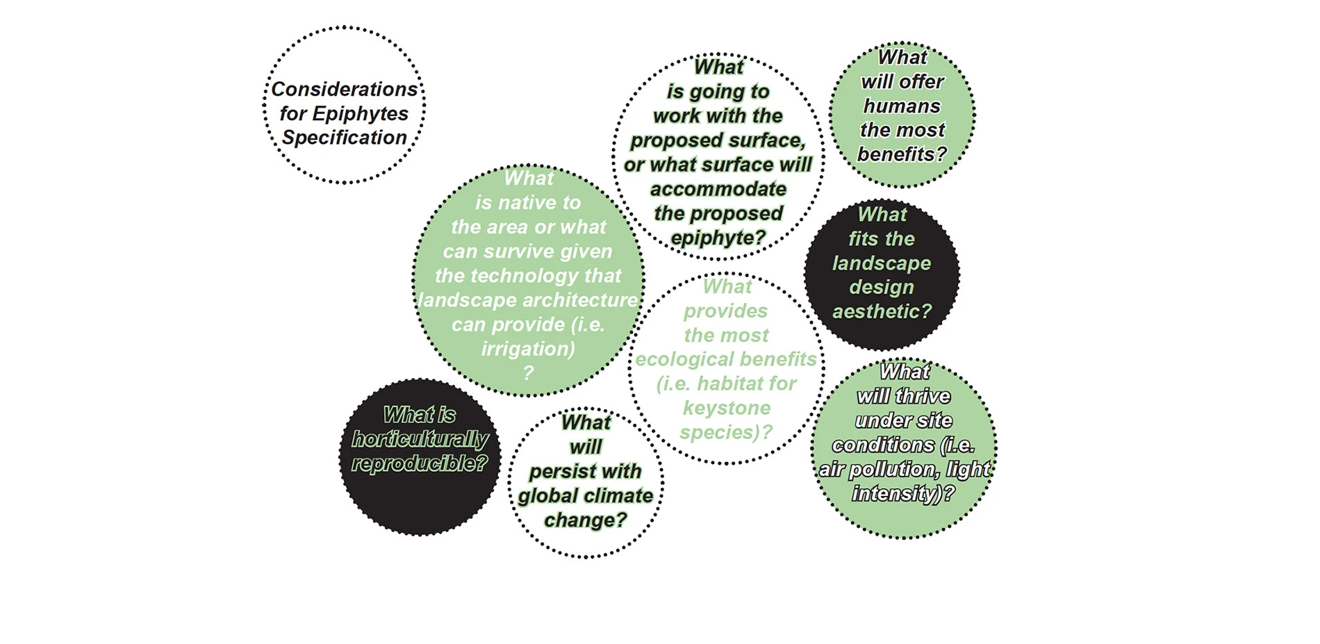 A study relating native epiphytic plants to urban areas in Singapore reveals the “viability of urban areas as repositories for biodiversity” (Izzuddin 2015). As climate changes and natural environments decline, urban areas become important to the maintenance of biodiversity. Similarly, to a botanical garden which preserves a biodiverse selection of plants, designed and maintained urban landscapes are opportunities for species preservation. An understanding of epiphyte ecology by landscape architects is necessary for the advancement of their contextualization within the design process.