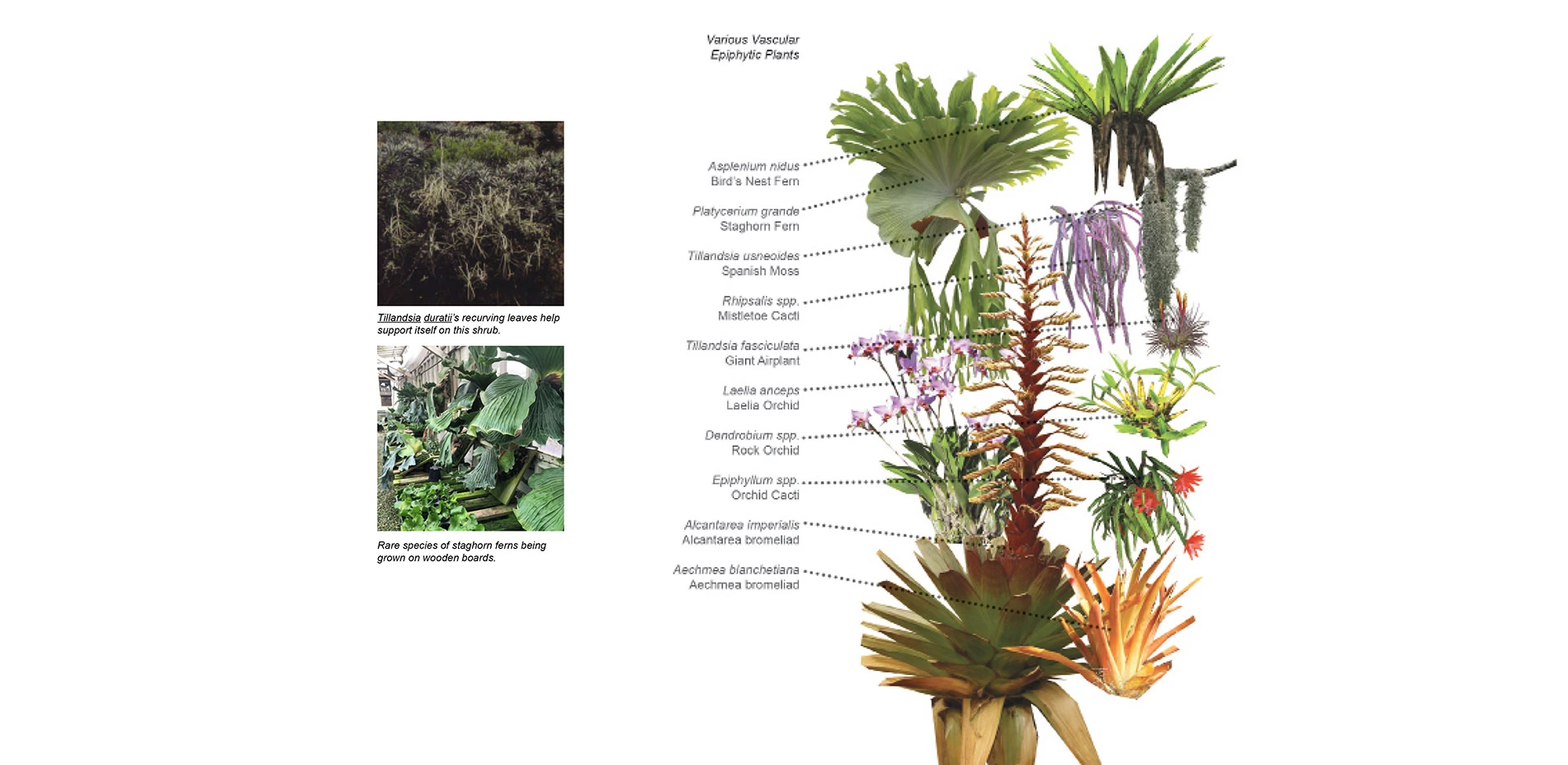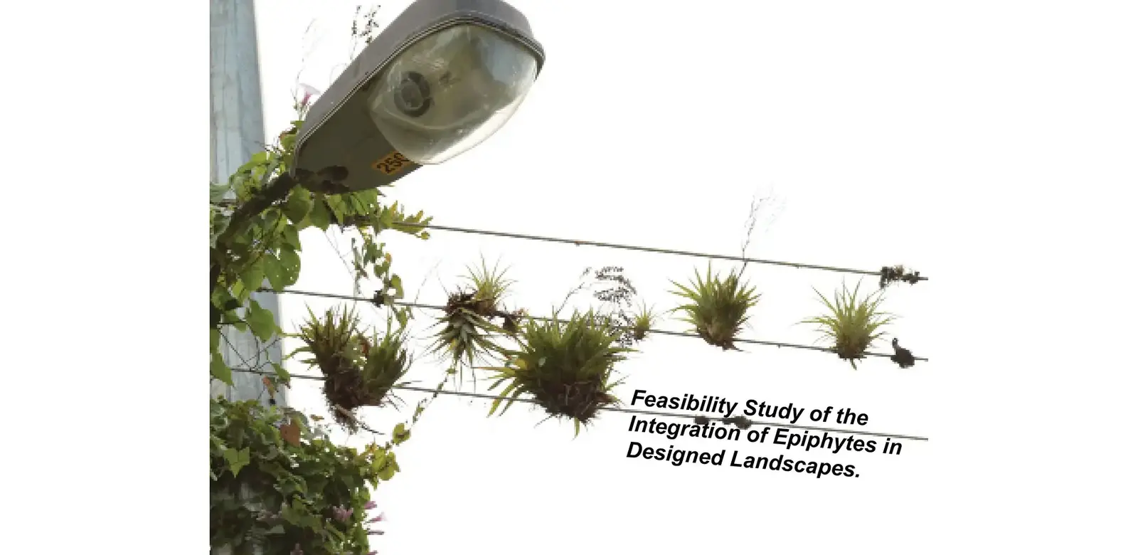 Epiphytes are a unique life form, which naturally thrives in an aerial environment, typically on the bark of trees (the natural hosts of epiphytes), yet can adapt to the necessary forms of human infrastructure. Work by Patrick Weygoldt, captures an instance where human infrastructure, in the form of telephone wires, hosts epiphytic plants, providing evidence for their potential inclusion in the built environment. The notable Oyster-tecture project, organized by SCAPE Landscape Architecture PLLC., challenged the “domain of landscape design” when it envisioned a polluted canal as “seedling ground” for an oyster reef (Orff 2015). As the Oyster-tecture project redirected our focus from land to sea, this project’s redirection, from land to air, is of similar nature. Like oysters encrusting surfaces within marine environments, epiphytes encrust surfaces within aerial environments. They are capable of this because, in their natural habitats, epiphytes obtain “all essential elements and water from the air” (Shacklette 1973). This unique ability offers great potential for landscape architects as they design areas where soil or soil-like media have limited spatial footprints. The best way to harness the qualities of epiphytic plants is their utilization in designed landscapes.