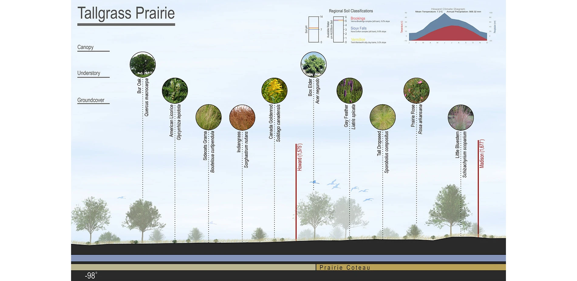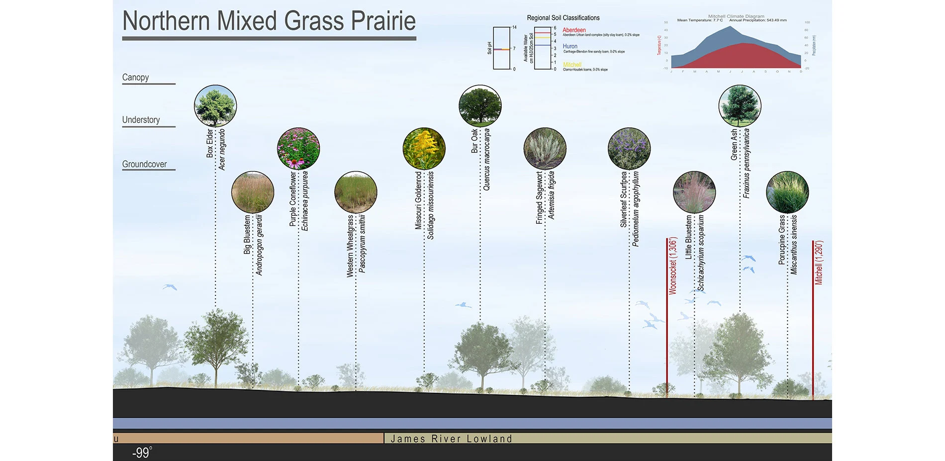 As such, the students developed a simple framework to illustrate the relationship between climate, temperature, precipitation, soil substrate, and water holding capacity and the plant material present in a given location. For that framework, the students chose to strike a line through the 44th parallel and develop a section through the state of South Dakota. This division holds particular resonance by the fact that the state is almost perfectly situated in the middle of the Continental United States, the state itself is divided in half by the Missouri River and the students then chose to divide the state in half horizontally along the 44th parallel.