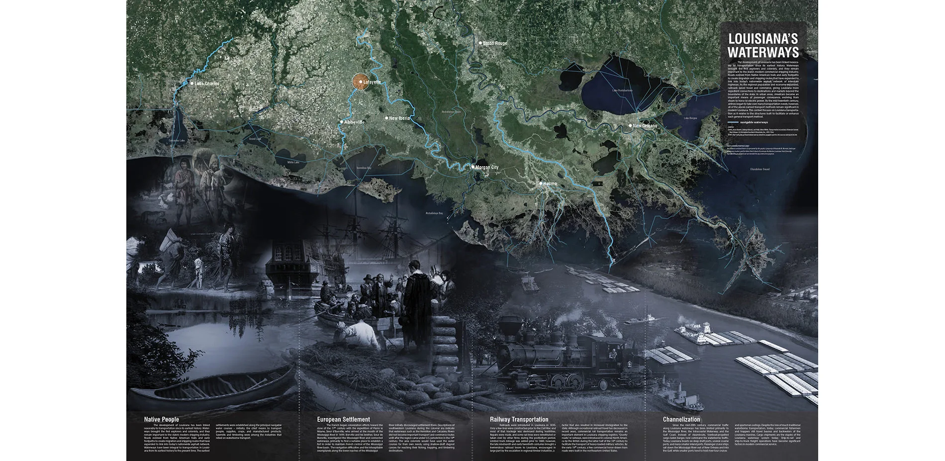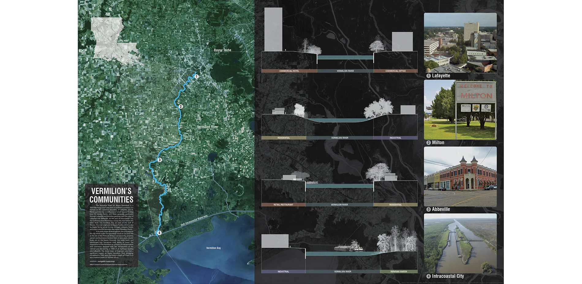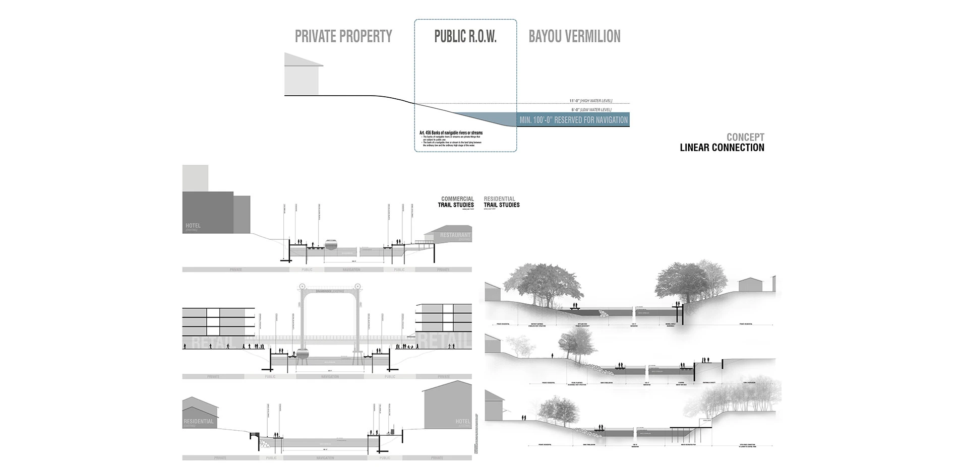 This project, located in Lafayette, Louisiana, aims to establish a connection among open spaces along Bayou Vermilion in order to enhance its use as a cultural, economic, ecological, and open space amenity. Like many other small communities in Louisiana and elsewhere, Lafayette turned its back on the waterway that facilitated the area’s original settlement. Much of the land along the bayou is privately owned and residential, with public access limited to a few critical points; at which, this project proposes a transit hub, a mixed-use center, and connections to existing public recreation and open spaces. To reinforce these new uses, a trail will connect several destinations by utilizing land on the banks of Bayou Vermilion adjacent to existing residential properties. The intent of this project is to create public access to Lafayette’s historic and scenic Bayou Vermilion, thereby enabling local residents access to the Bayou’s unique cultural, ecological, and open space potential. In addition, this project can provide a model for similar waterfront access for other Louisiana communities that share similar conditions.