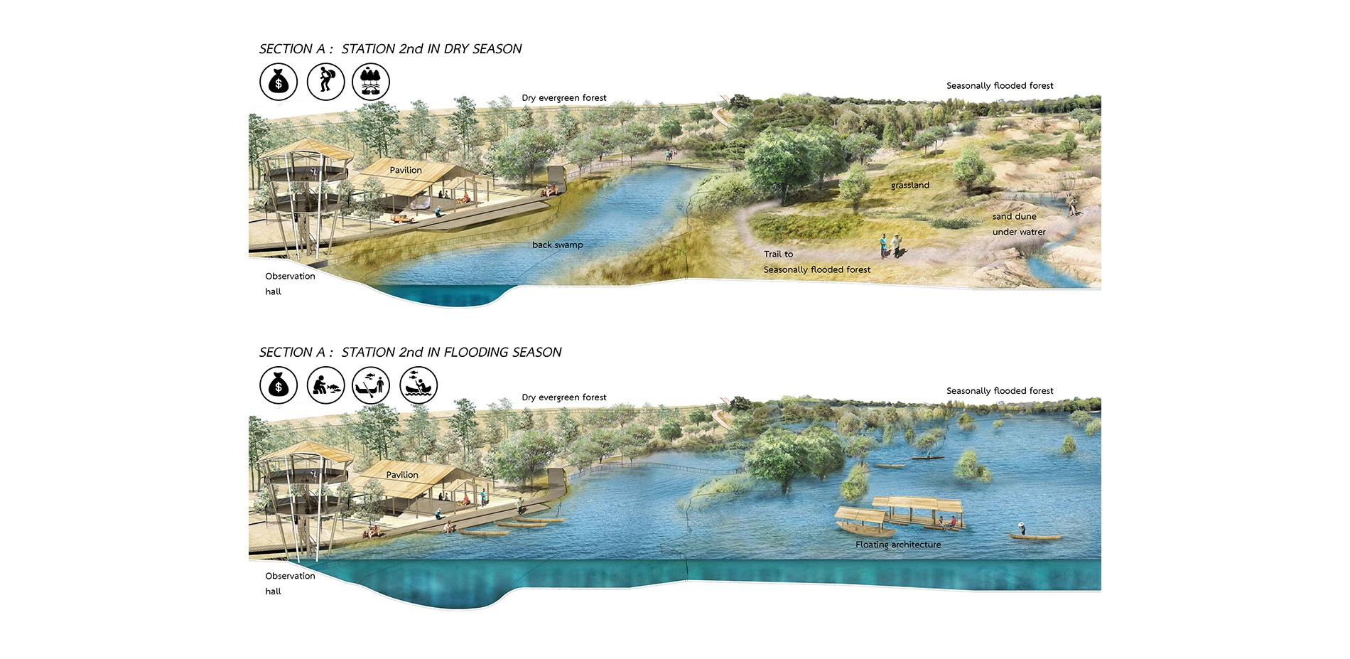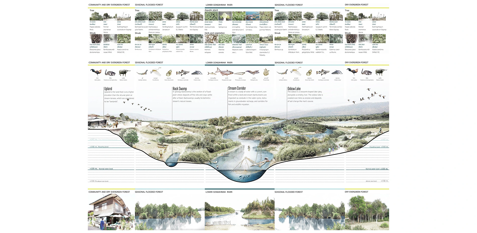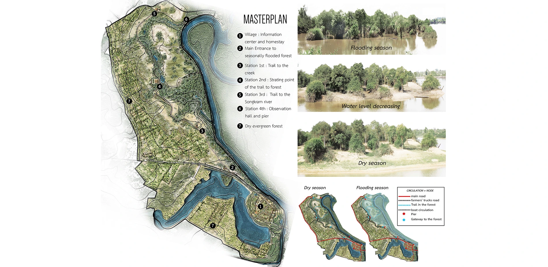 It is divided into 5 main sections which are the knowledge and reclamation center, ecological forestry, homestay area, community's public space and agricultural farm(which has been adapted to suit the basin's context). The planning and designing concept focuses on the flexibility and dynamic of the ecosystem in both rainy and drought seasons. To successfully design the project, it is essentially needed to understand the details of natural process in Songkram basin and other related knowledge in various fields to be integrated into the planning method that could practically reciprocate to both development and conservation at the same time.