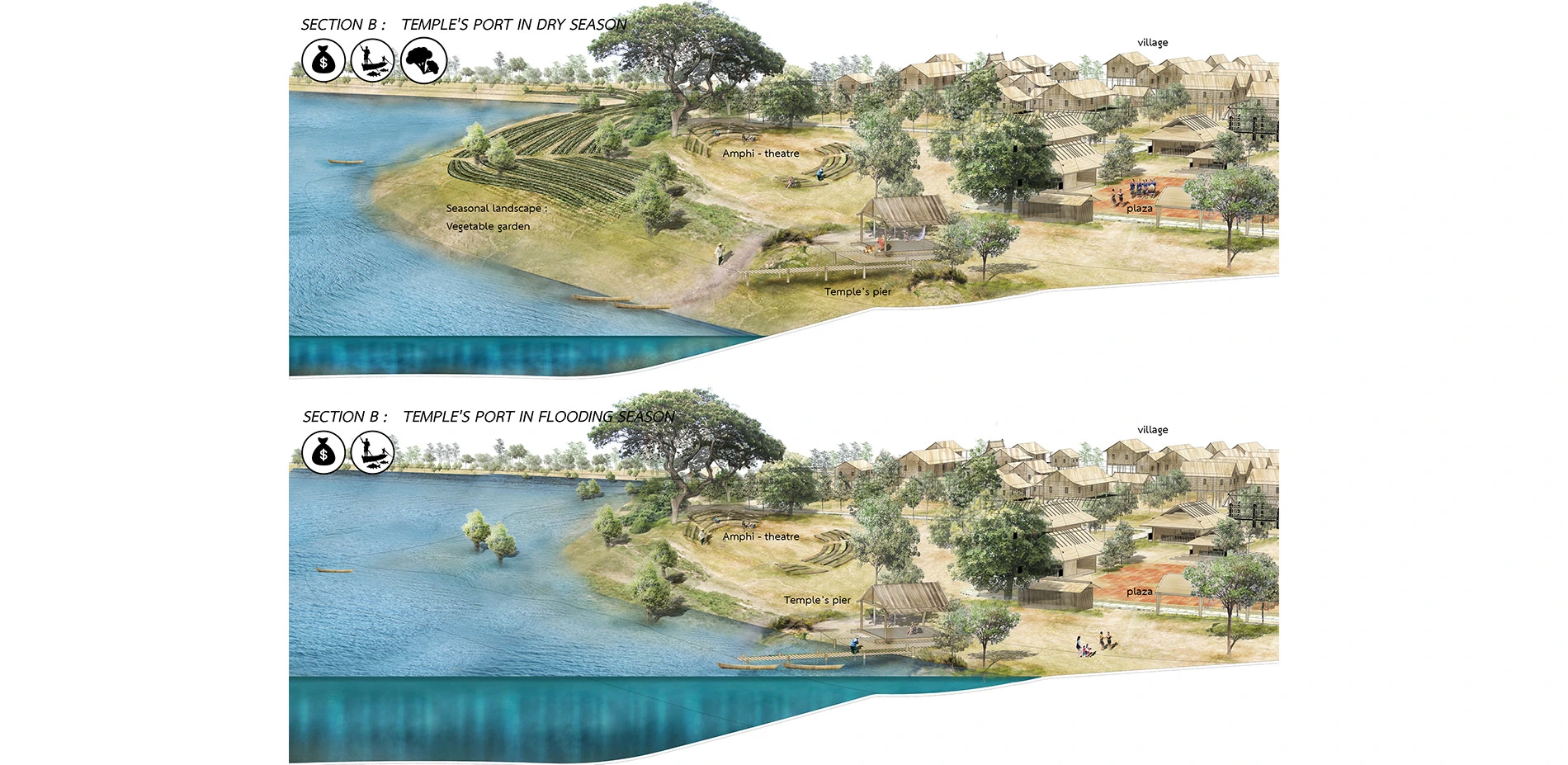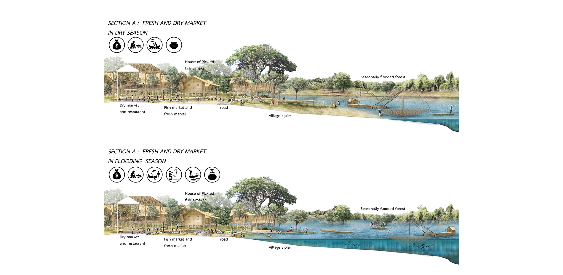 Developing a better Quality of Life is implemented by establishing new infrastructure to support social, economic, ecological spaces and socio-cultural spaces. Social space, four of the stations in Seasonally Flooded Forest are gateway between human and nature which is both welcoming area and recreational area for villagers and visitors. Ecological space, connection between human and their Seasonally Flooded Forest (Community Forest) is created by road from village to forest. Economic space, Fresh and Dry market, Village’s port, Plaza and Amphitheatre is created to be the gathering space and node. Lastly, socio-cultural spaces, created traditional plaza and temple’s port.