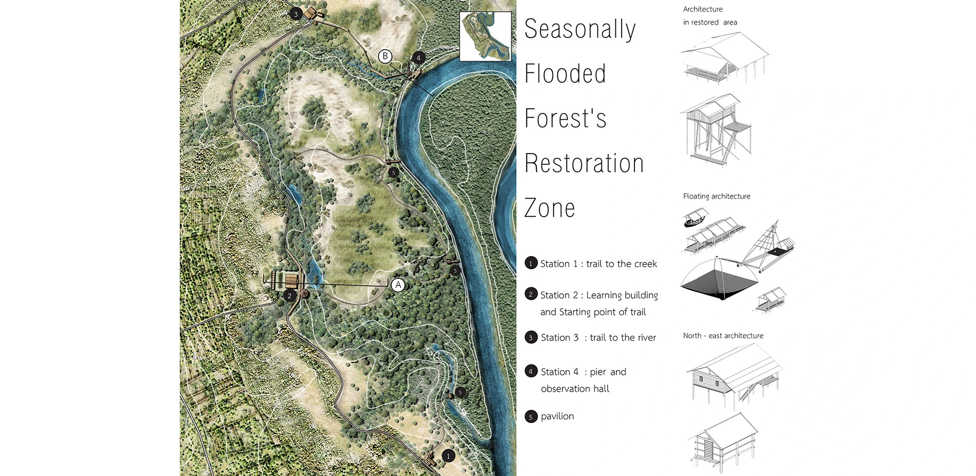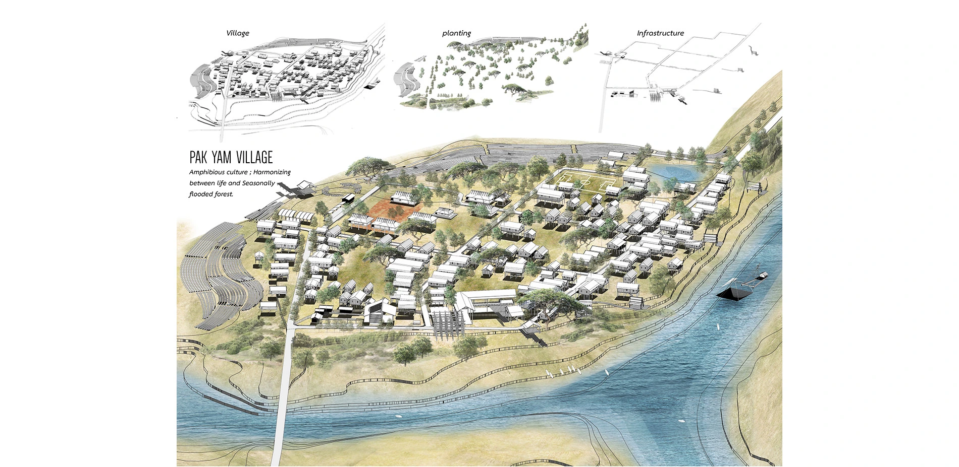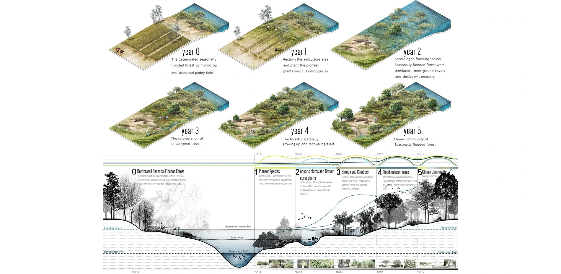 Located in Nakhon Phanom province, northeast of Thailand, this proposal aims to reclaim and preserve Seasonally Flooded Forest that was trespassed and destroyed by charcoal industry and industrial agriculture since 1965. By restoring and conserving the seasonal flooded forest in area of Pak Yam village, a rural landscape is proposed to relink human to seasonally flooded forest which was harmonized between life and nature, to create the space for better quality of life and become Nakorn Panom's provincial tourist attraction, in terms of ecology and cultural landscape. Understanding this dynamic landscape that benefits positive effects toward human beings, Ecological Gateway to seasonally flooded forest, educational space between interface of seasonally flooded forest and Dry evergreen forest have been proposed to the area. Through analysis on seasonally flooded area, landscape character, vegetation, annually activities and site potential, adaptable design is the key for living on this area and symbolizing the awareness to other people.