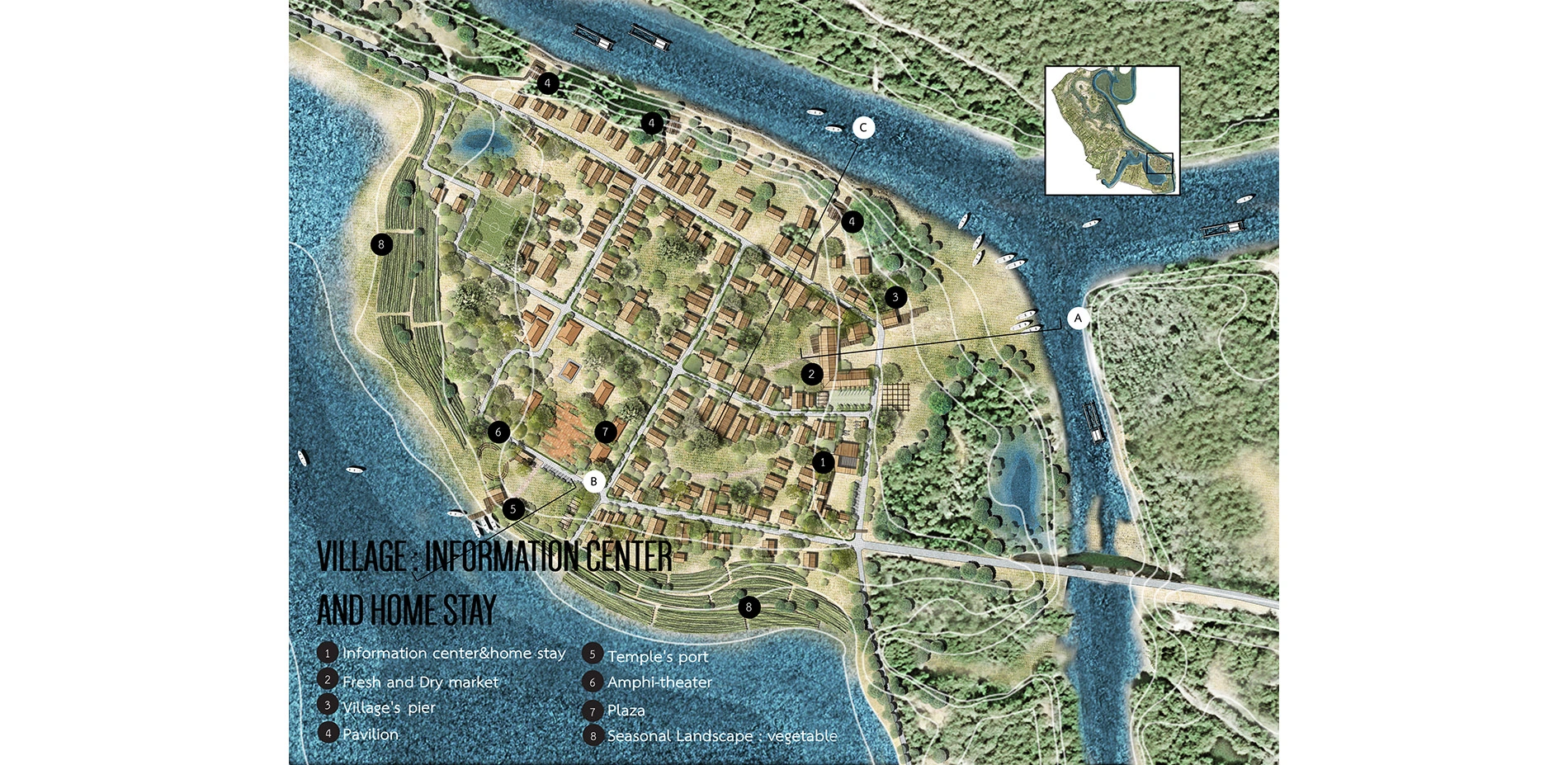 Helping the basin's learning and tourism aspects by adding a village's public relation, a parking lot, a homestay and a pier node, a circulation path using farmers' trucks and boats as the vehicles, a Basin restaurant and fish market for tourists.