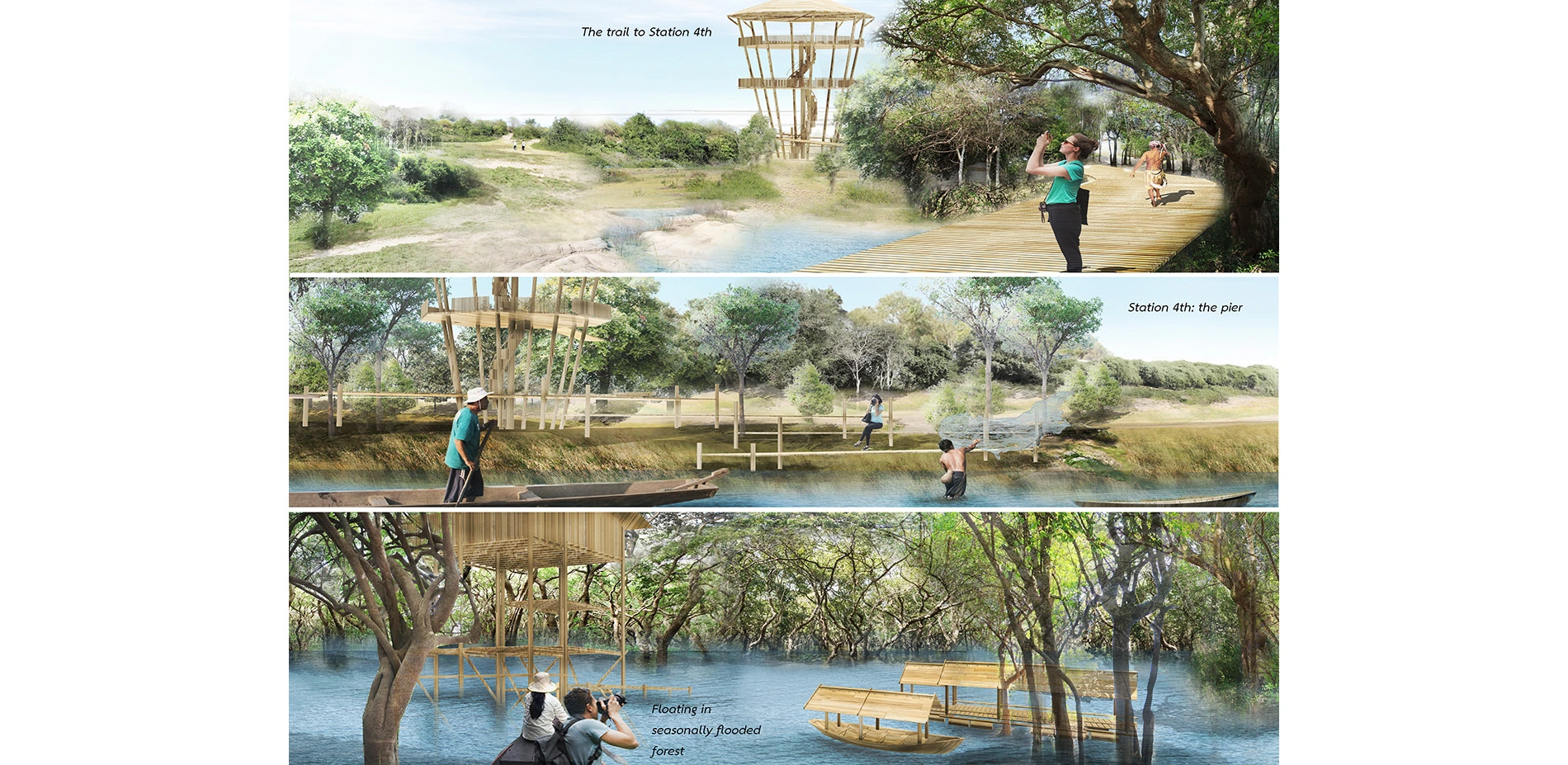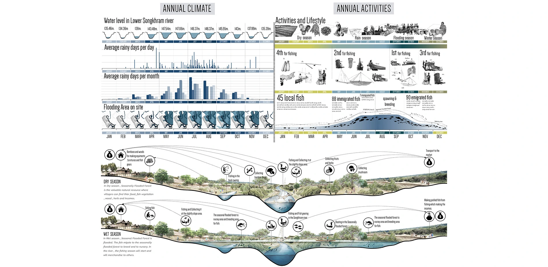 The ecology plays an important role in the design phase, especially the climates that cause an annual seasonal immerse flood. This dynamic landscape forces the design to be flexible in both dry and wet seasons. The design intensively focuses on the joint between the basin and dry evergreen forest (the joint between wet and dry spaces). Lastly, the project's infrastructure must comply the existing environment, which is all rural context. Reclaiming and preserving the basin to constantly be Humans' food resource and Mekong's aquatic nursery, by separating reclamation and preserving areas, providing a learning building and ecological trail. Moreover, three different reclamation methods have been applied into the design.