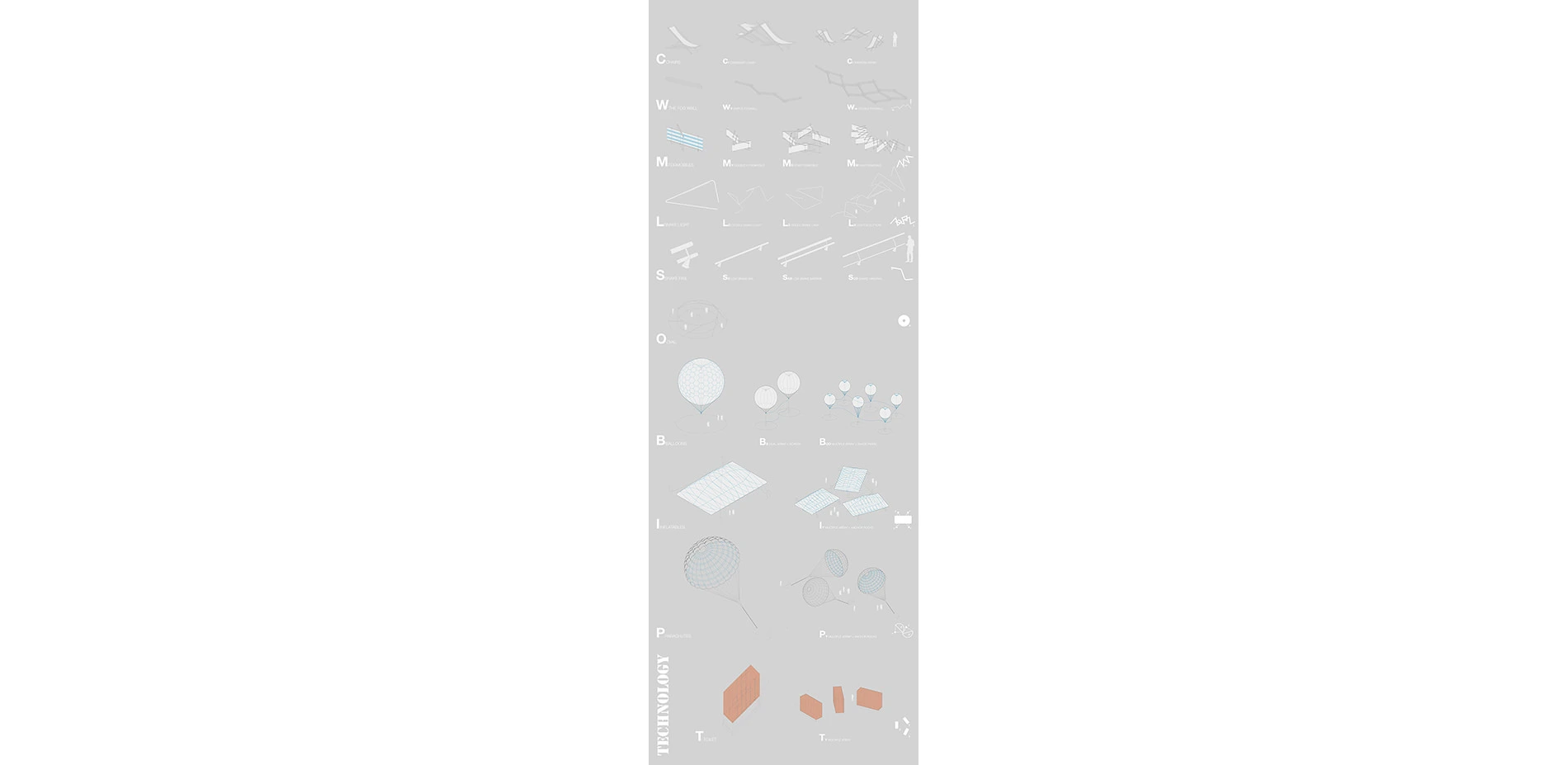 2. TECHNOLOGY: The technological component of Fogfest starts from the creation of a series of devices that evolve from the idea of the deck chair as an artifact that can create pop-up space. After a series of modifications, the adaptability of 'pair of scissors' type structures is taken further to develop retaining walls that can adapt to different road geometries, and also a fog collection device called "The Fogmobile." This artifact would have a protagonic role during the festival, being able to be deployed on site to collect fogwater, and then folded, attached to a car, and pulled as a trailer to a different site. On the other hand, there's a series of structures that develop on the idea of 'the line' as an element that can create space by bending, but that can also provide structure for the festival's participants to attach their devices (balloons, inflatables, fabrics, mesh, etc). The Snake rail creates a simple roadbarrier with 3 different adaptations to create a linear bench, a double roadbarrier, and a simple handrail. On the same line, are the Light Sculpture and the Oval, two elements that are pecifically designed to become anchor structures for inflatable / planar mesh devices. These linear elements after the festival is over, will continue to provide spatial structure and character to the outlook points of Highway 1. As the festival takes place mostly over night and early morning, light will become a crucial element to work with. The Light Chamber (toilettes) and the Light Sculpture will act as lighthouses, creating reference points that will provide the participants with the sense of distance and the amount of fog coverage during the night. All of the other elements like balloons, inflatables, parachutes, fabric fogcollectors, etc, should be brought to the Festival by the participants. These open source piece of the Festival is what will provide dynamism to the landscape, transforming Highway 1 into a landscape of the unexpected, a space open for new relations between human beings and the air.