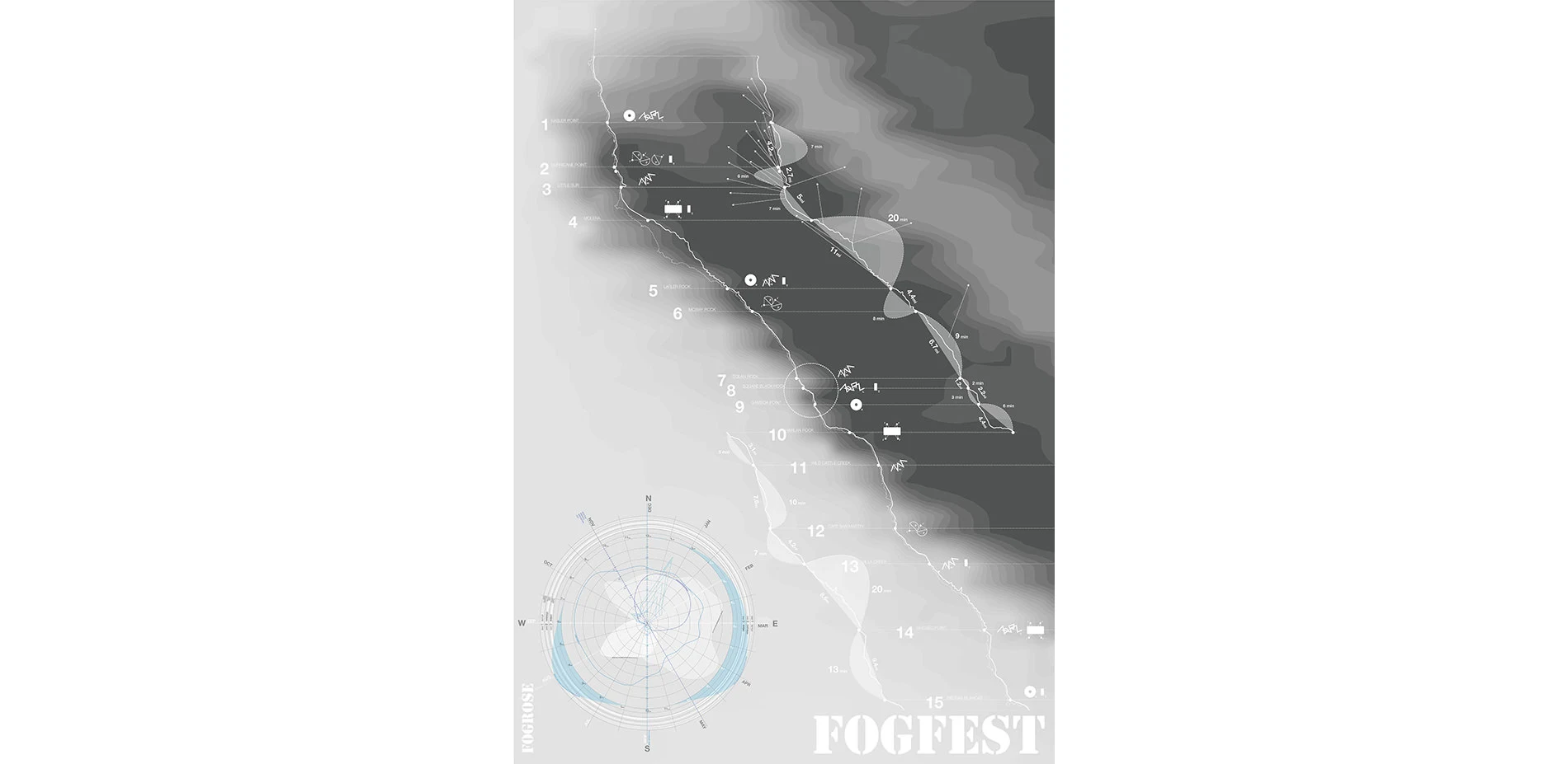1. FOG: Fogfest is obviously a festival about collecting water from the clouds, however collecting fogwater is anything but obvious. This needs careful schedulling, because fog is not always present on Highway 1 throughout the year, and also there is a specific time during the day where the chances of collecting fog water are higher. This is why I developed a 'Fogrose,' which as a more complex relative of the windrose, combines data of fog presence during a normal year, with fog collection data in an average day. The best time for the festival is from June to September and the fog shows up usually at night and early morning. The Fogrose not only mandates the time for the festival, but also the Festival's schedule of activities. Fogfest must happen on a weekend during August, with the fog collection starting at 12am and ending at 10am, during the first and second nights. During the day, the participants’ setup their devices and also teach / learn from the other participants. The third day is a party and then wrap up. Fogfest is not only an opportunity to create environmental awareness and learn about our interactions with the atmosphere, but also an opportunity to improve fog collection technology and have fun.