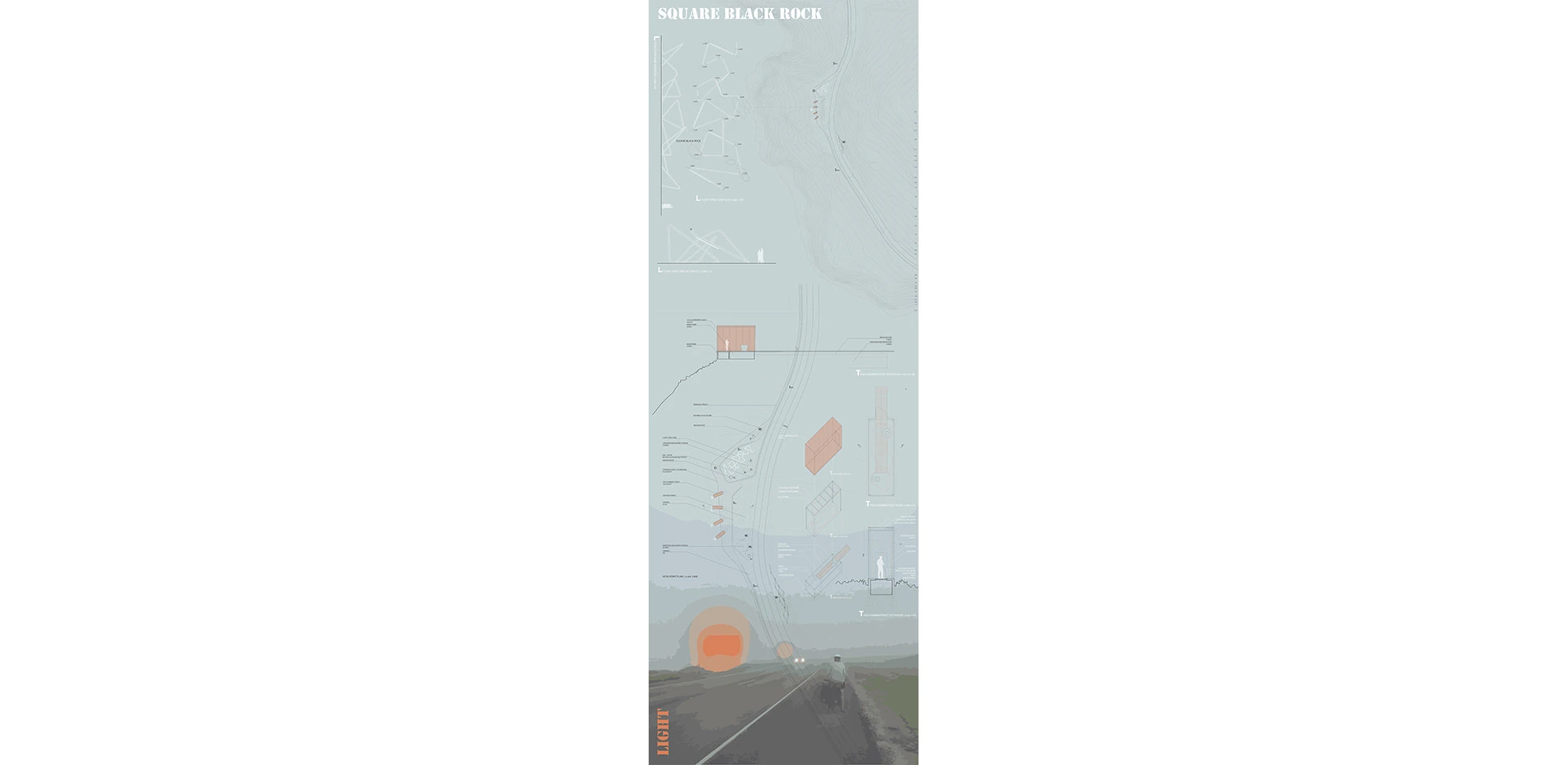 2. Square Black Rock. The Light Sculpture and the Light Chamber. This site is configured by the snake rail to create a main area for the light sculpture on the north side, and also 4 light chamber (toilettes) alog the edge. Each one of these frosted glass wall toilettes is pointed directly to each one of the largest rocks right next to the cliff. The site would become a major reference point during the nights of the festival.