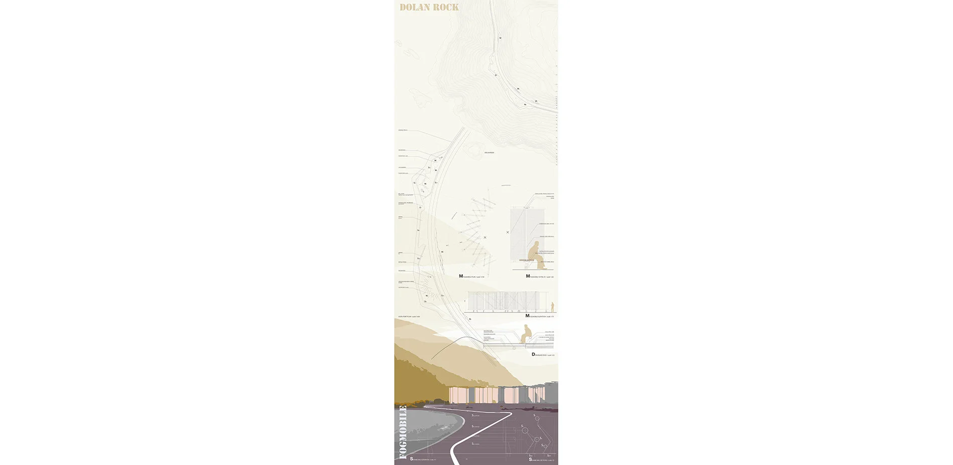 1. Dolan Rock. The Fogmobile: This long site provides two main areas for deploying fog technologies on the extreme sides, configured by bending Snakerail road barriers. At the center, plenty of parking space is provided, and at the edge, the drainage promenade creates space for a long walk along the cliff to contemplate bith the horizon and the Fogmobiles. The fogmobiles would be deployed on the two main asphalt areas to collect water during the festival.