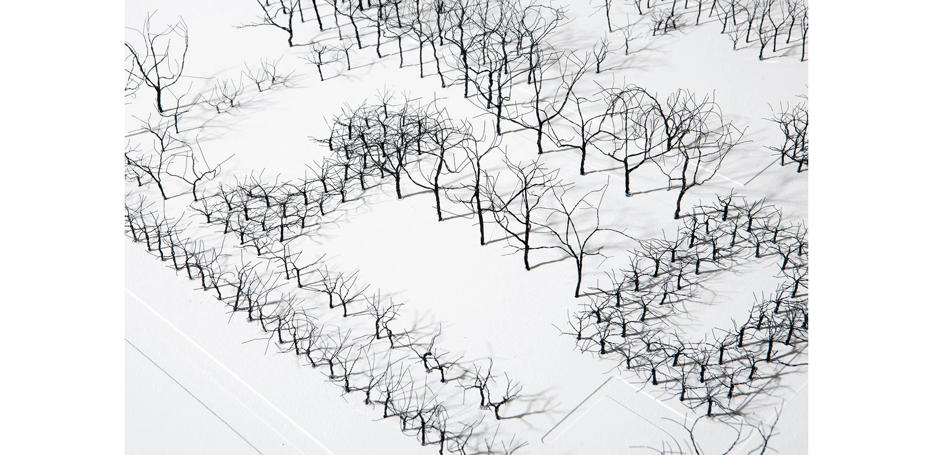 Over 2,000 trees in total were twisted as part of the project that culminated in a formal gallery display including two large scale site models of the Miller Garden, the North Christian Church, each of the five selected typologies, over 20 of Dan Kiley’s projects, and over 30 illustrative series drawings done in black and white.