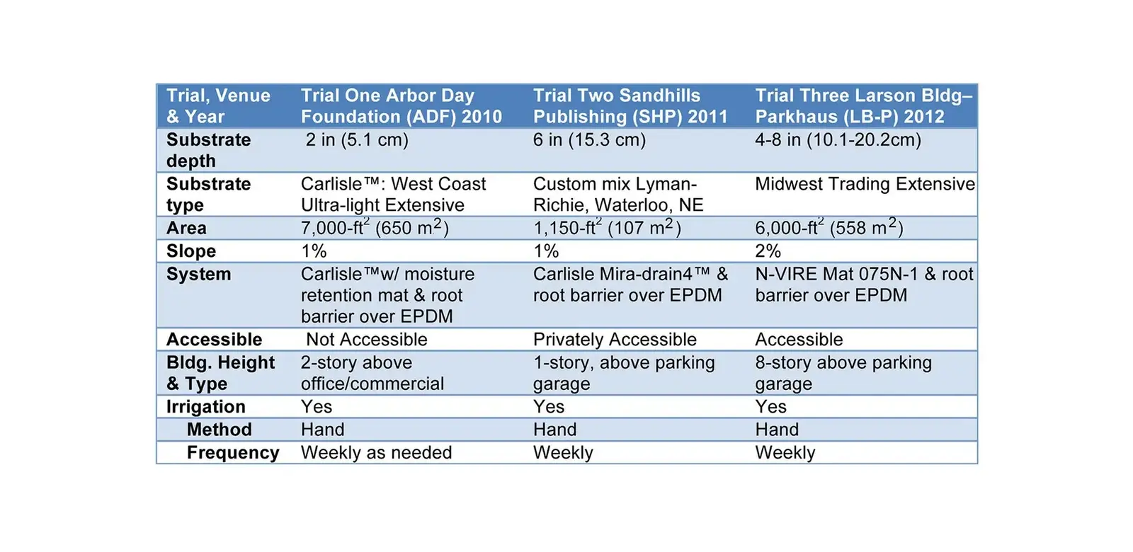 Each green roof venue (Table 1) presented its own unique design circumstances related to the cooperator’s goals, site microclimate, construction specifications, and installation that constrained the timing, relationship, and extent of experimental designs and comparisons (Table 2). The green roofs at Sandhills Publishing (SHP) and the Larson Building-Parkhaus (LB-P) were designed as green roofs which incorporated experimental plots.
