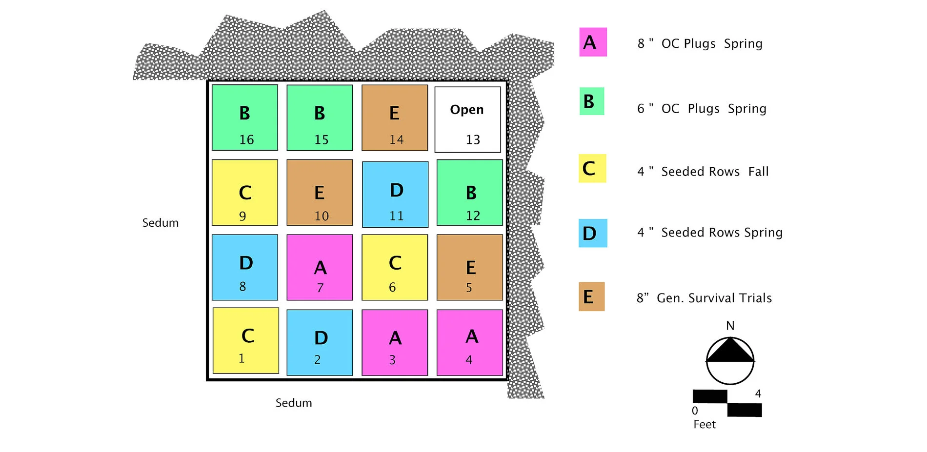 - At LB-P material and labor costs for Sedum 72-plugs planted at 6-inches O.C. were over 6 times greater than seeding ($5.07/sf versus $0.79/sf). Seeding reached 80% coverage in two growing seasons, while Sedum did not.