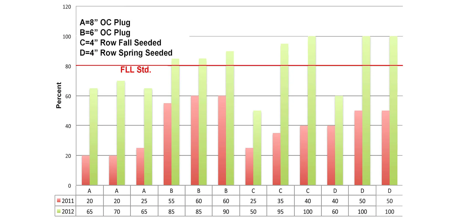 - At ADF 4-inch row seeding regardless of date (Fall 2010 or Spring 2011) met or exceeded the coverage of both 2011, 6-inch and 8-inch spaced plugs by the end of 2012.