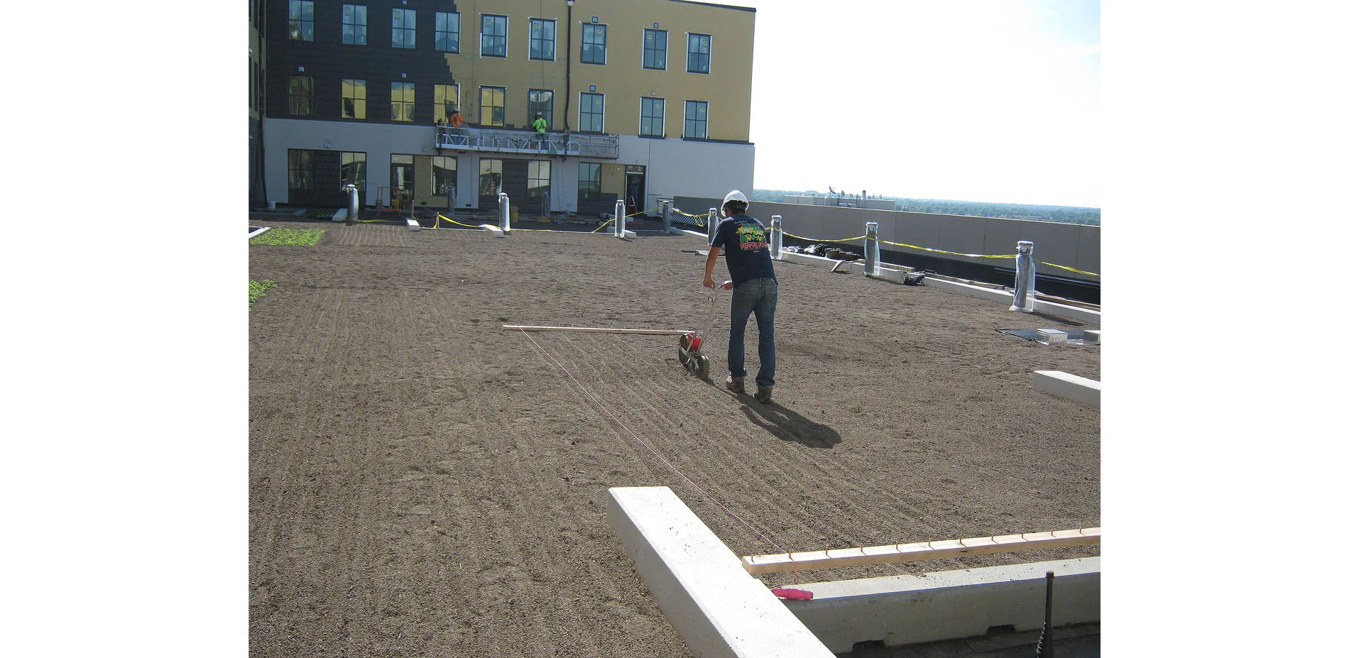 This research investigated methods, techniques, and materials for seeding green roofs to native grasses. Its questions and objectives arose in 2007 when a small green roof planted to plugs of native grasses freely reseeded and during the second year readily filled gaps. That experience led to a series of on-the-roof trials and experiments on 3 different cooperators’ roofs spanning three years. Experiments, observations, and techniques on green roofs helped explore and evaluate a suite of independent variables for planting: 1) season, 2) method and 3) spacing. The dependent variables measured included: 1) plant vigor, 2) visual coverage, and 3) material and labor costs for seeding.